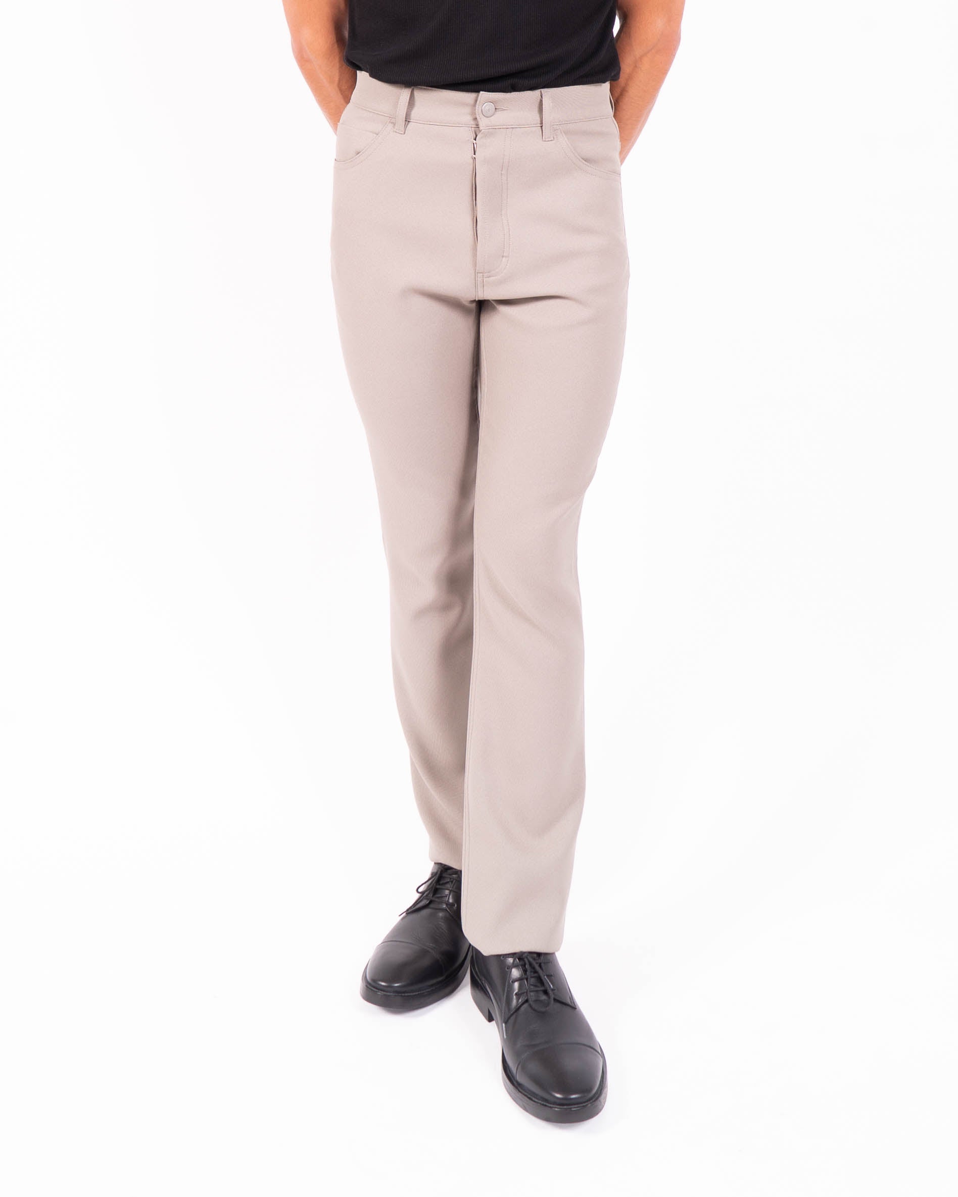 Crafted from beige viscose, the fabric has a soft drape and a muted sheen that emphasizes fluidity. Minimal detailing underscores the precision of the cut, allowing the focus to remain on the line of the leg and the garment’s understated presence.