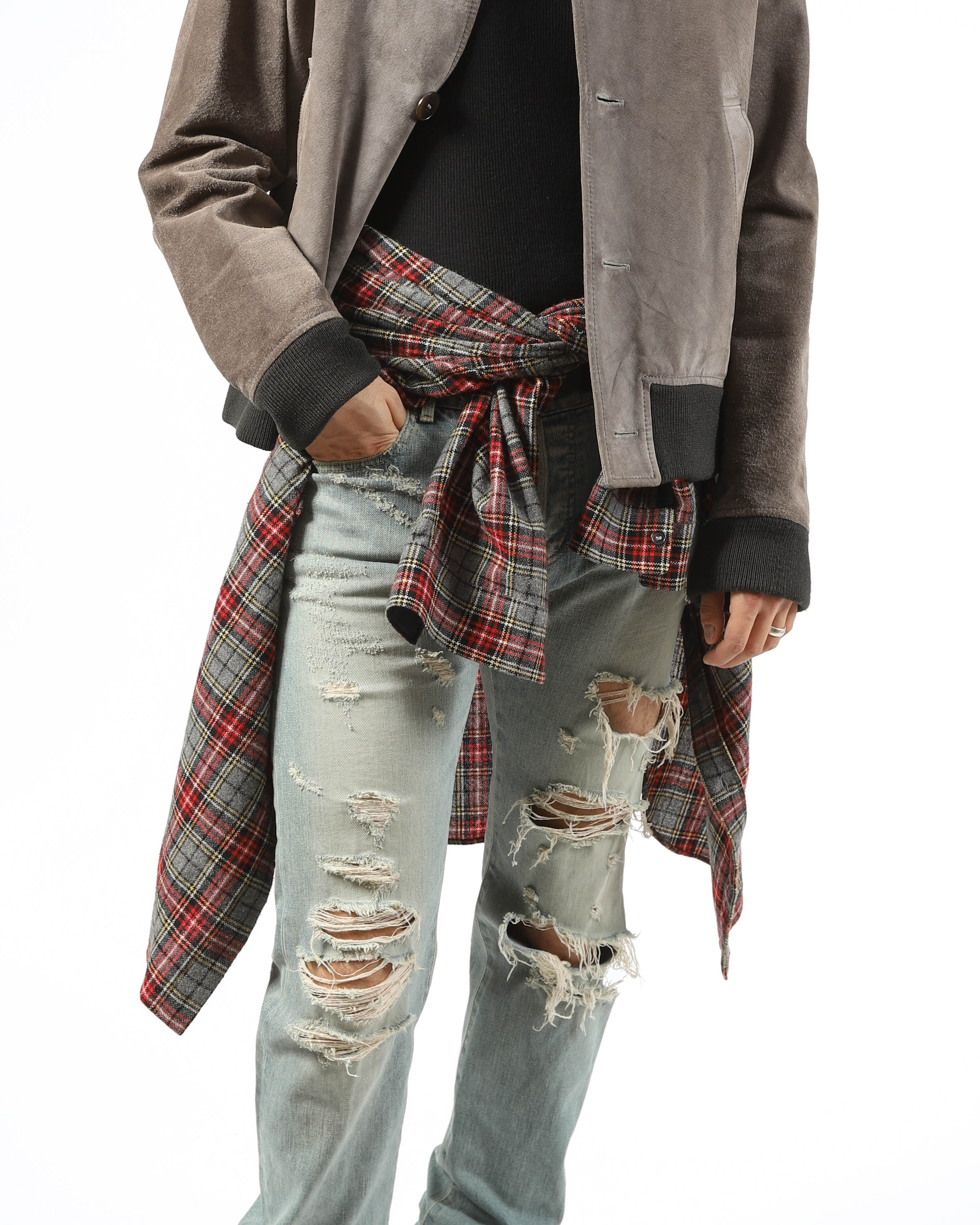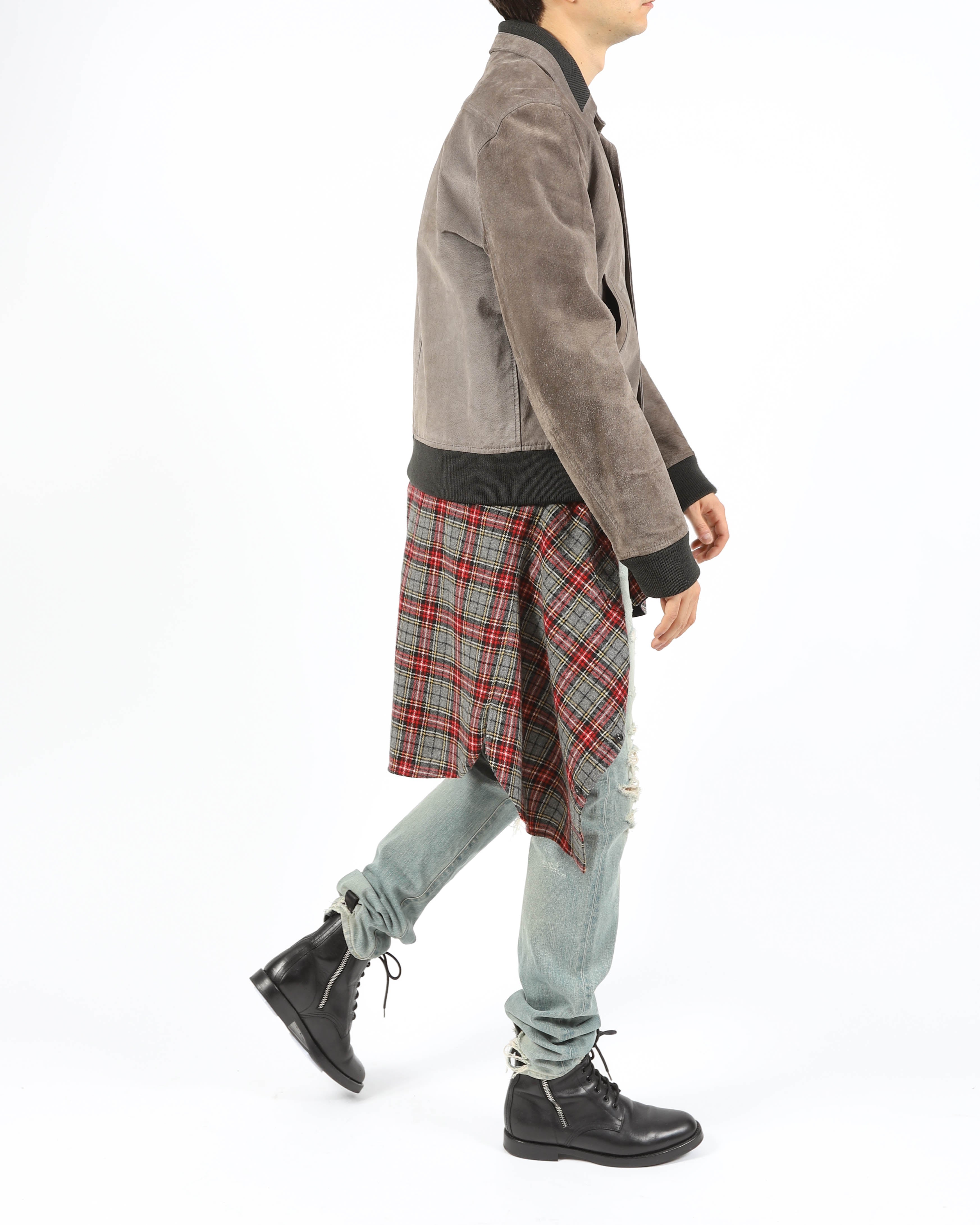 This contrast collar bomber in grey suede by Maison Margiela combines soft texture with sharp structure. The clean shoulder line and slightly boxy cut give the silhouette quiet strength, while the contrasting collar adds a clear focal point without overwhelming the shape.