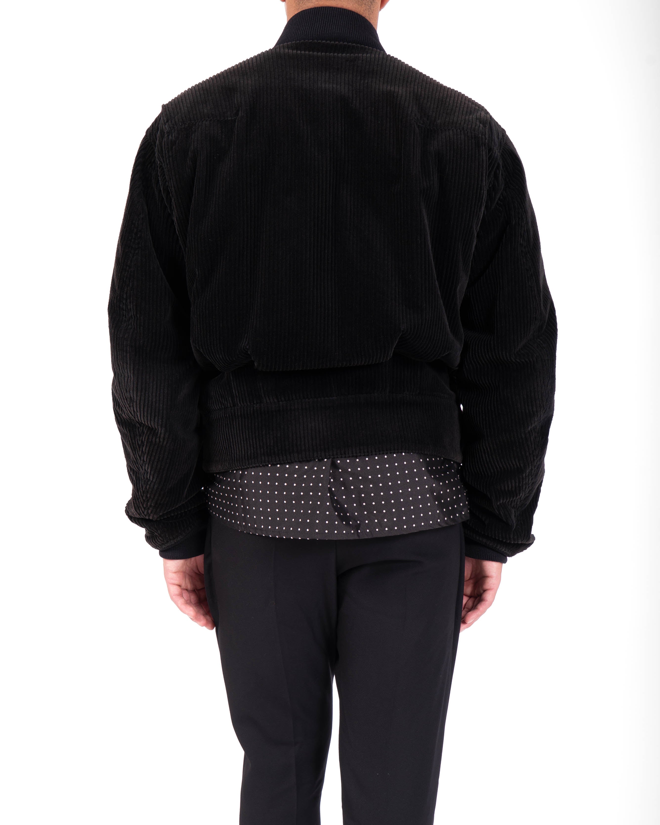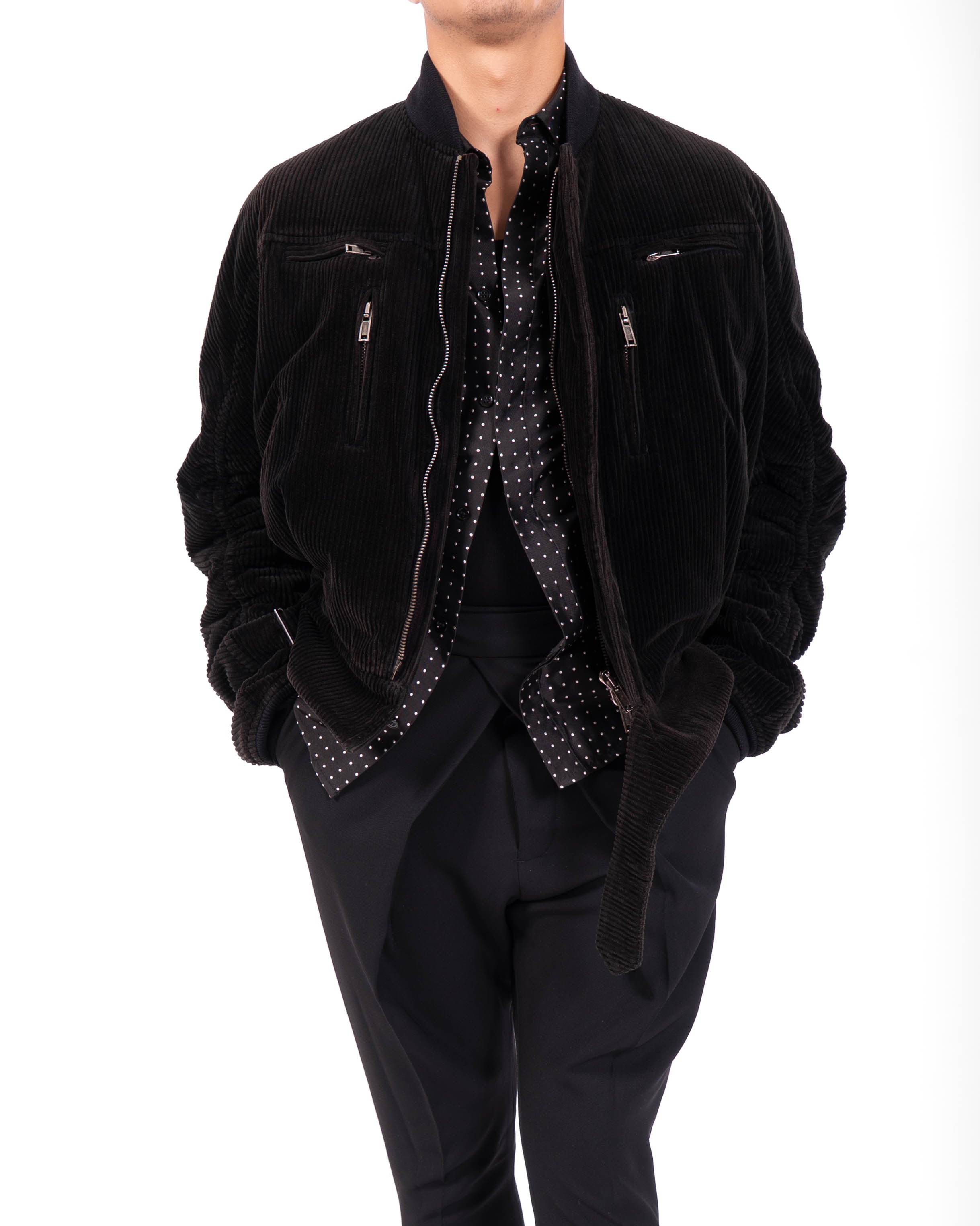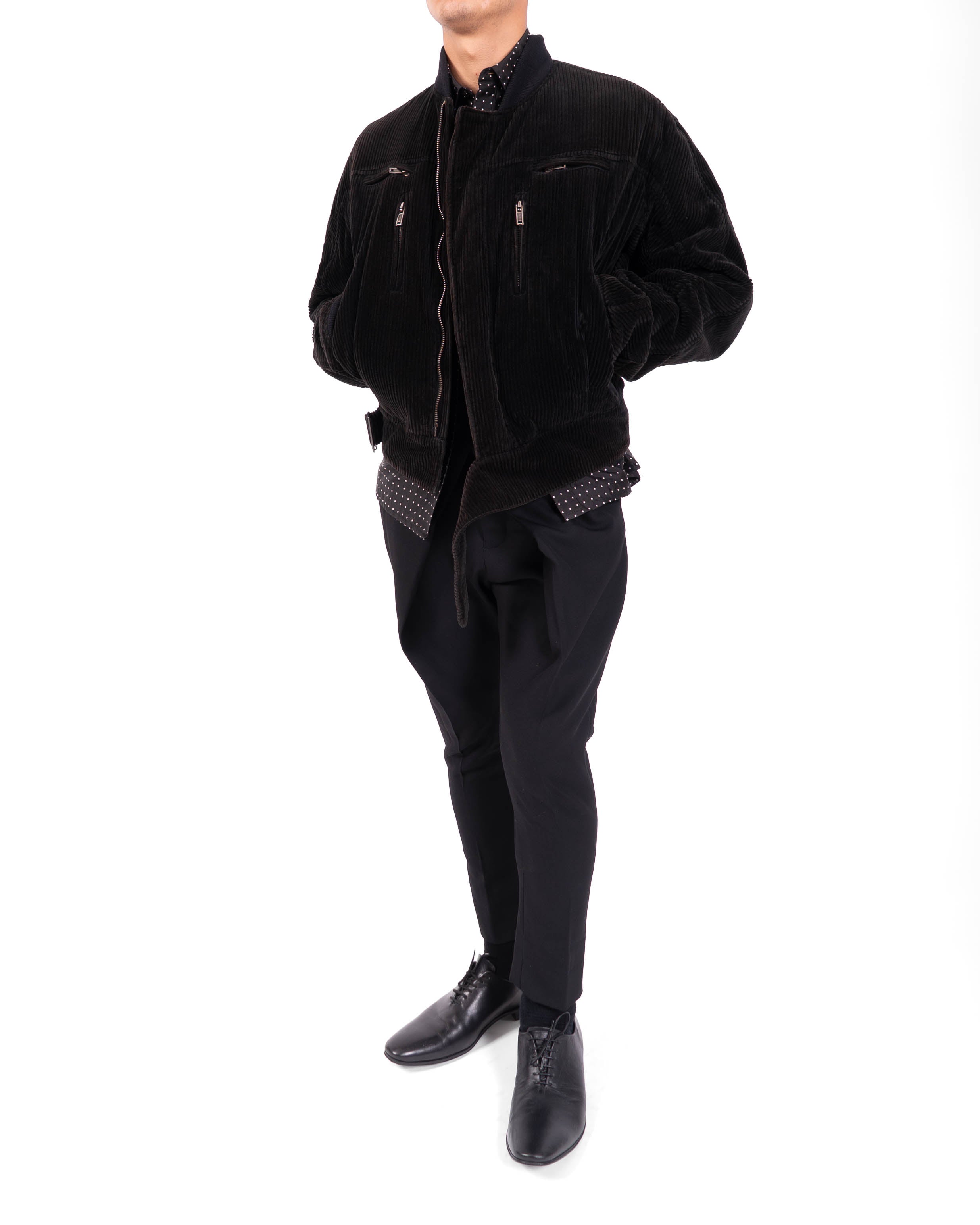 Crafted from black corduroy with a touch of stretch, the fabric’s ribbed surface adds depth and dimension, catching light in subtle shifts. Multiple zippers and paneled construction emphasize its biker undertones, while the generous fit softens the jacket’s inherent toughness.
