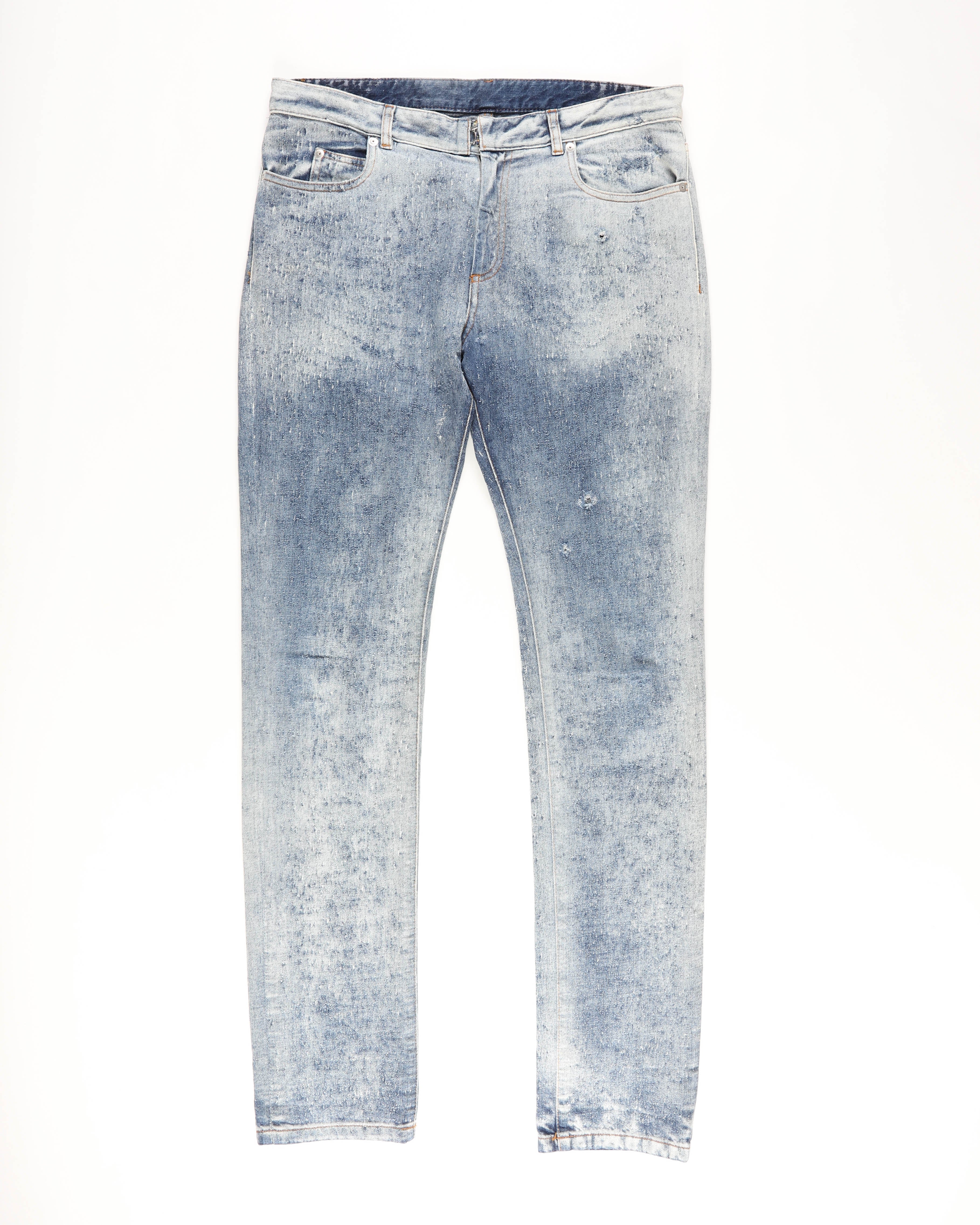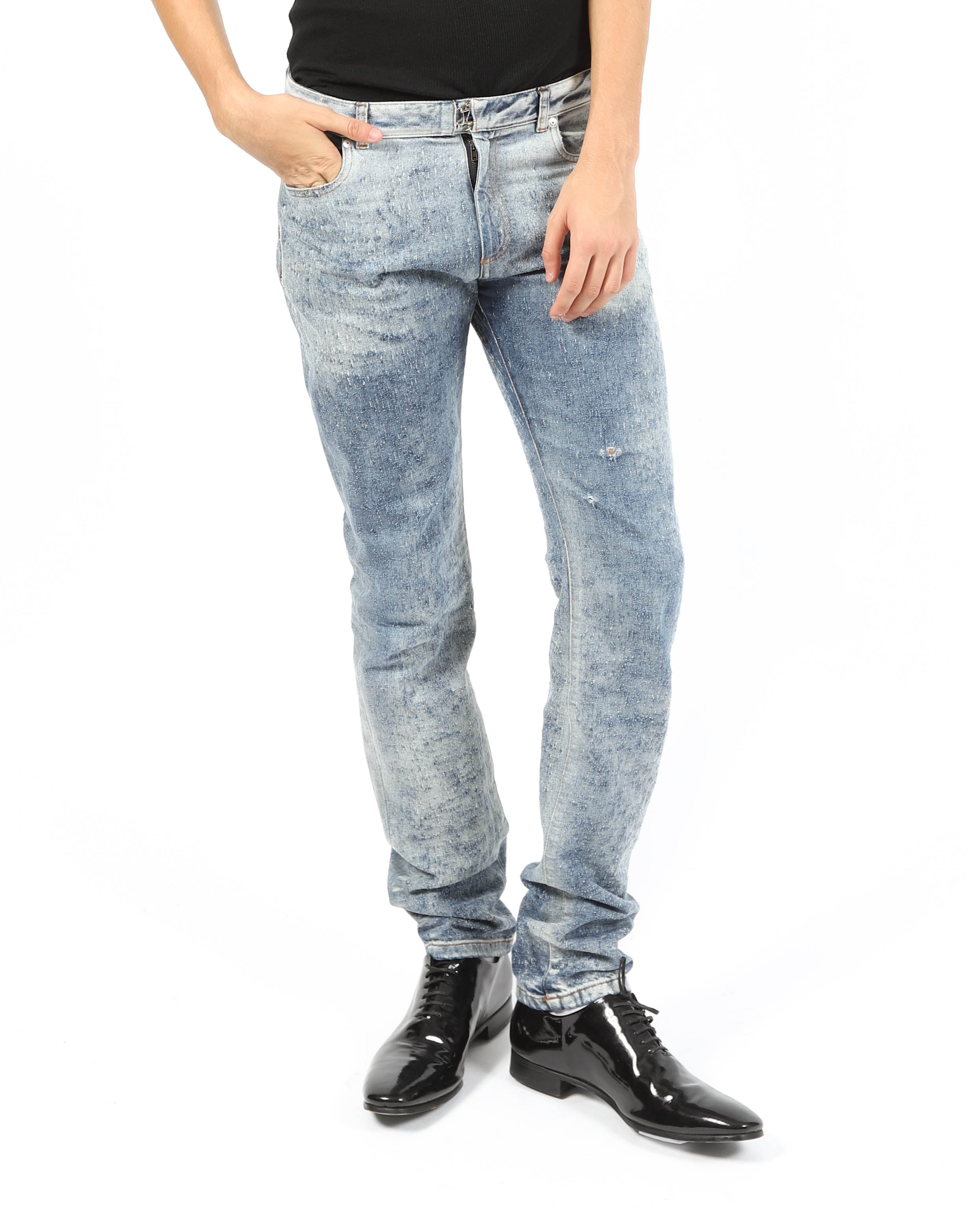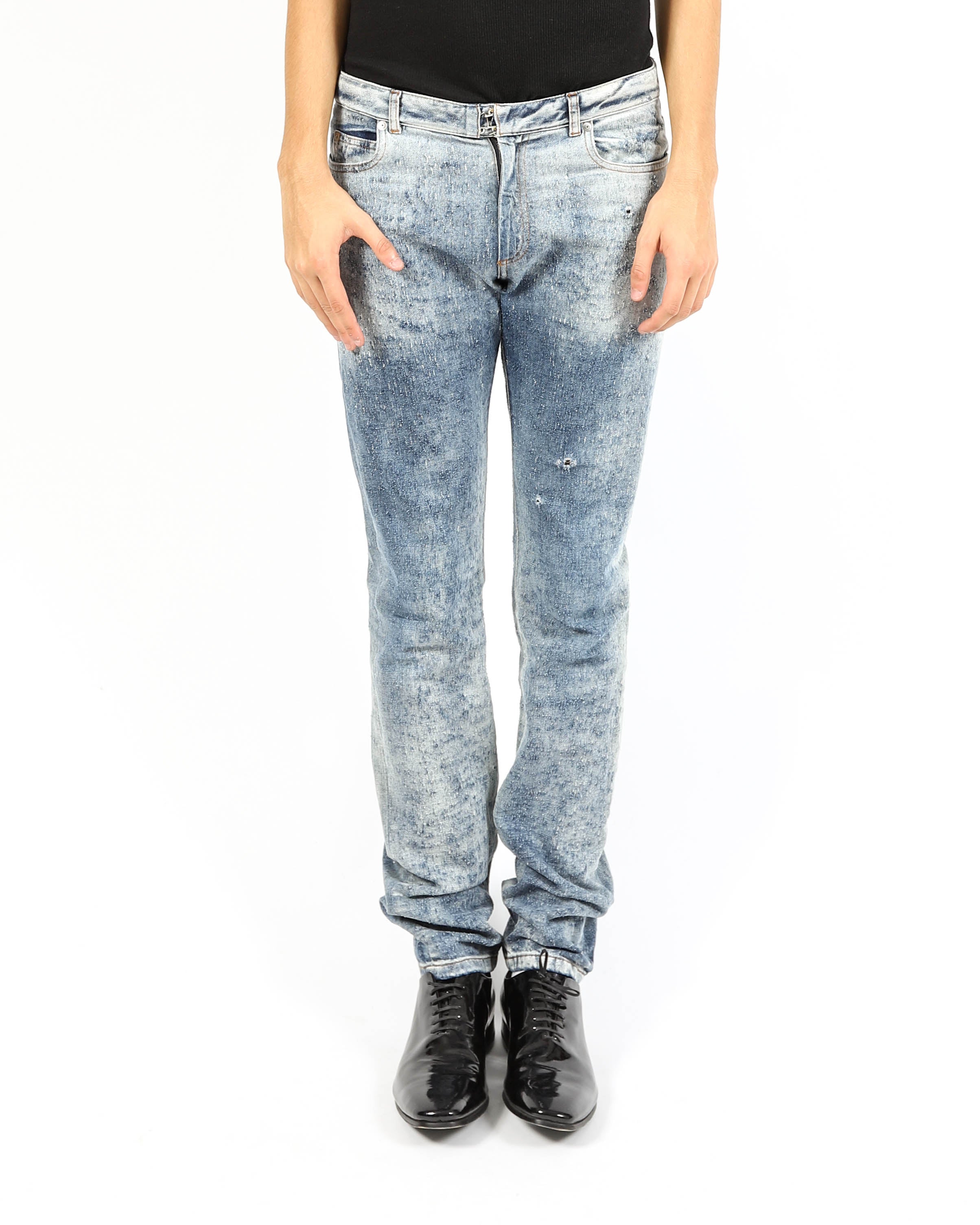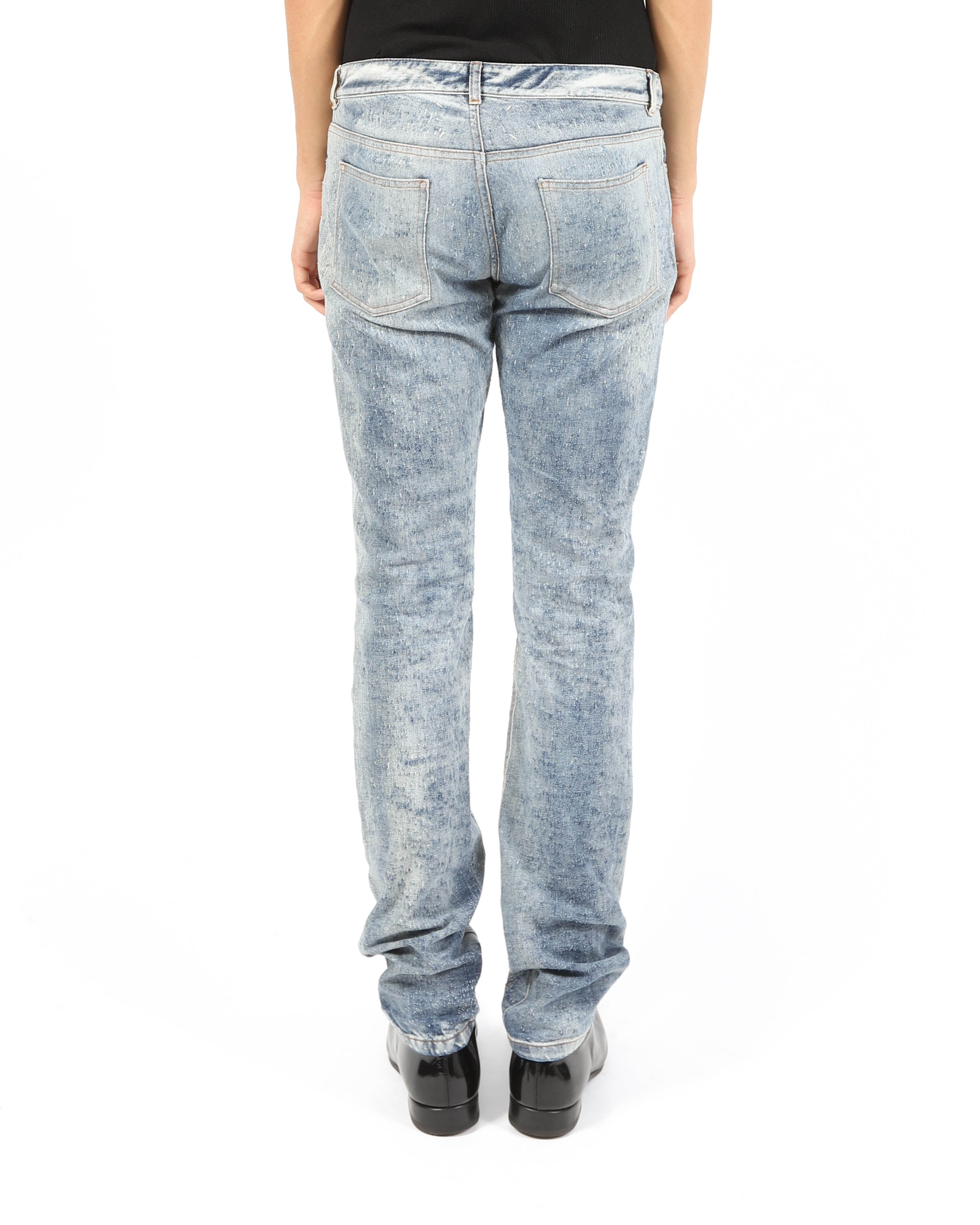 These slim fit jeans from FW15 are made of distressed, pilled denim that gives them a worn, tactile texture. The fading is concentrated at stress points and seams, balancing edge with used appeal.