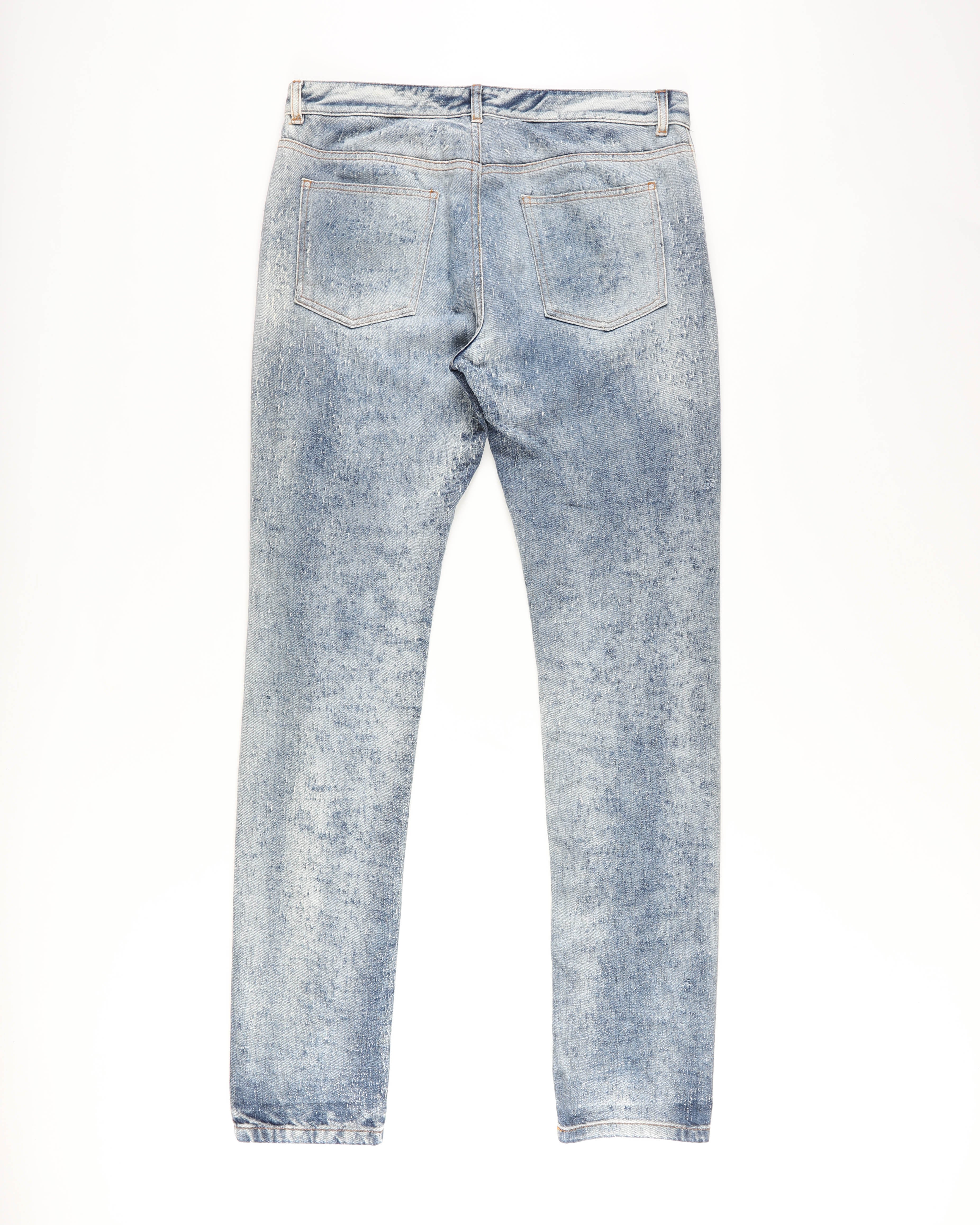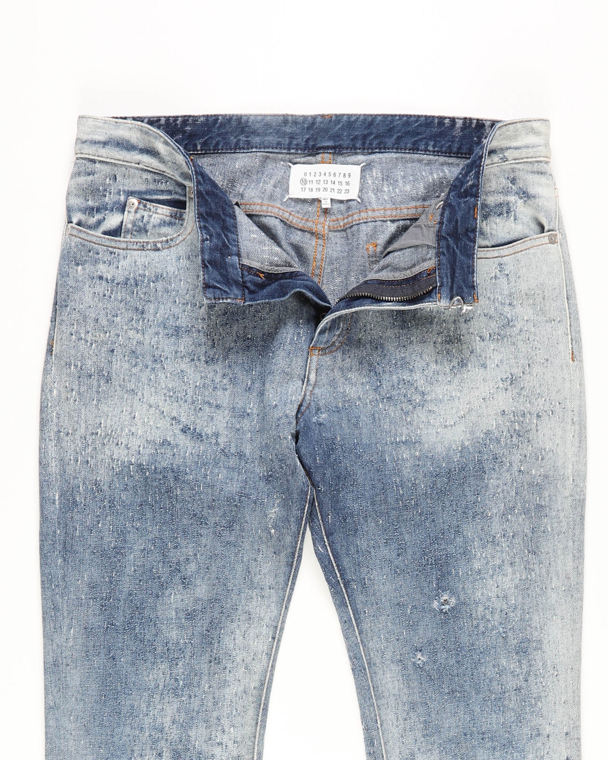 The cut is narrow but not tight, with a silhouette that follows the leg naturally. Classic five pocket styling and tonal hardware allow the distressed fabric to remain the focus. Originally released in 2015, this pair was produced in limited quantities, lending it a quietly unique character.
