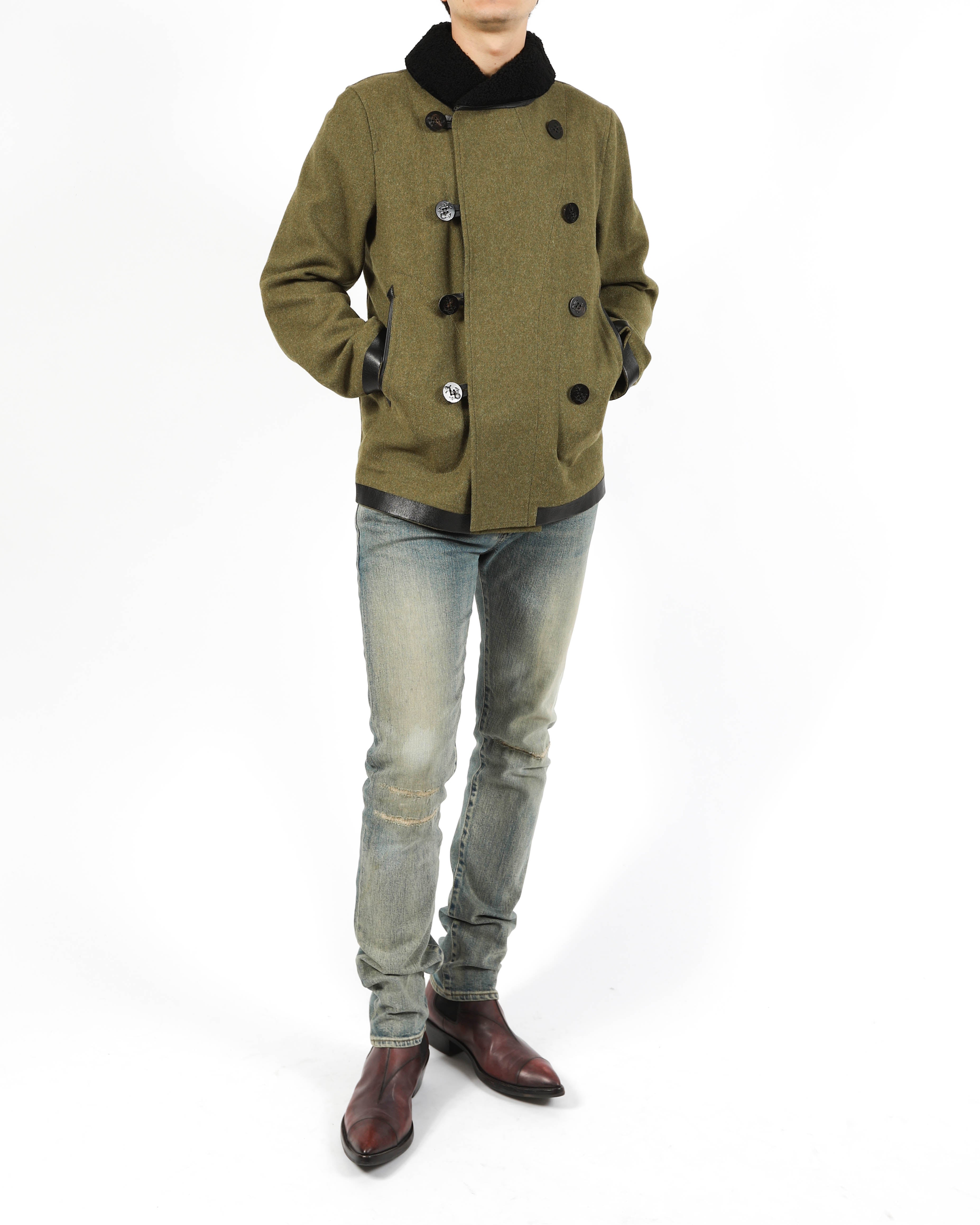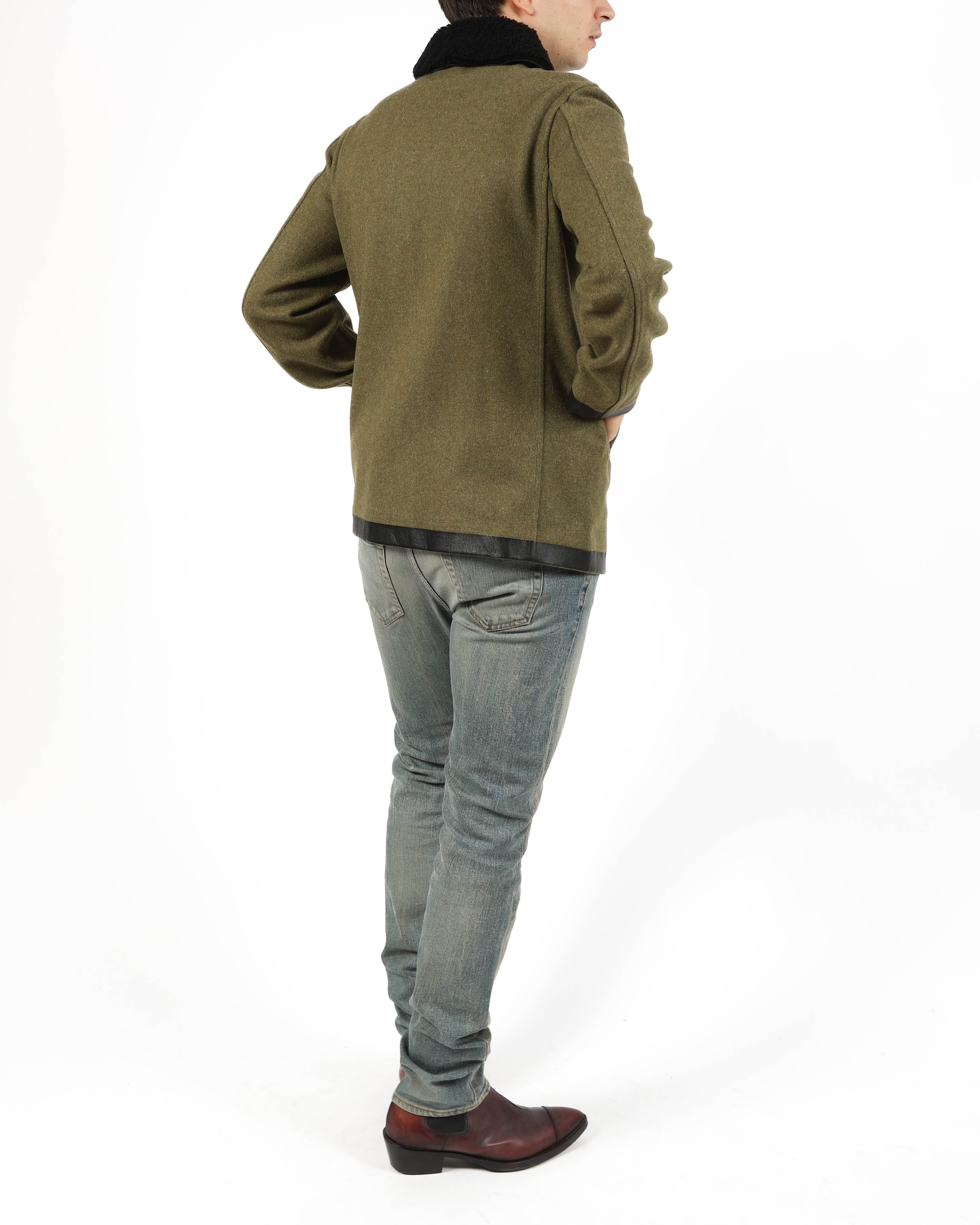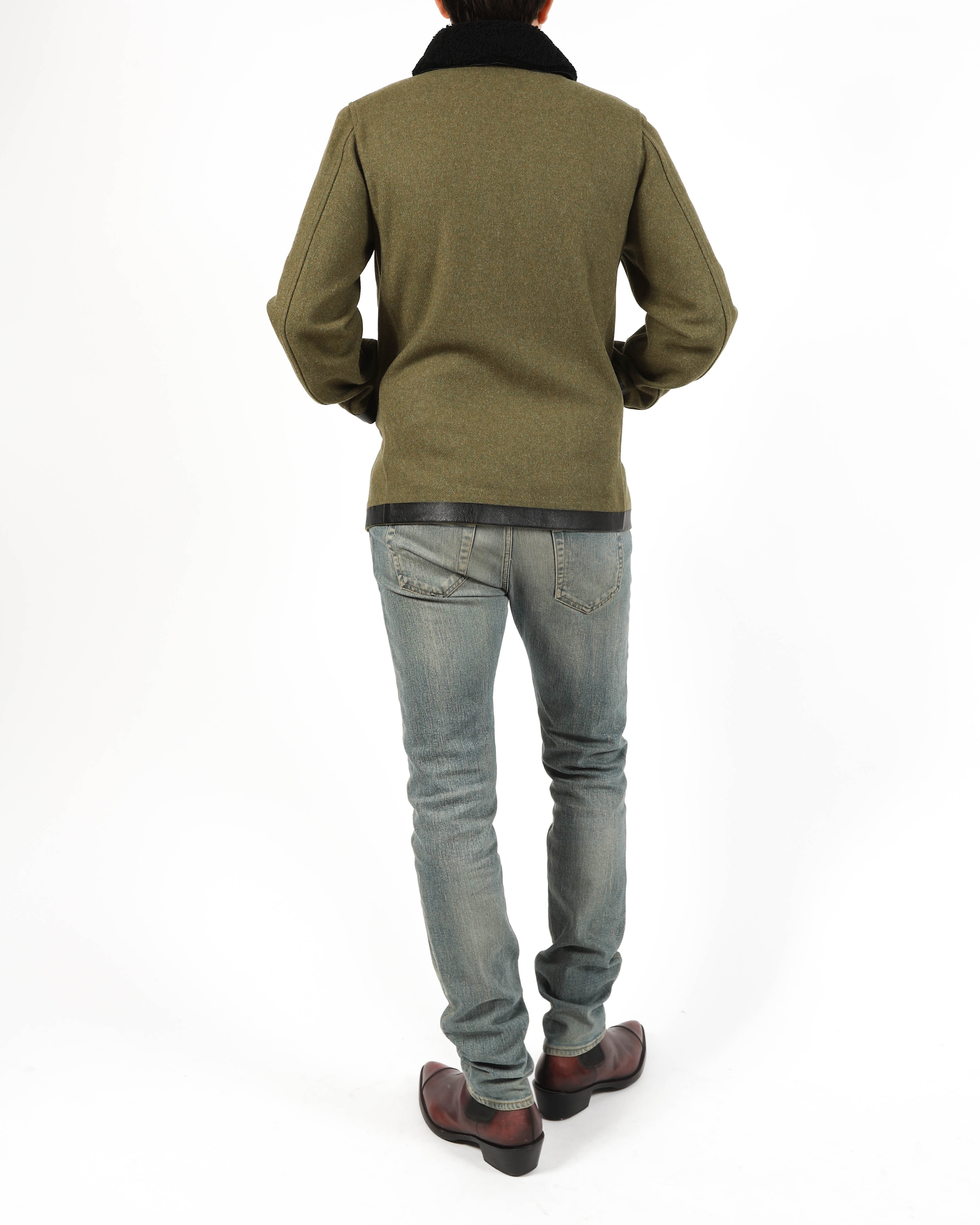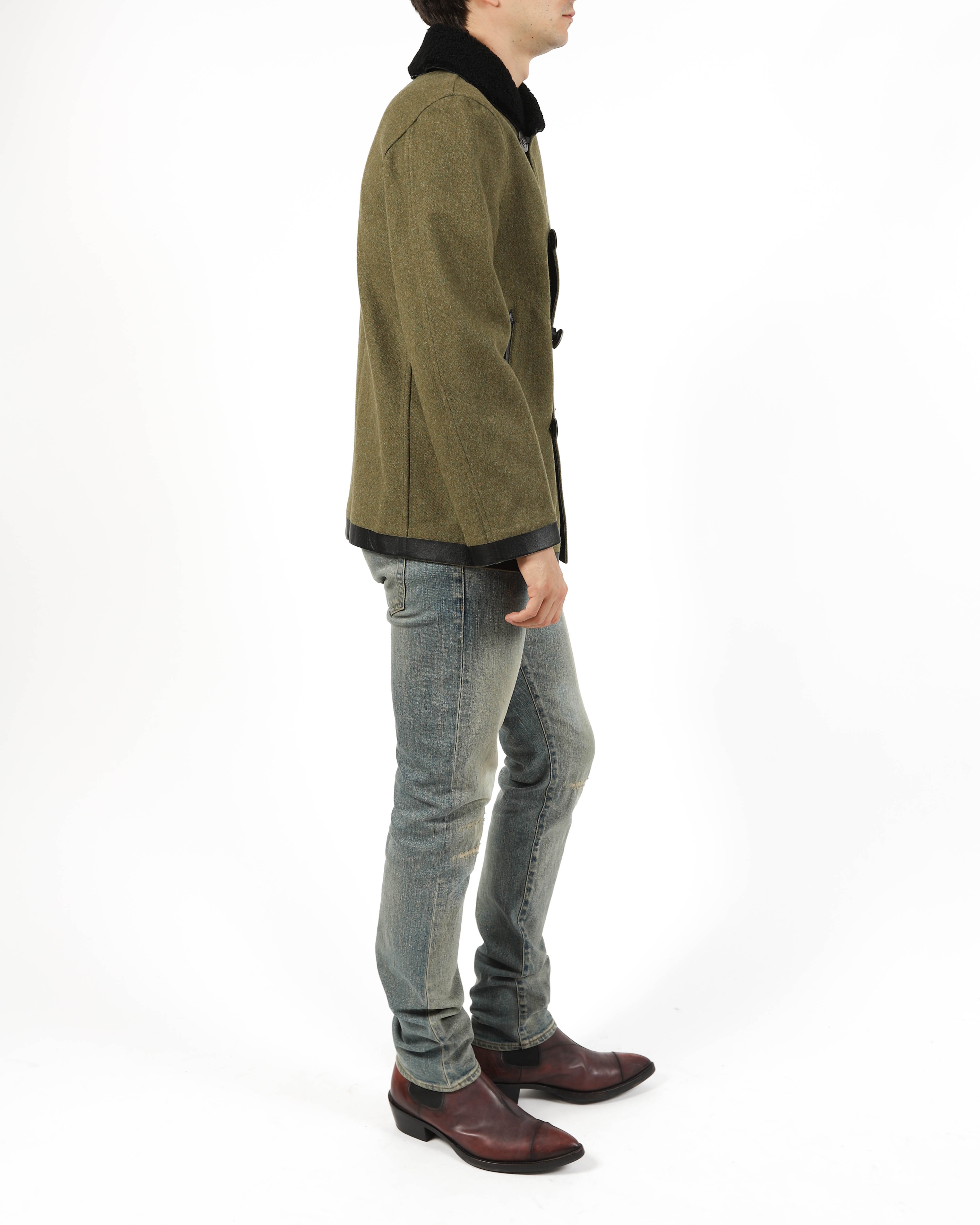 This khaki wool caban coat from FW17 by Berluti features a double breasted front that nods to naval tradition reimagined with a modern edge. The wool fabric gives the piece structure and warmth, while the muted khaki tone lends quiet distinction.