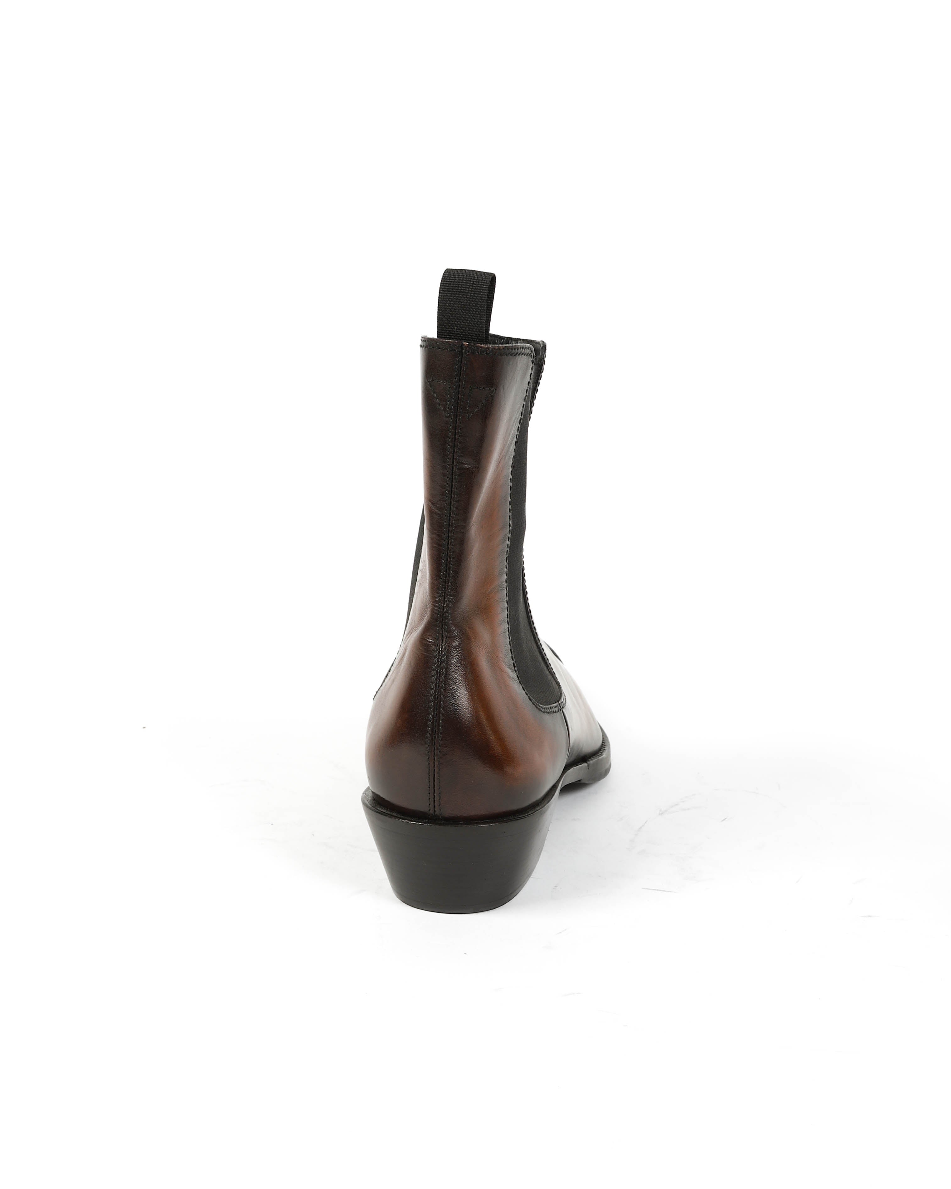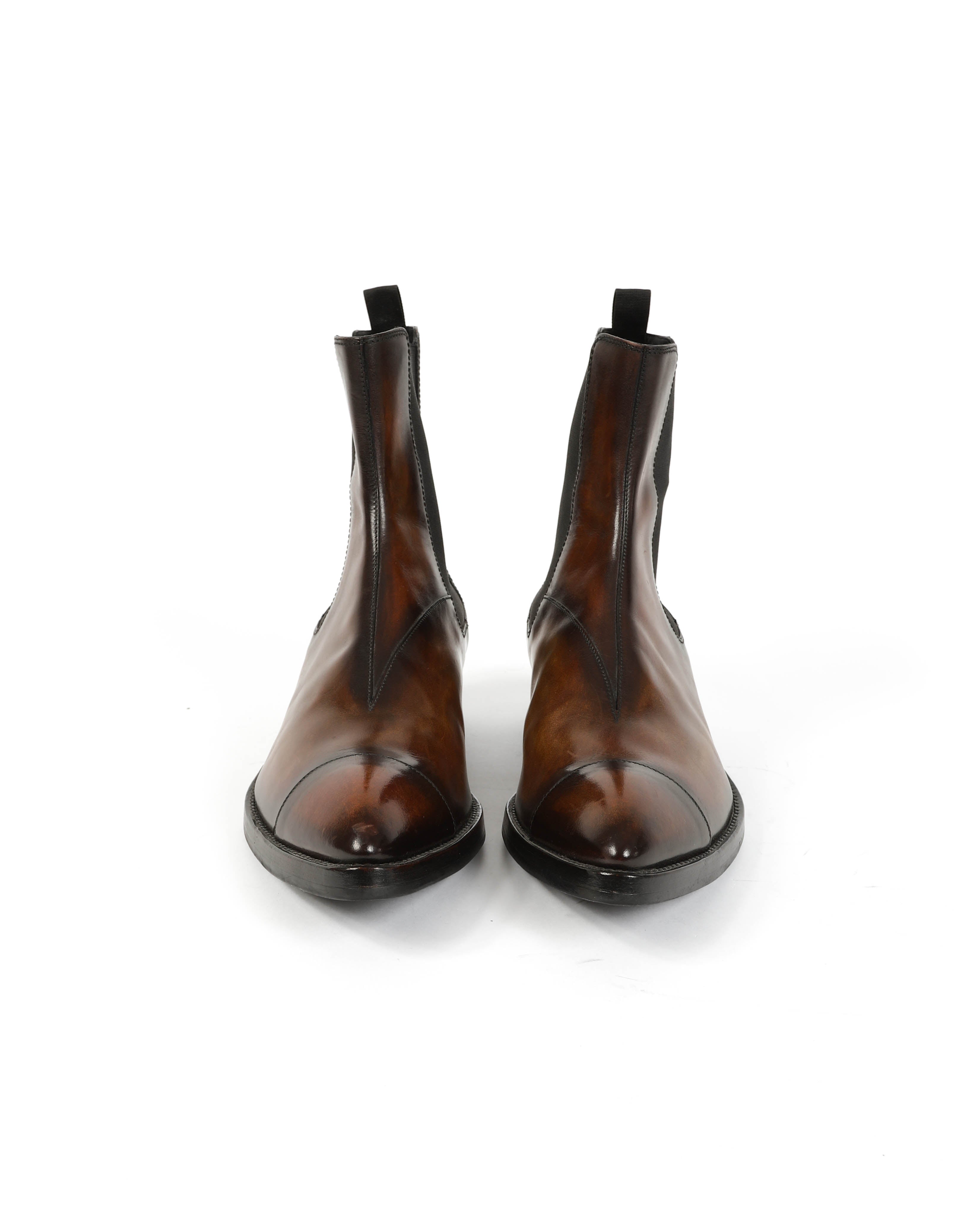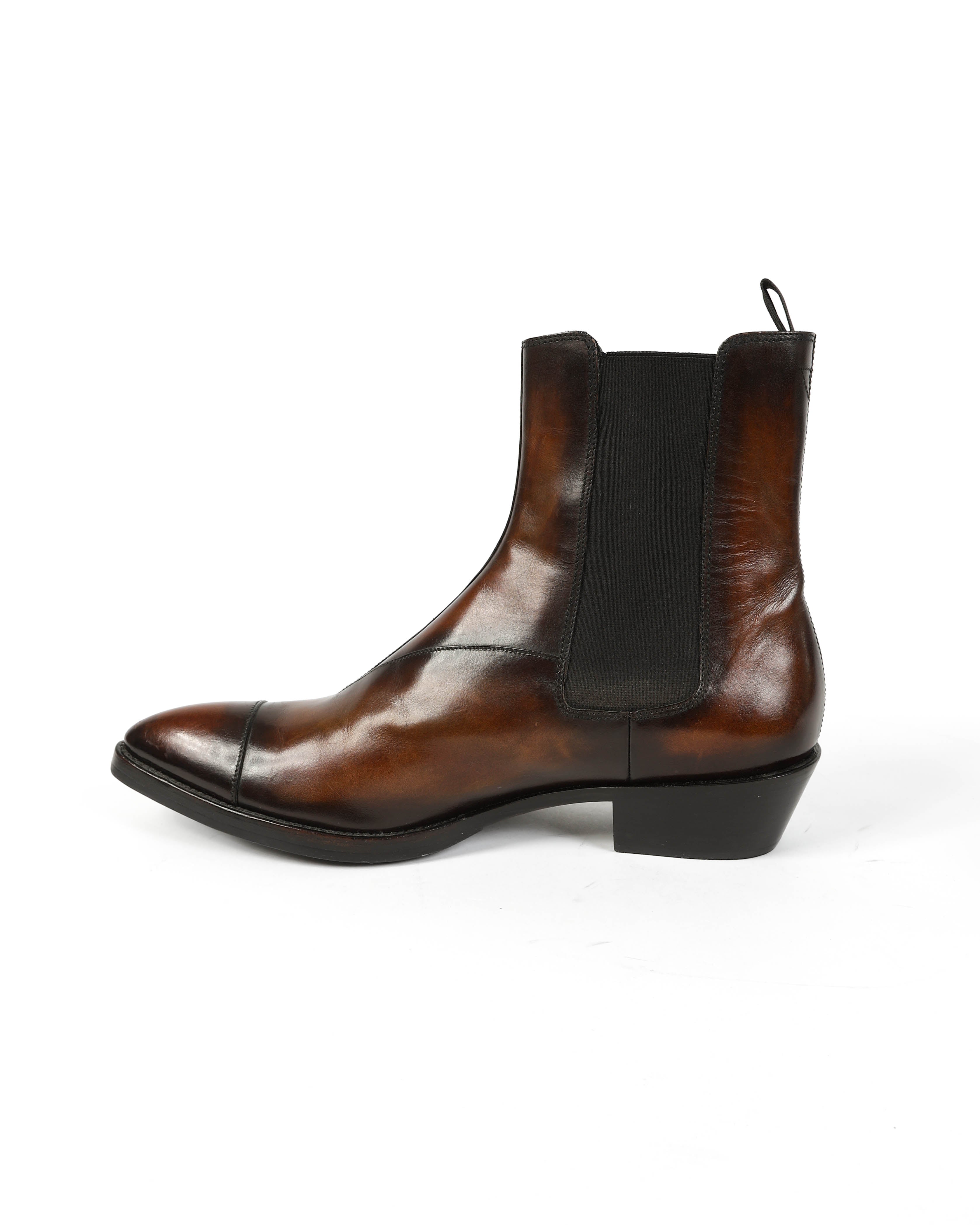 These brown leather boots from FW17 by Berluti are crafted from smooth leather with a natural grain that develops depth over time. The silhouette is clean and structured, defined by a pointed toe and a stacked 5 cm heel that adds a sharp, elongated line.