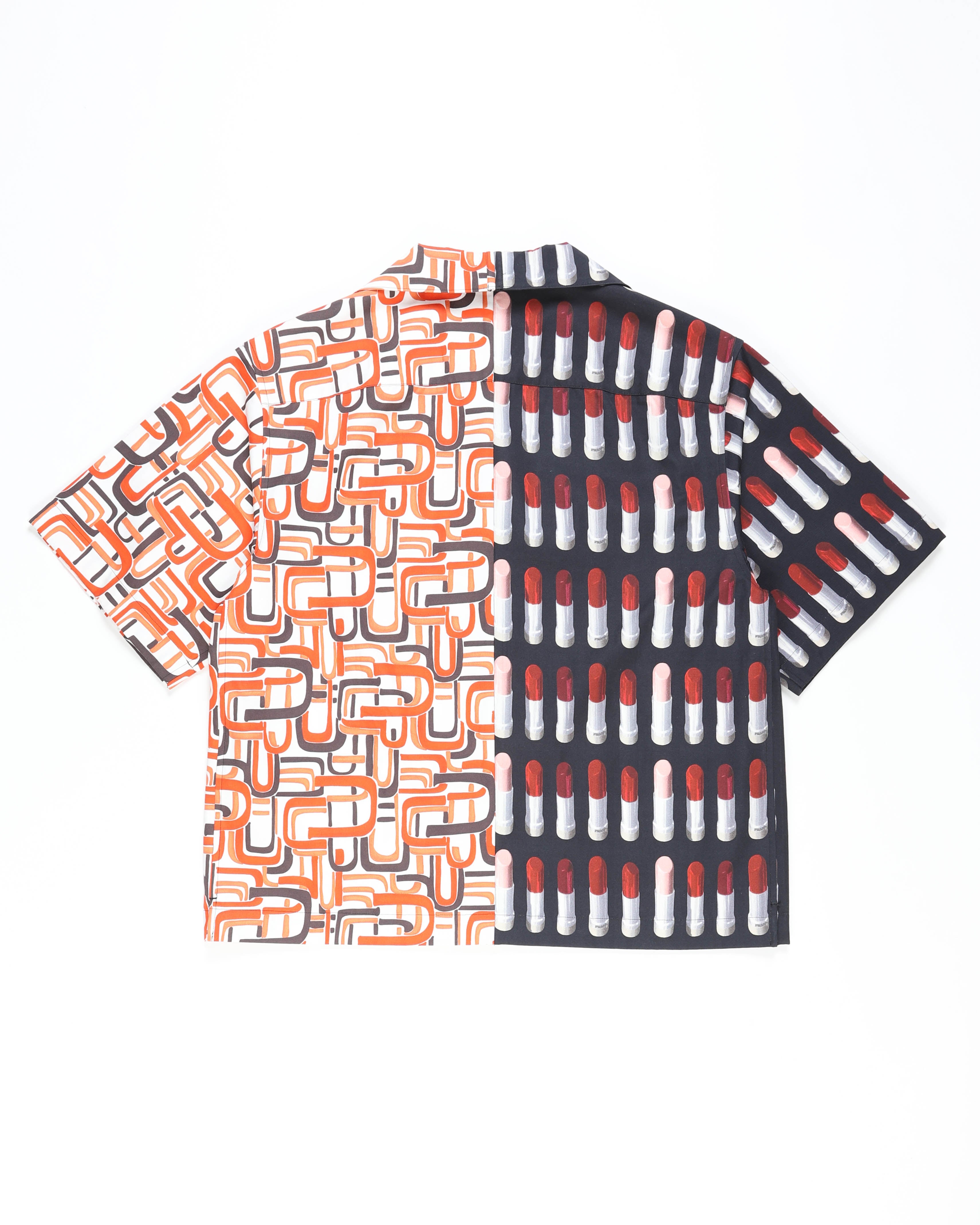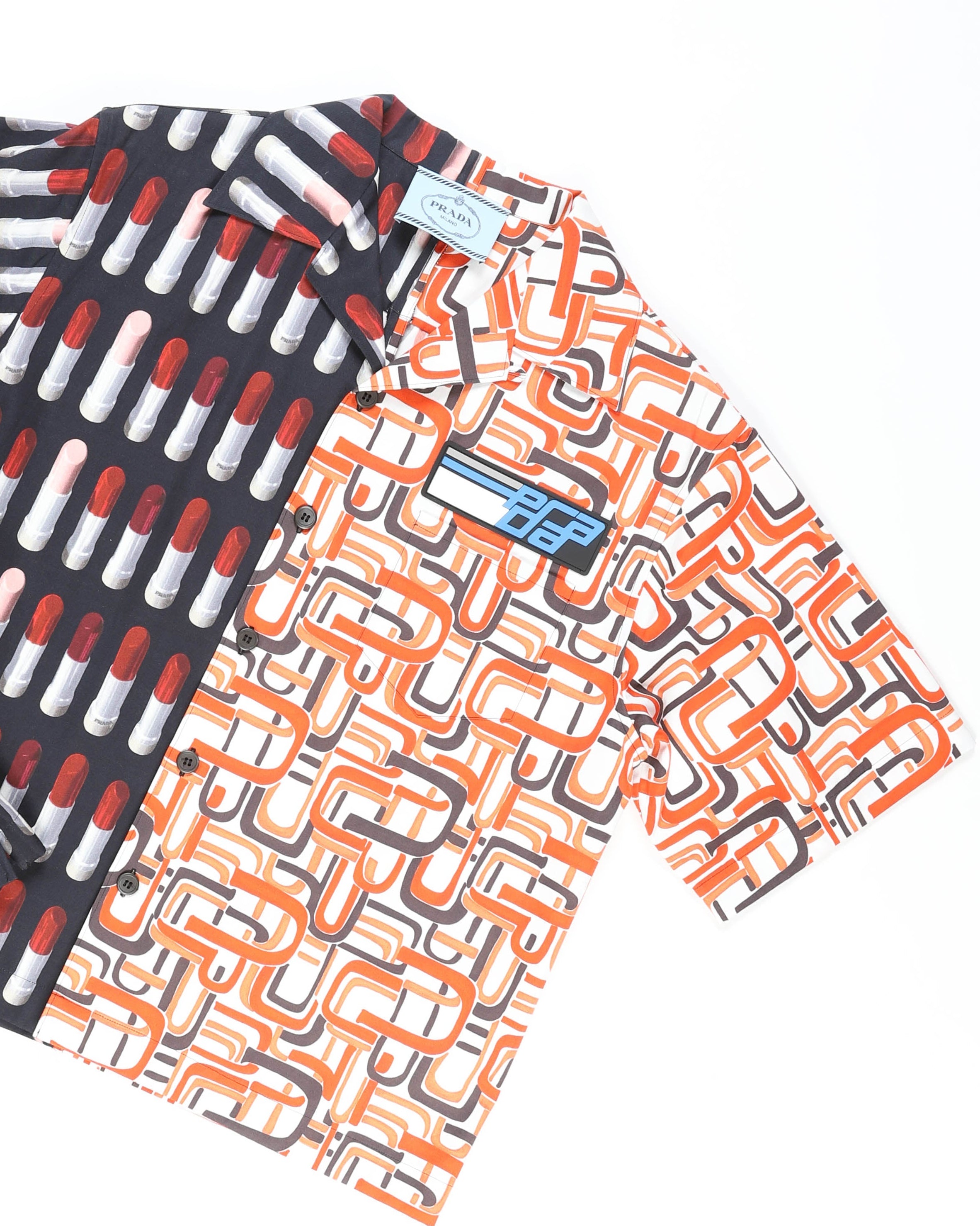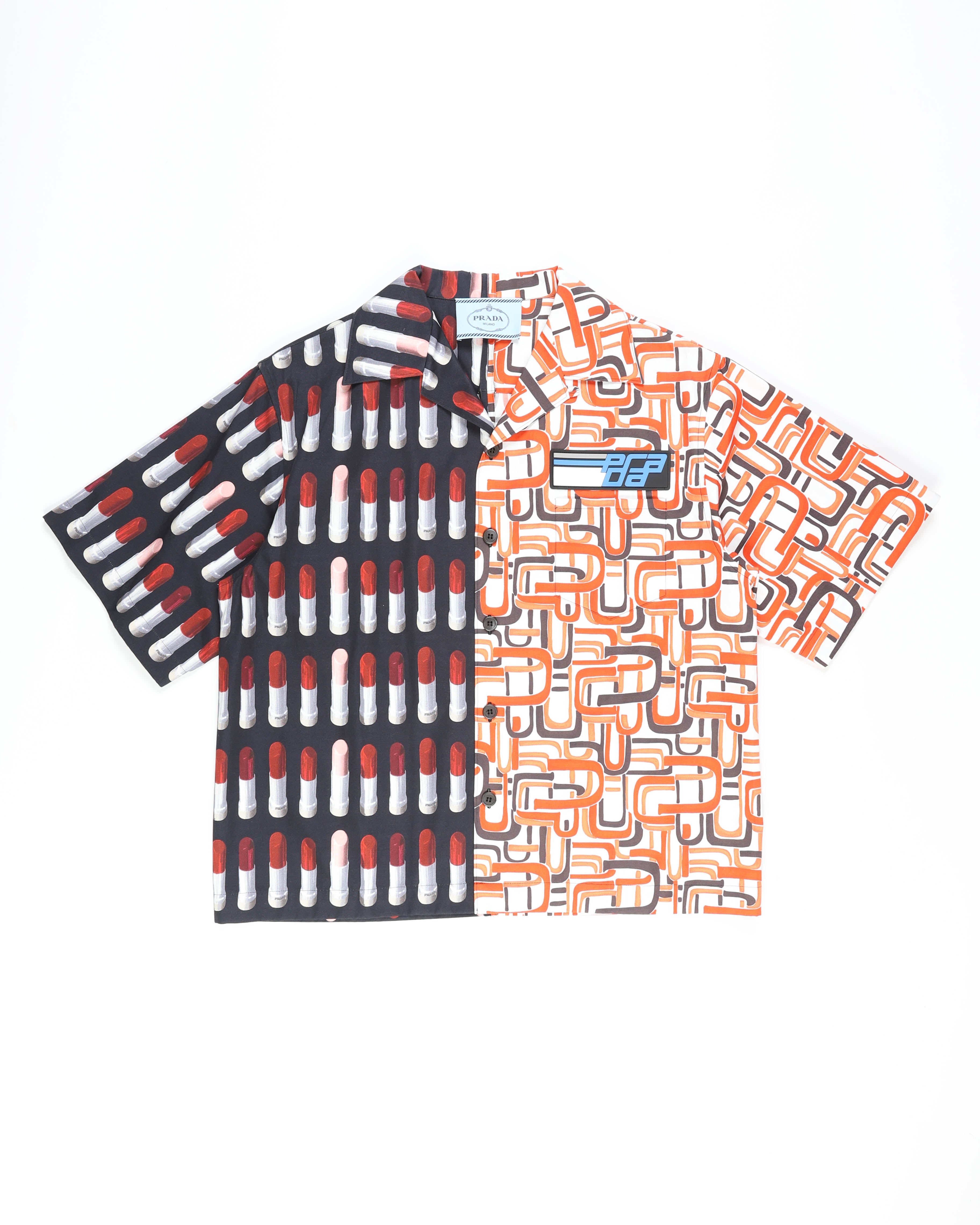This double match cotton shirt by Prada experiments with contrasting visuals and precise structure. One half displays a bold geometric motif, while the other balances it with a muted tonal panel. The fabric holds its shape crisply while staying breathable.