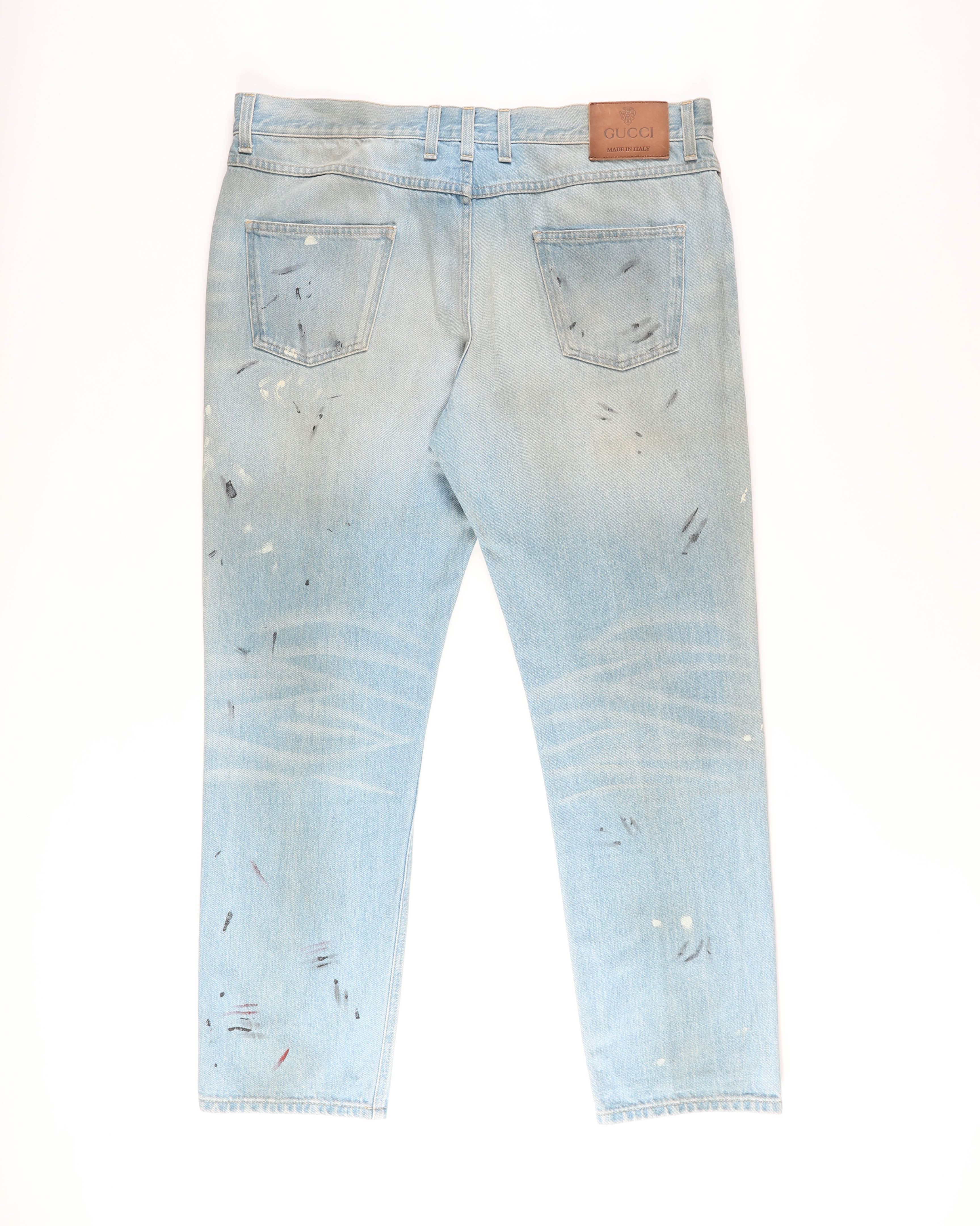 These relaxed hand painted jeans in light washed denim by Gucci showcase a bold intersection of craft and luxury. The light denim base is subtly treated by hand, adding layers of tone and texture that catch the eye without overpowering the silhouette.