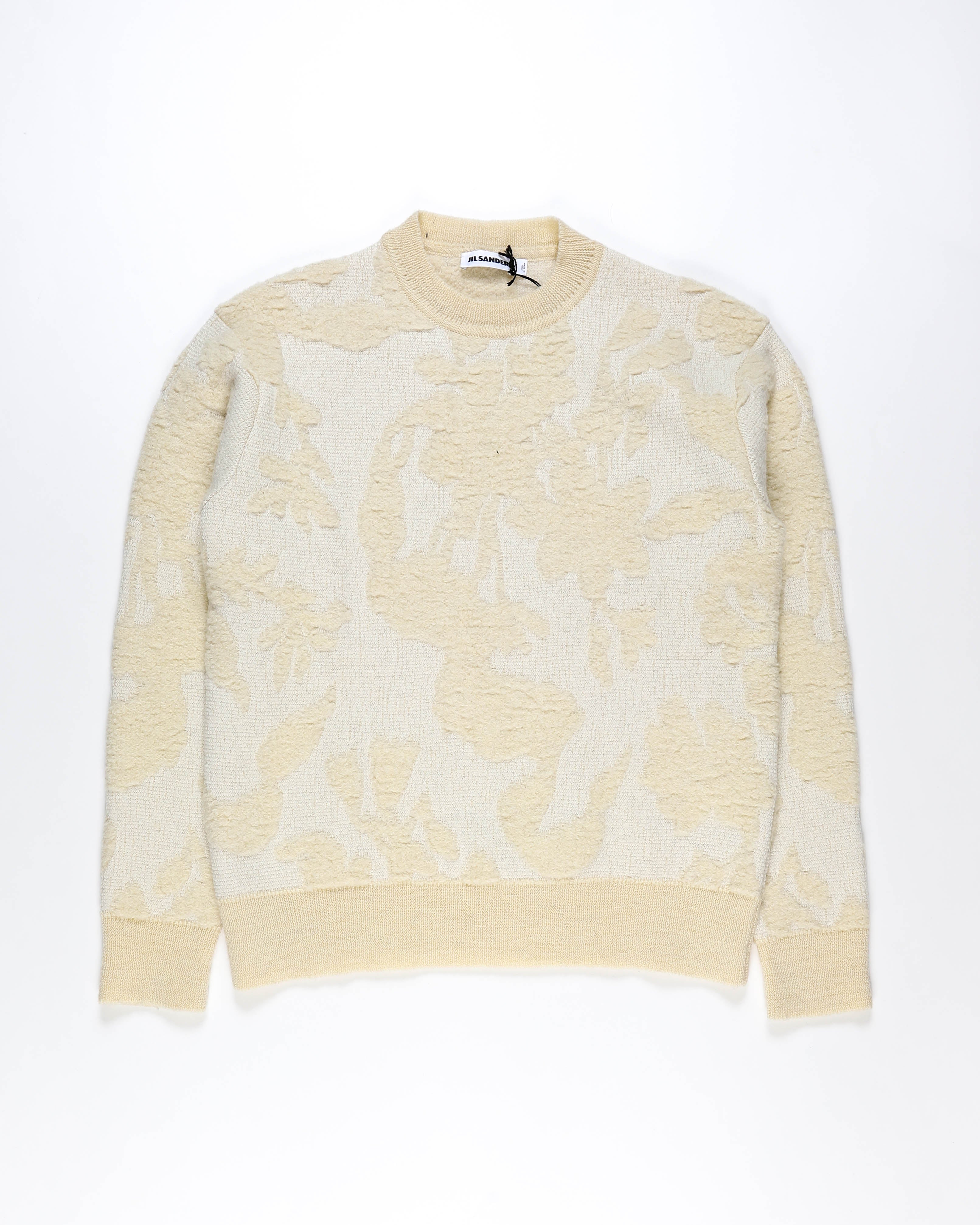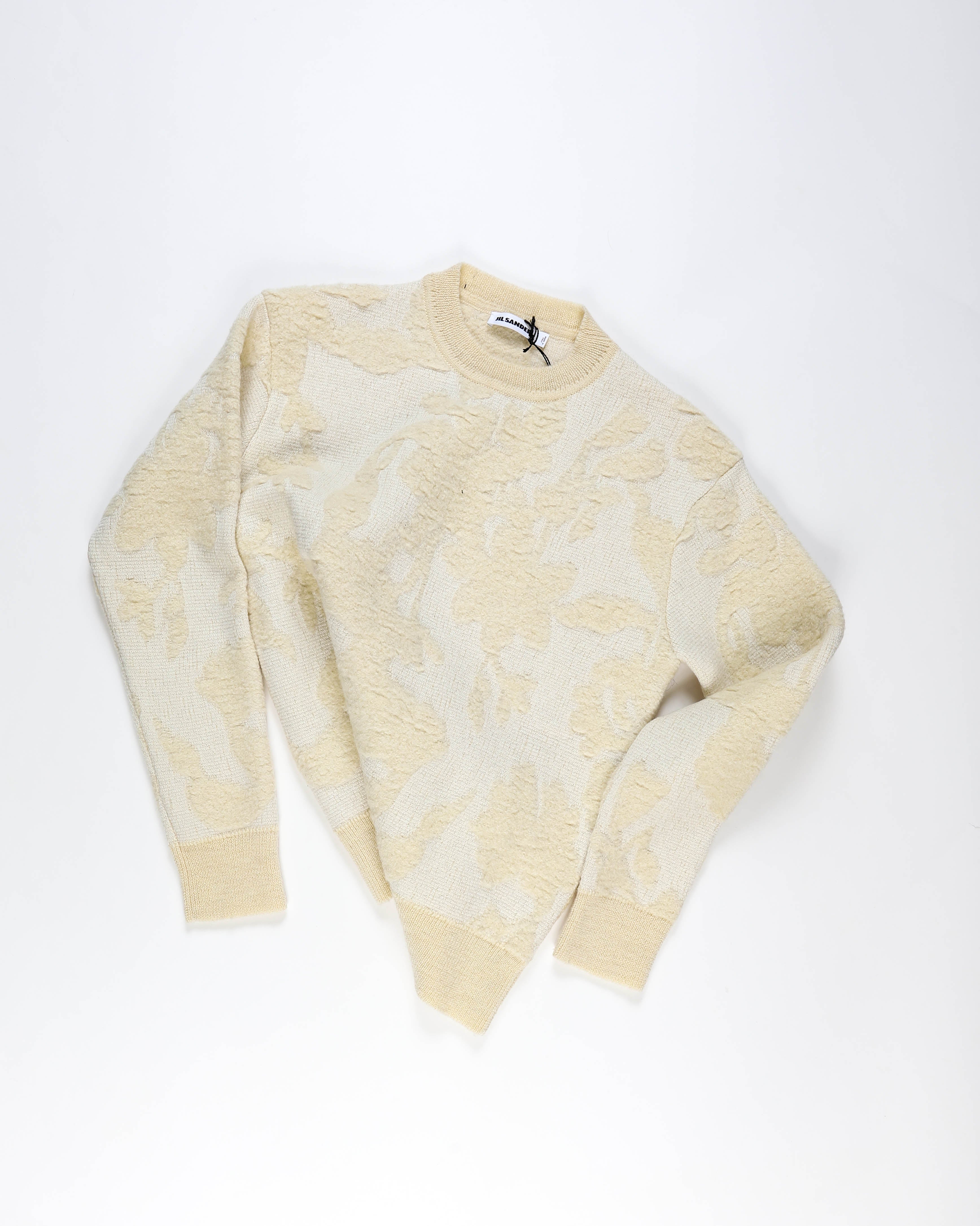 This hand-knitted sweater from the Spring/Summer 2018 collection showcases Jil Sander’s refined approach to craft and texture. Made from 100% soft wool in a delicate ivory and beige tone, it features a tactile knitted motif that adds depth and dimension to its minimal silhouette. The slightly relaxed fit and ribbed hems provide structure while maintaining comfort. A subtle yet sophisticated piece that embodies the purity and restraint characteristic of Jil Sander’s design language.