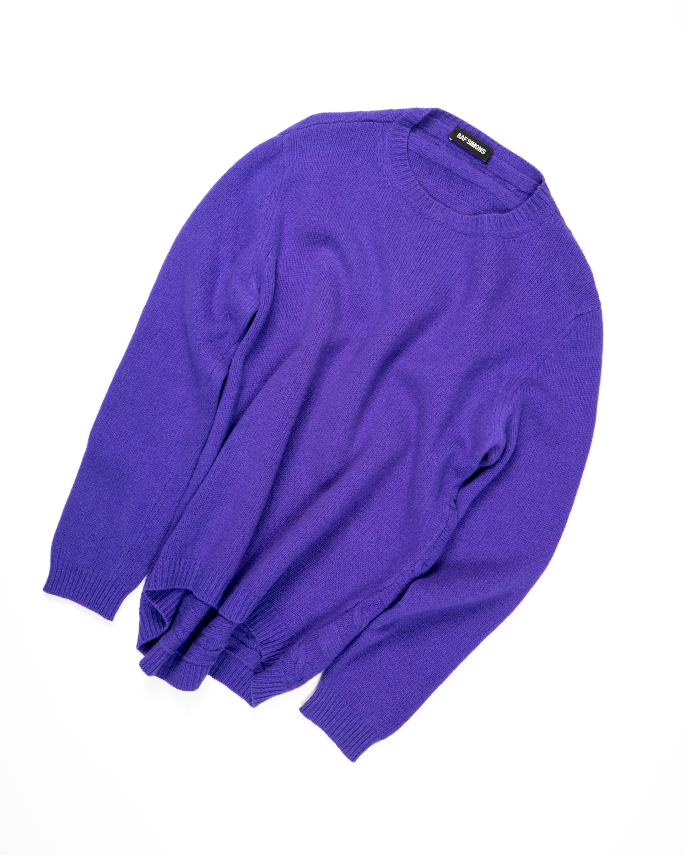 This Round Hem Sweater showcases Raf Simons’ ability to fuse bold color with refined knitwear design. The silhouette is clean and slightly fitted, finished with a rounded hemline that softens the otherwise minimal shape.