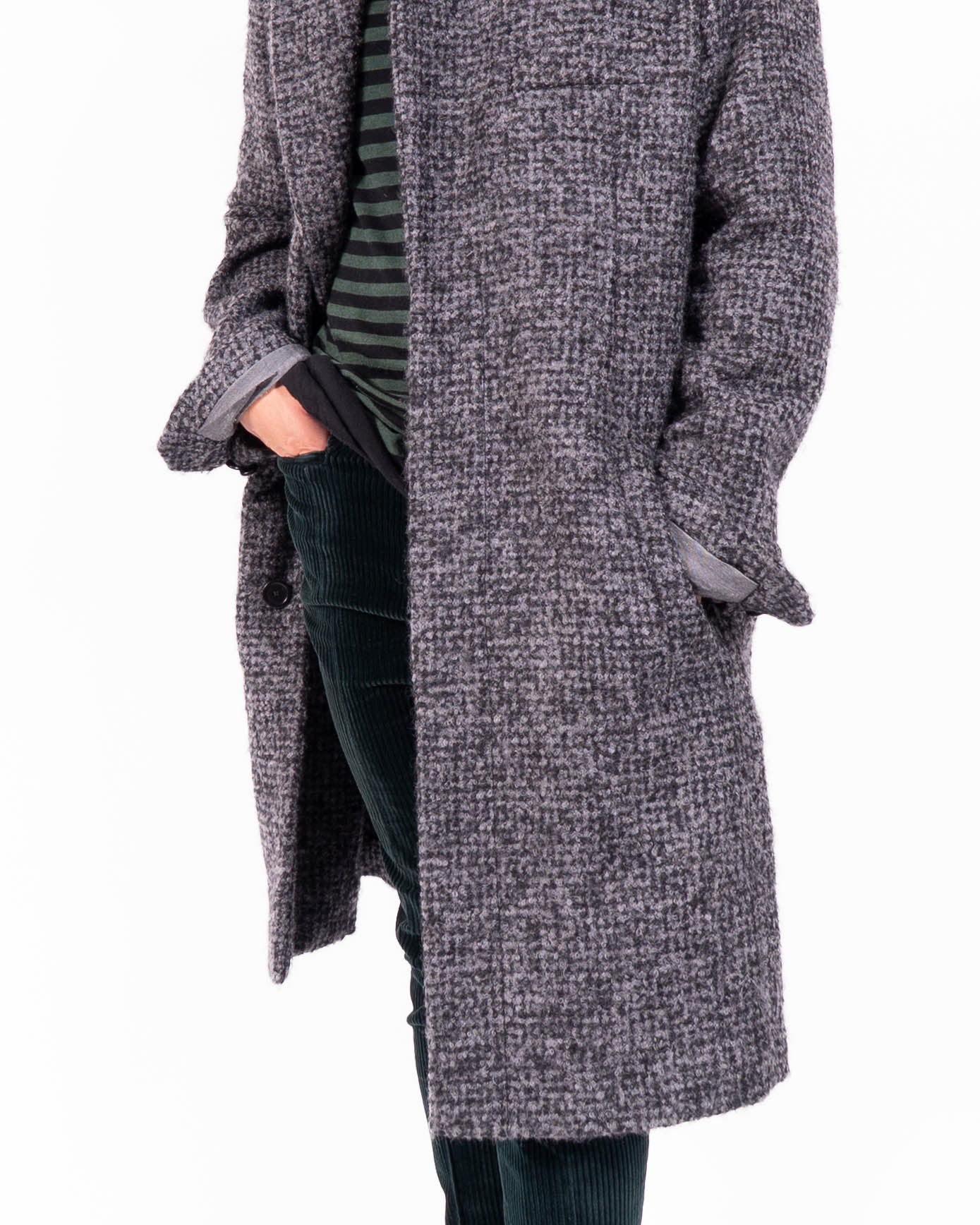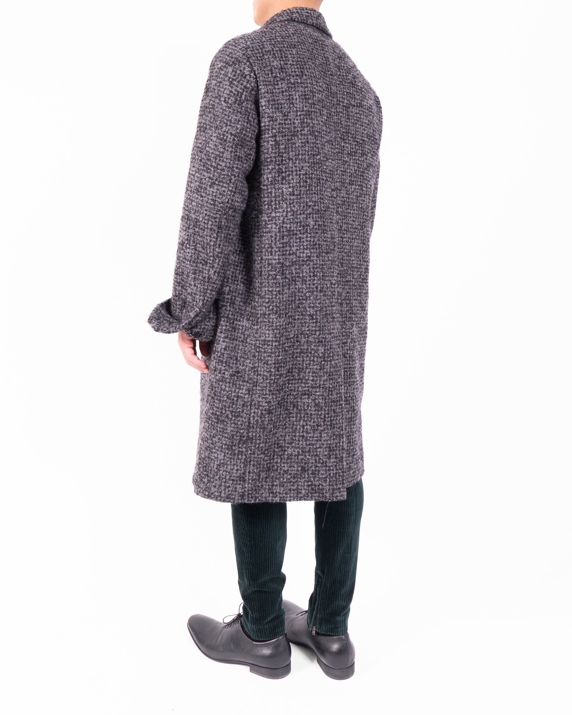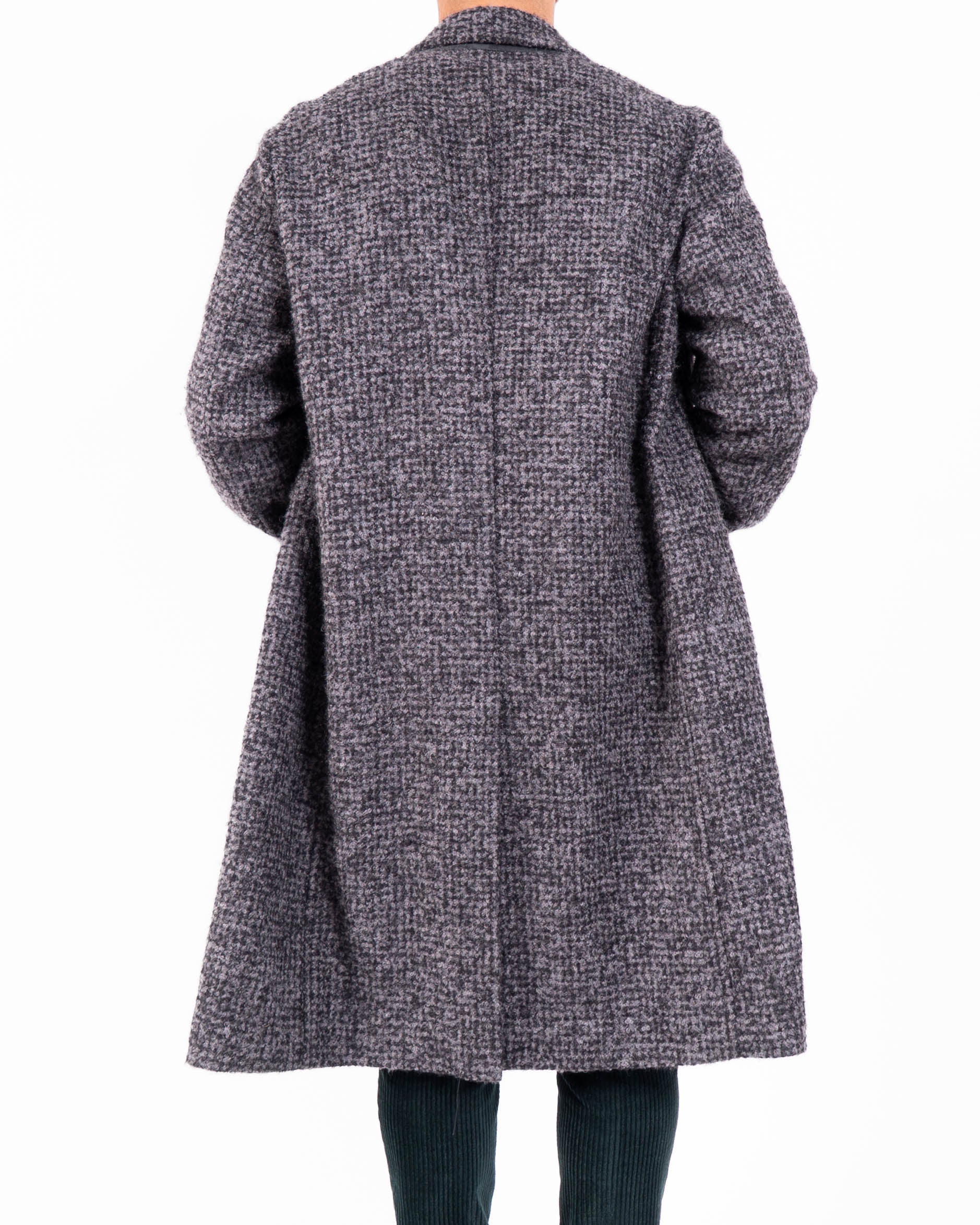 Made from grey bouclé wool in a subtle houndstooth pattern, the fabric combines depth and softness with a tactile richness. The surface texture gives the coat an understated complexity, making it both versatile and refined.