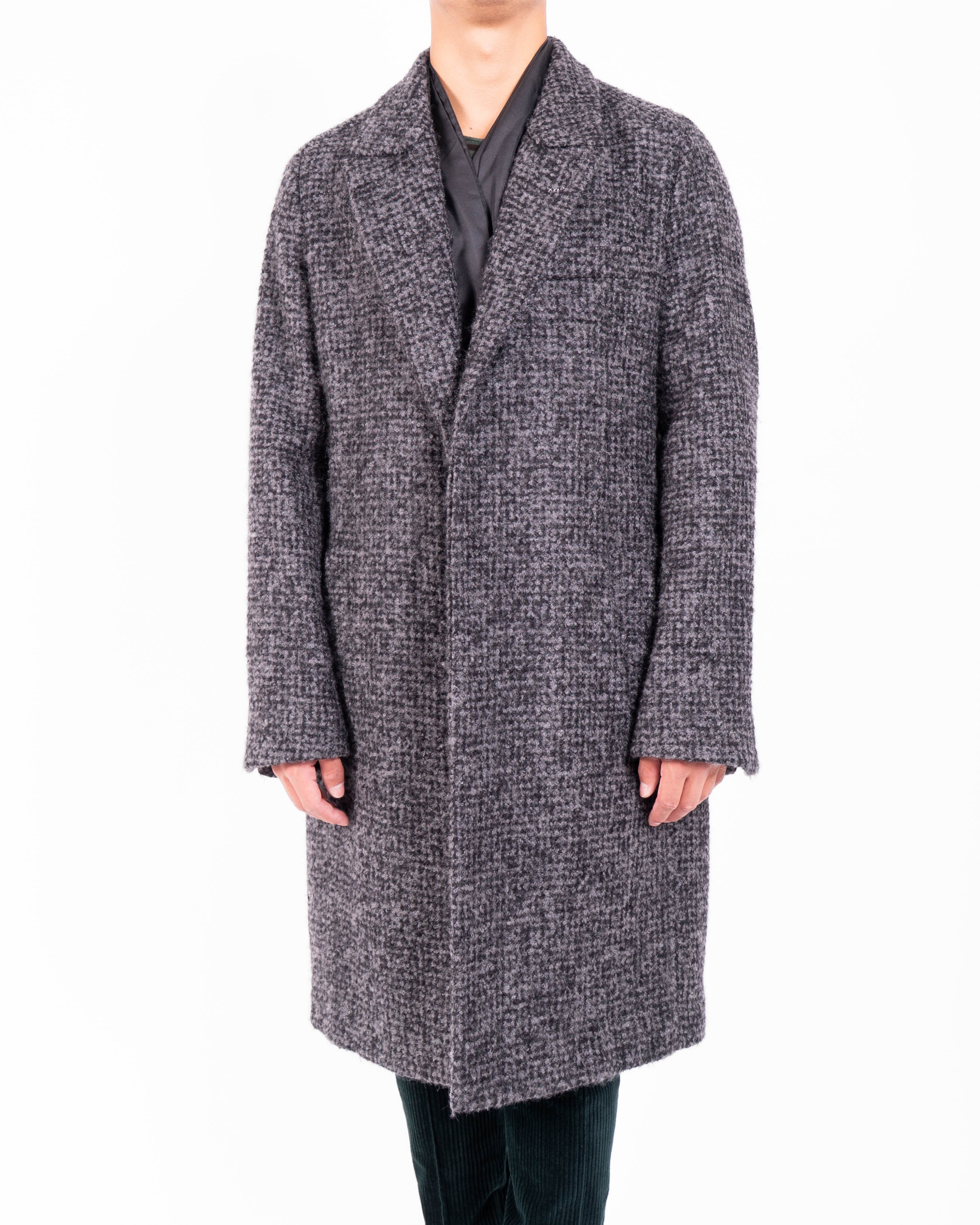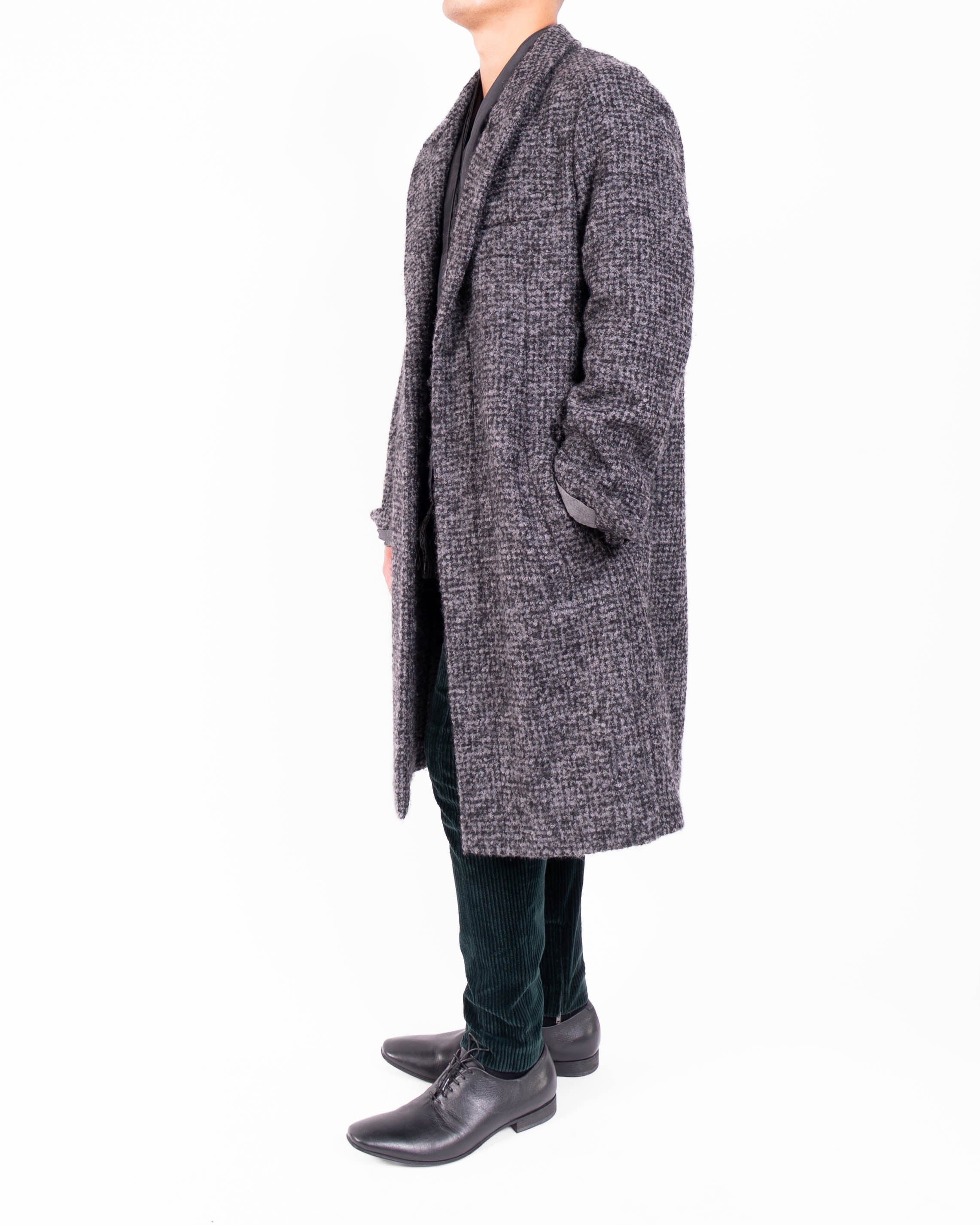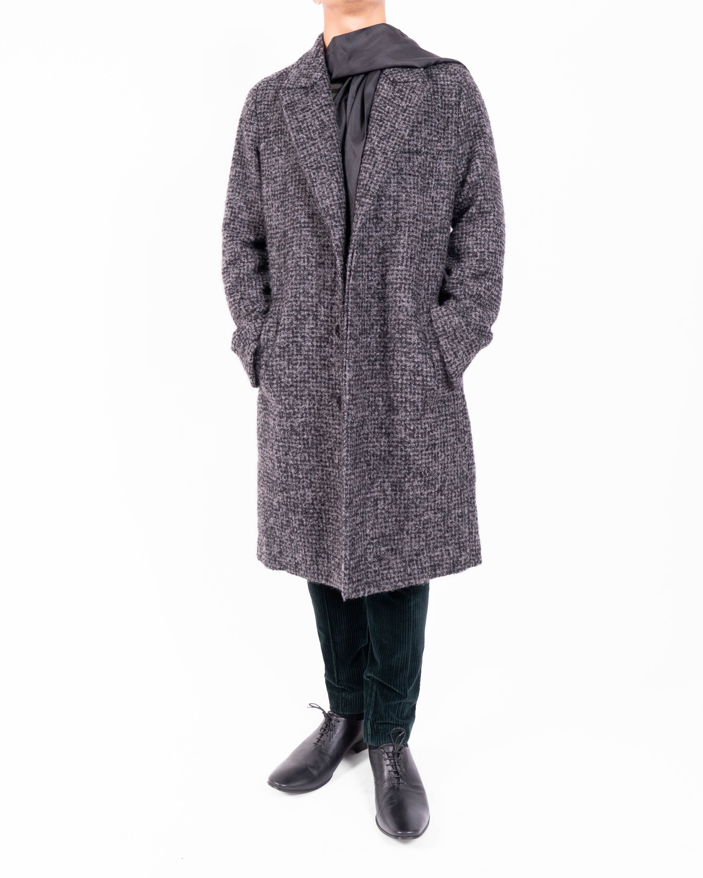 Made from grey bouclé wool in a subtle houndstooth pattern, the fabric combines depth and softness with a tactile richness. The surface texture gives the coat an understated complexity, making it both versatile and refined.