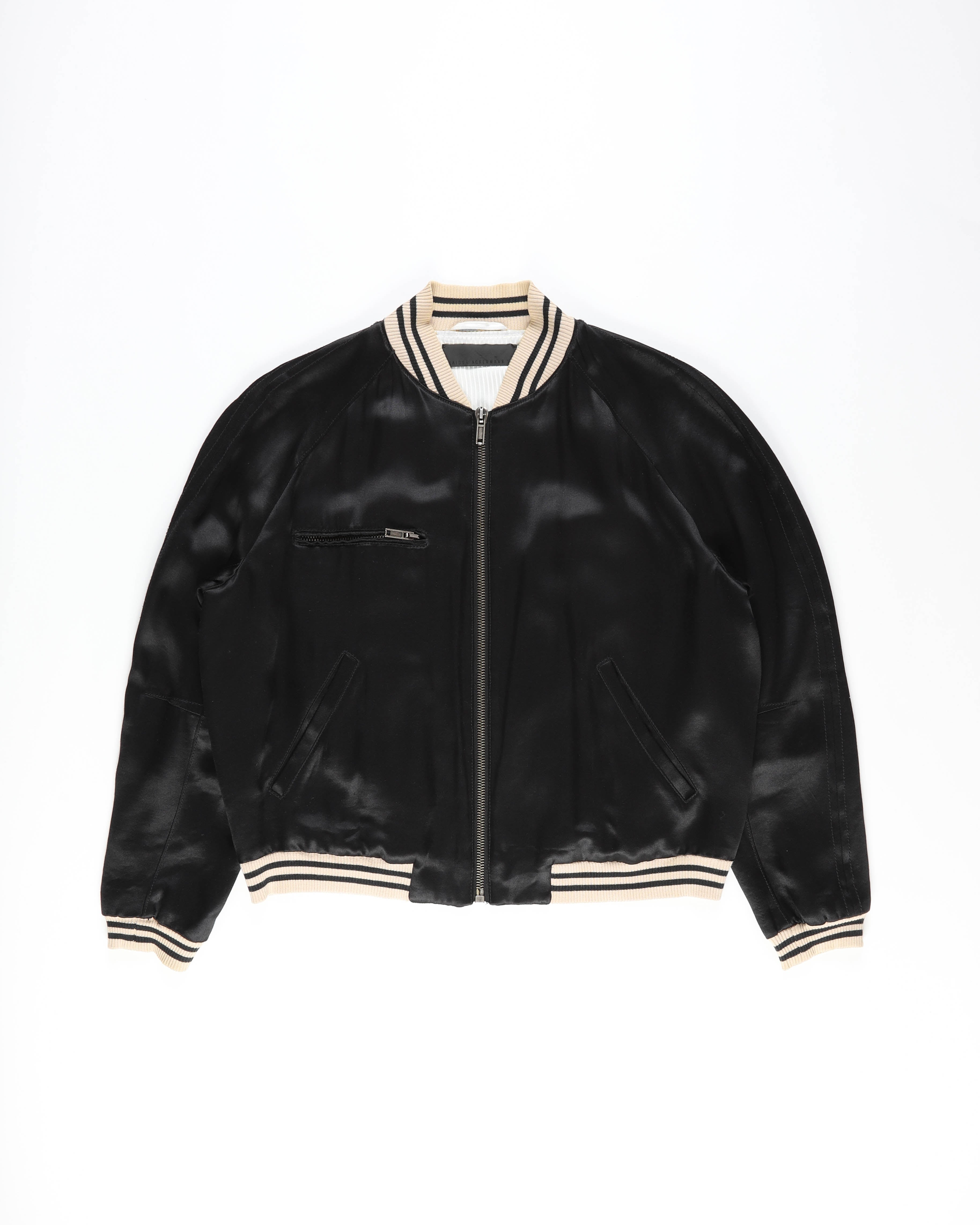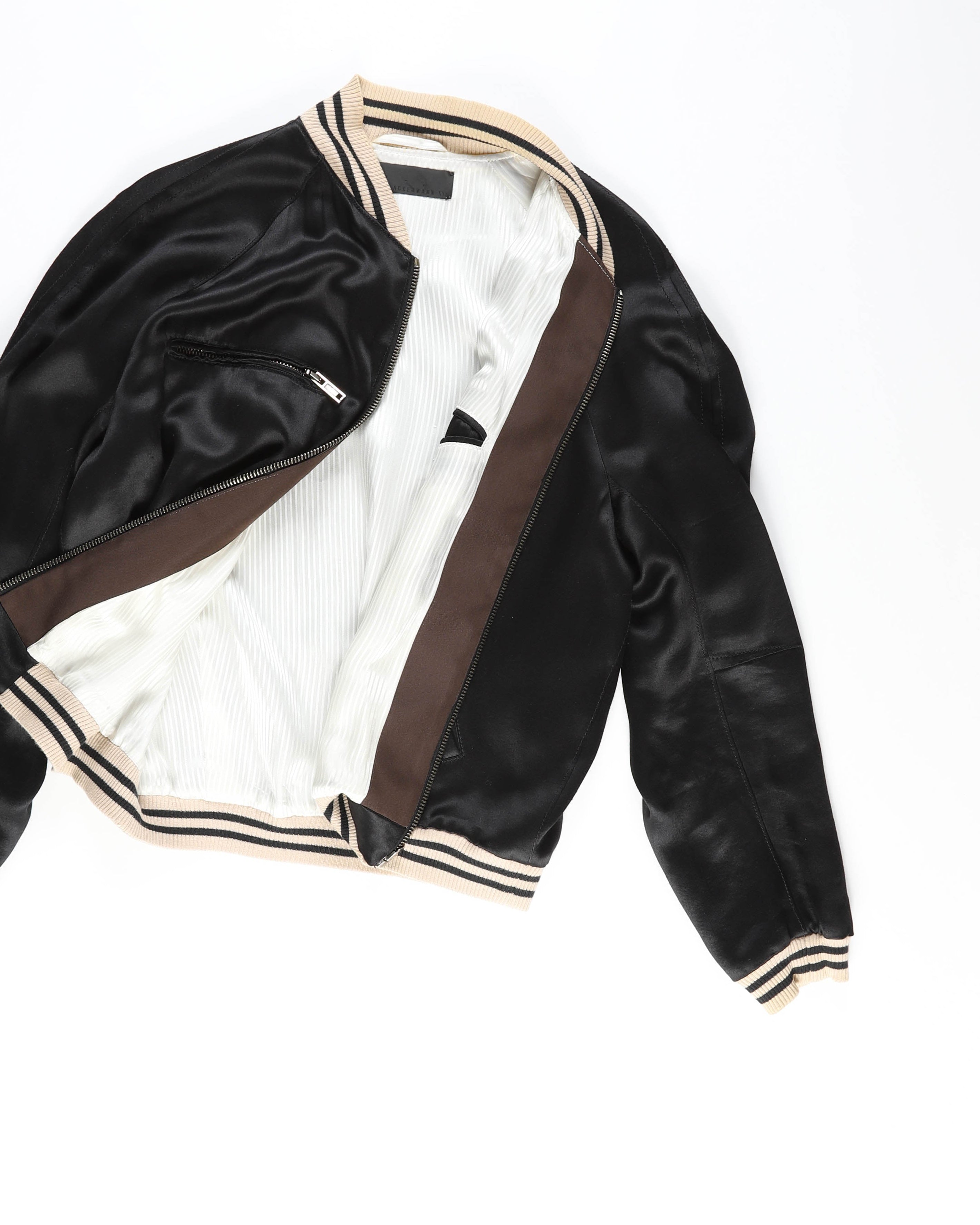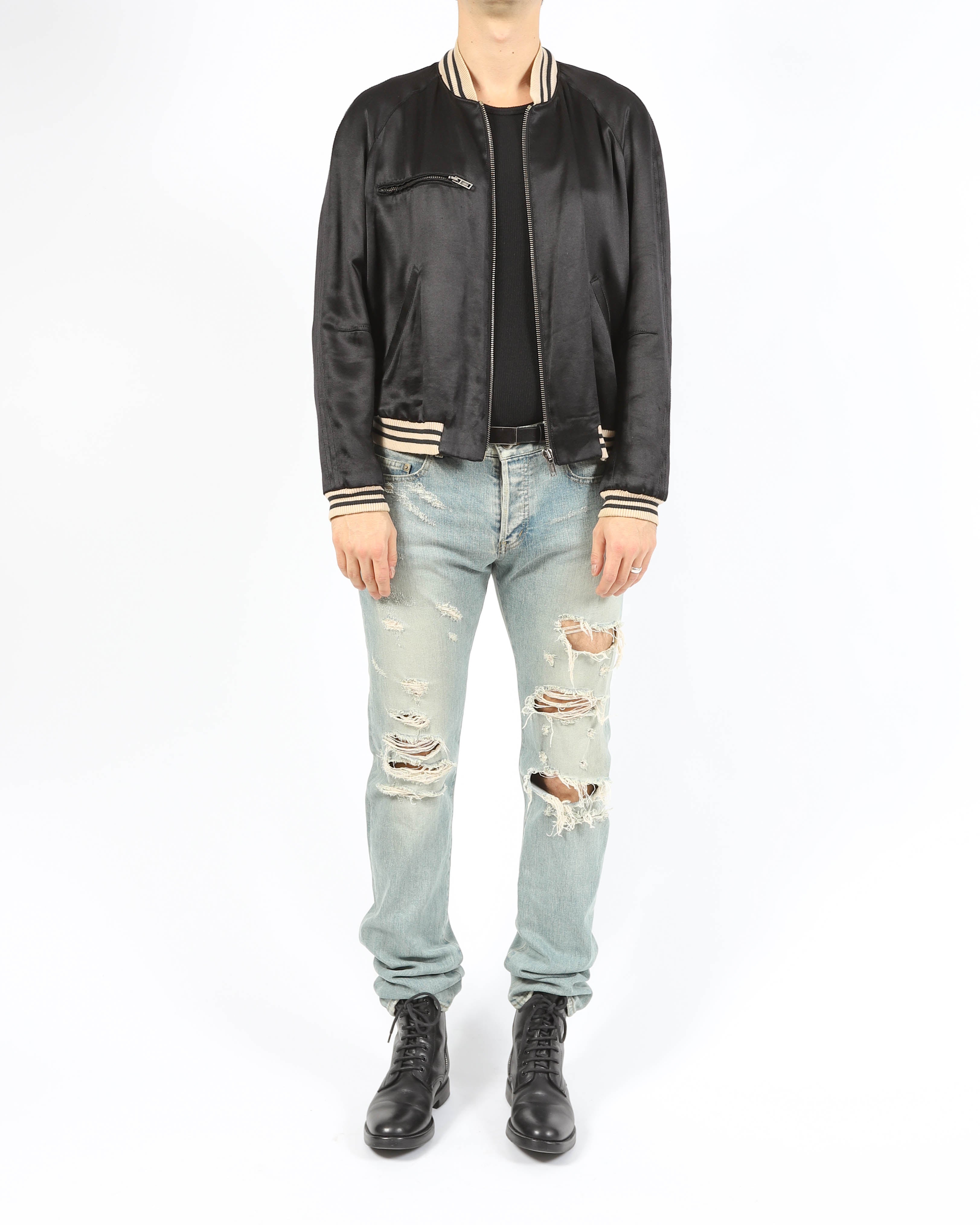 These boxy college bomber jacket from SS15 by Haider Ackermann are crafted in lustrous silk satin. The piece features a cropped silhouette and raglan sleeves that emphasize a relaxed, youthful attitude. The interior is fully lined reports note a luxurious pinstriped silk lining that contrasts subtly with the exterior.