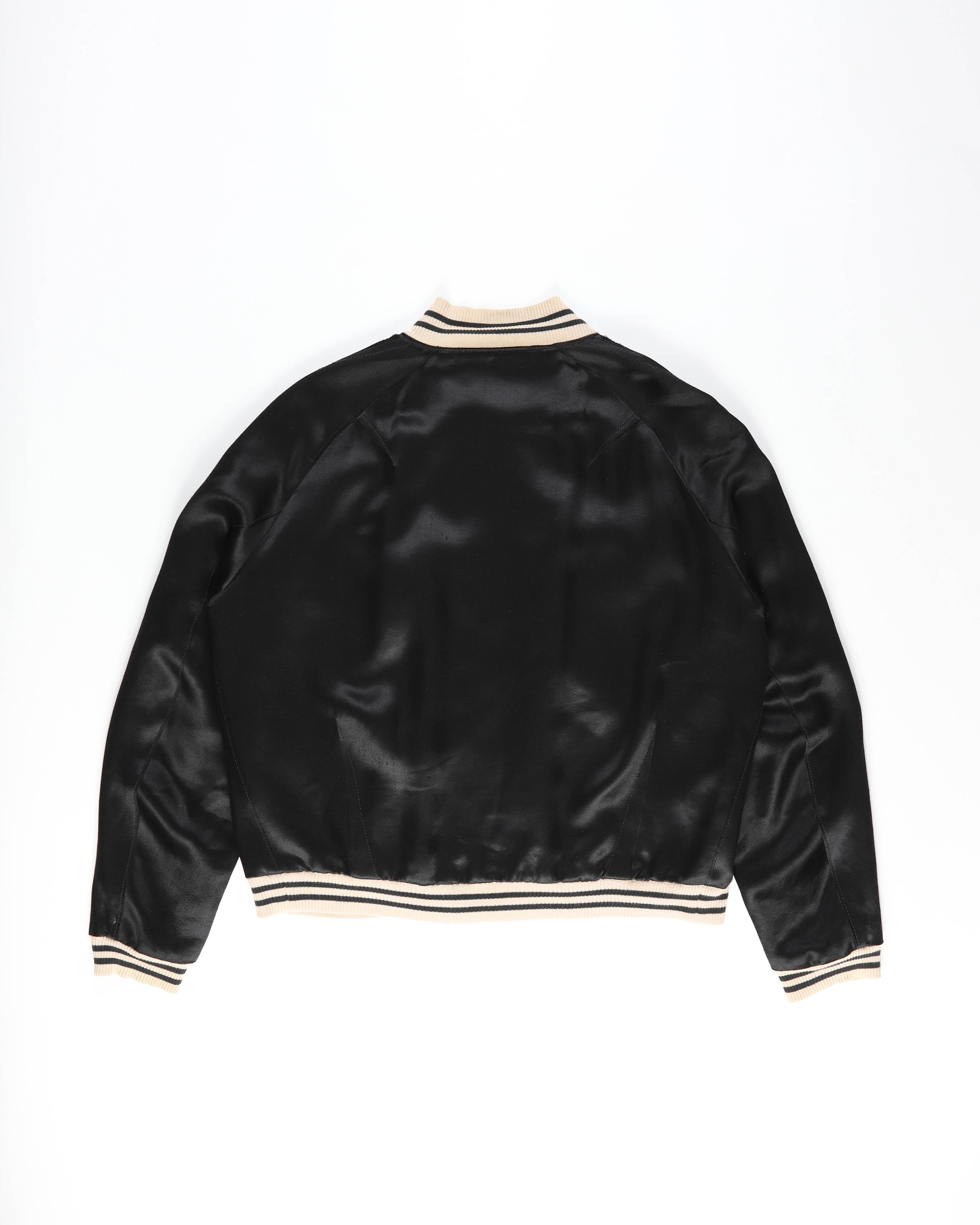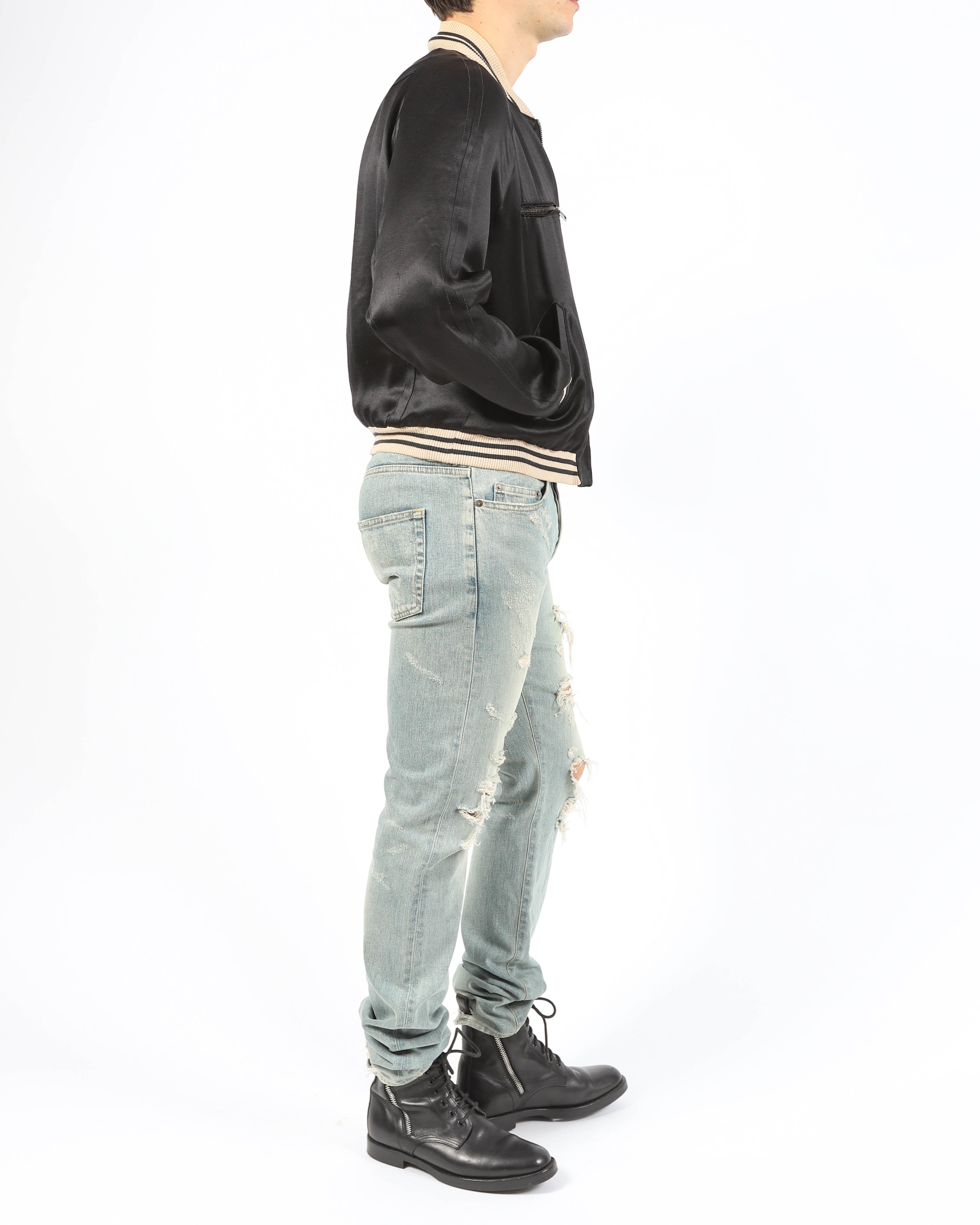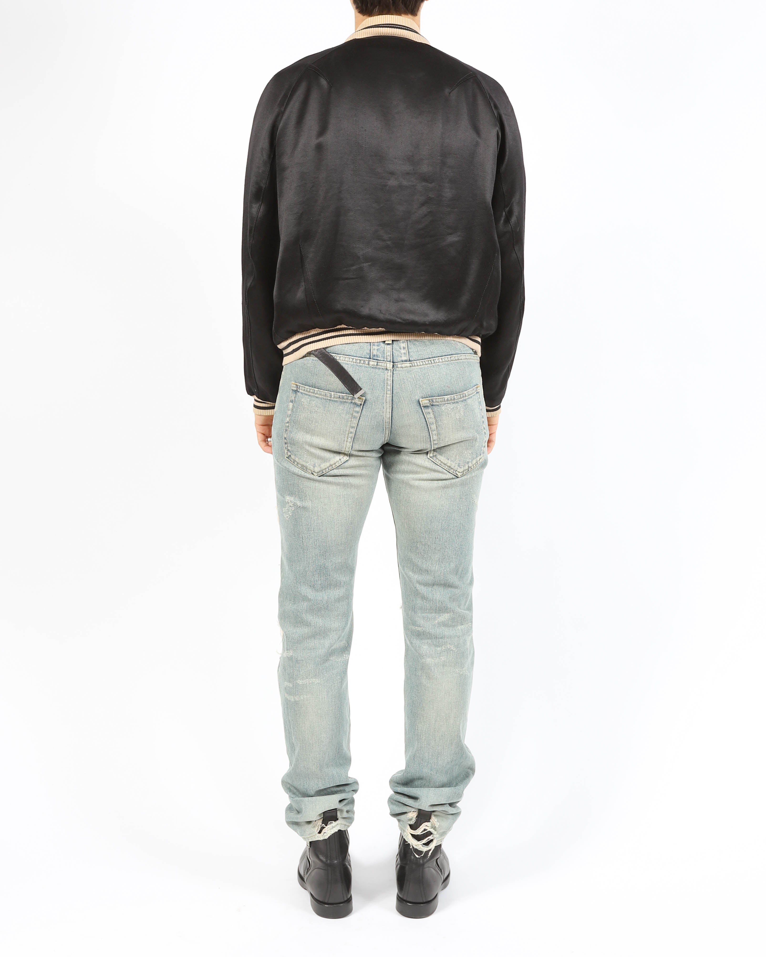 These boxy college bomber jacket from SS15 by Haider Ackermann are crafted in lustrous silk satin. The piece features a cropped silhouette and raglan sleeves that emphasize a relaxed, youthful attitude. The interior is fully lined reports note a luxurious pinstriped silk lining that contrasts subtly with the exterior.