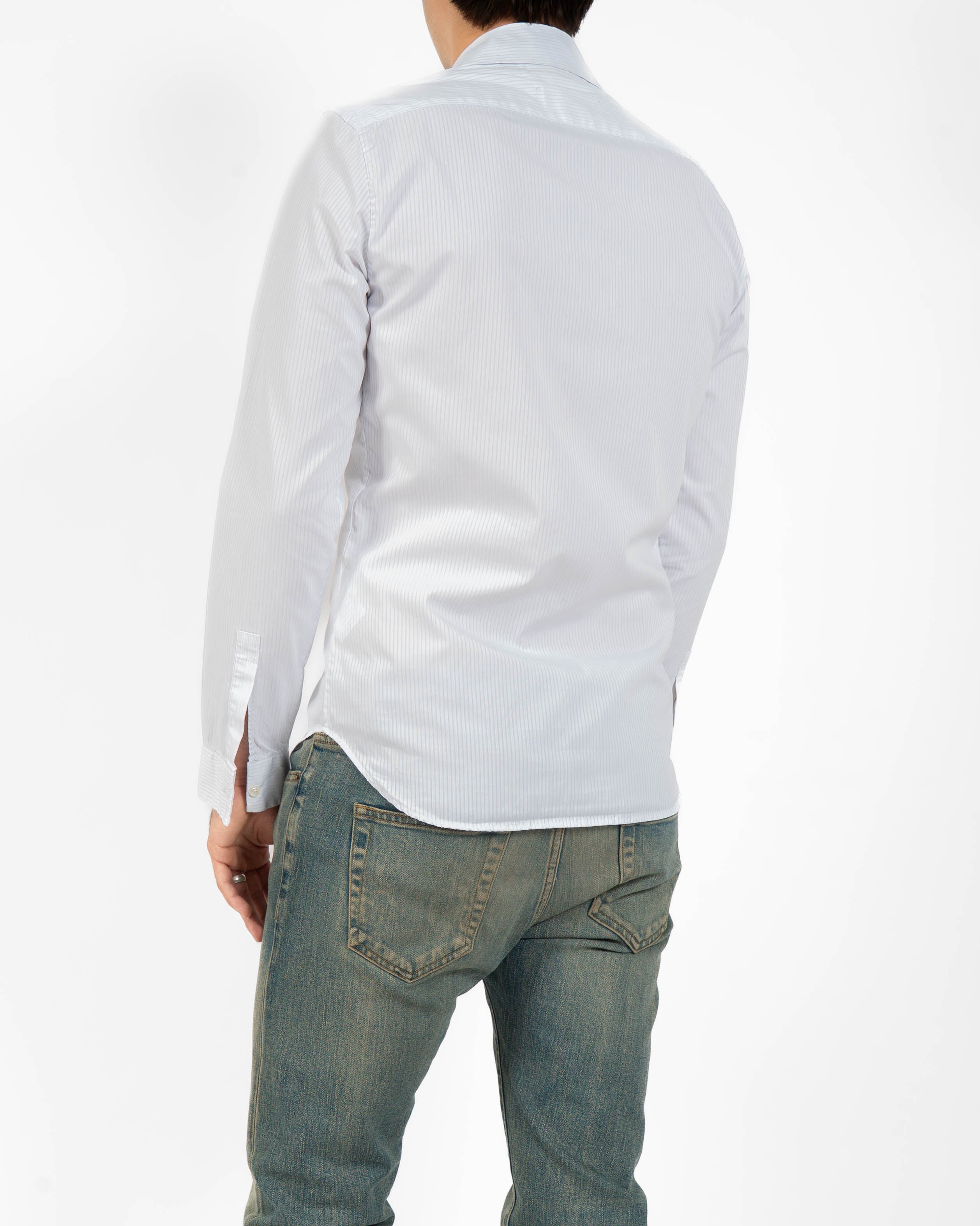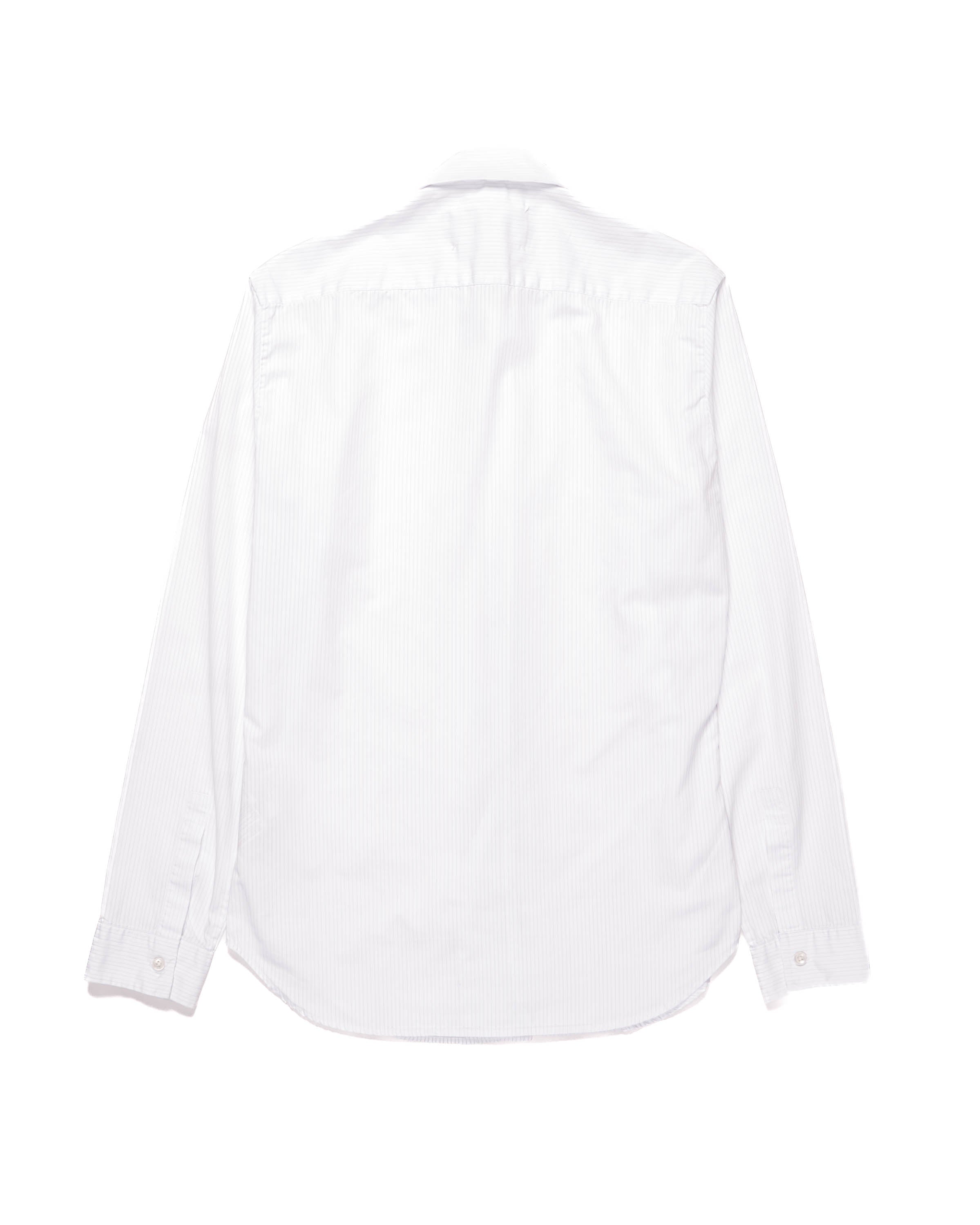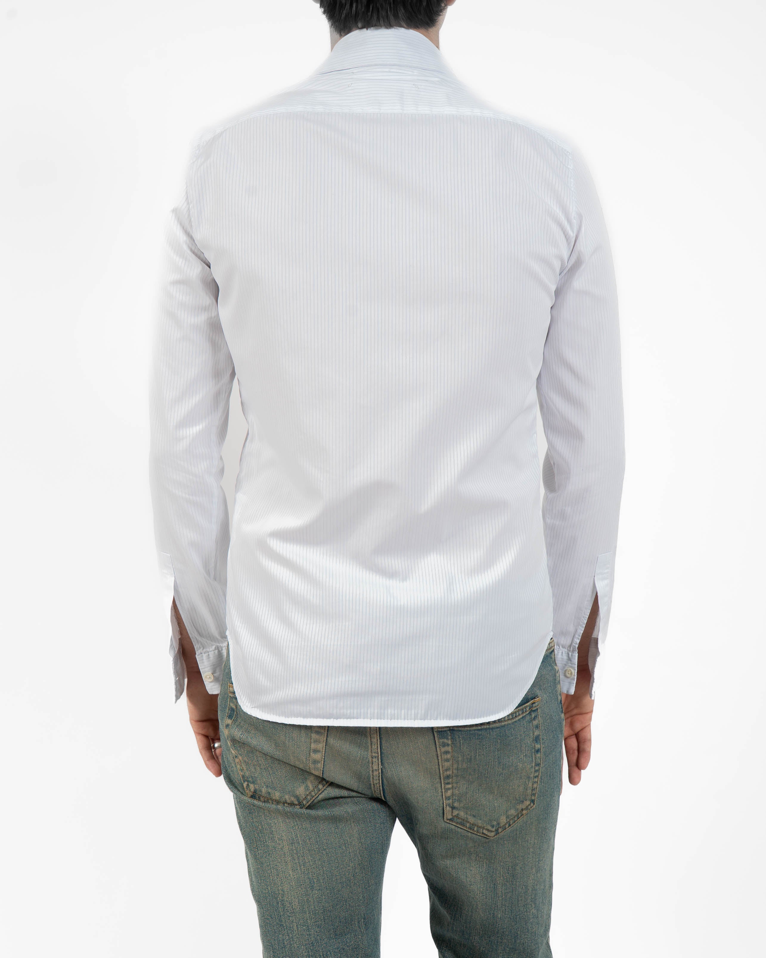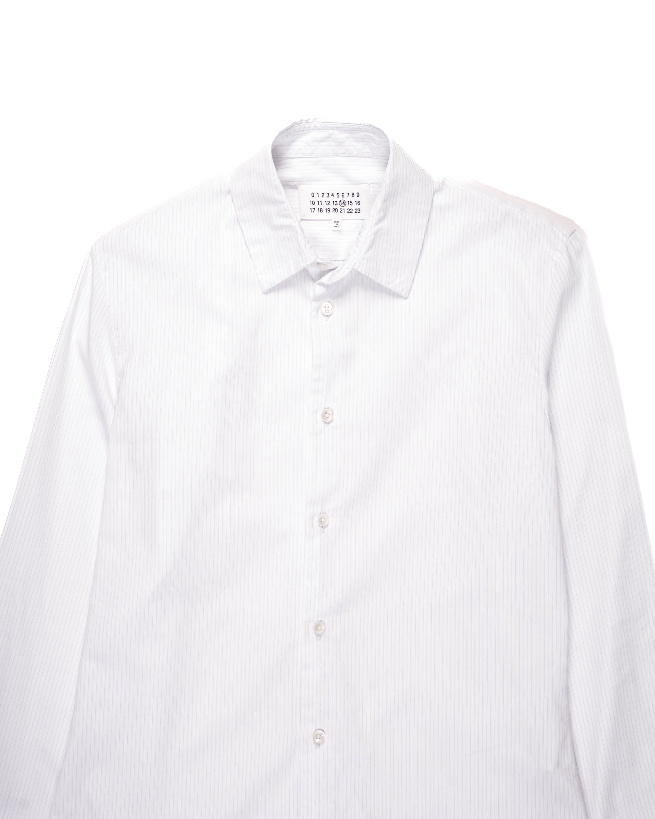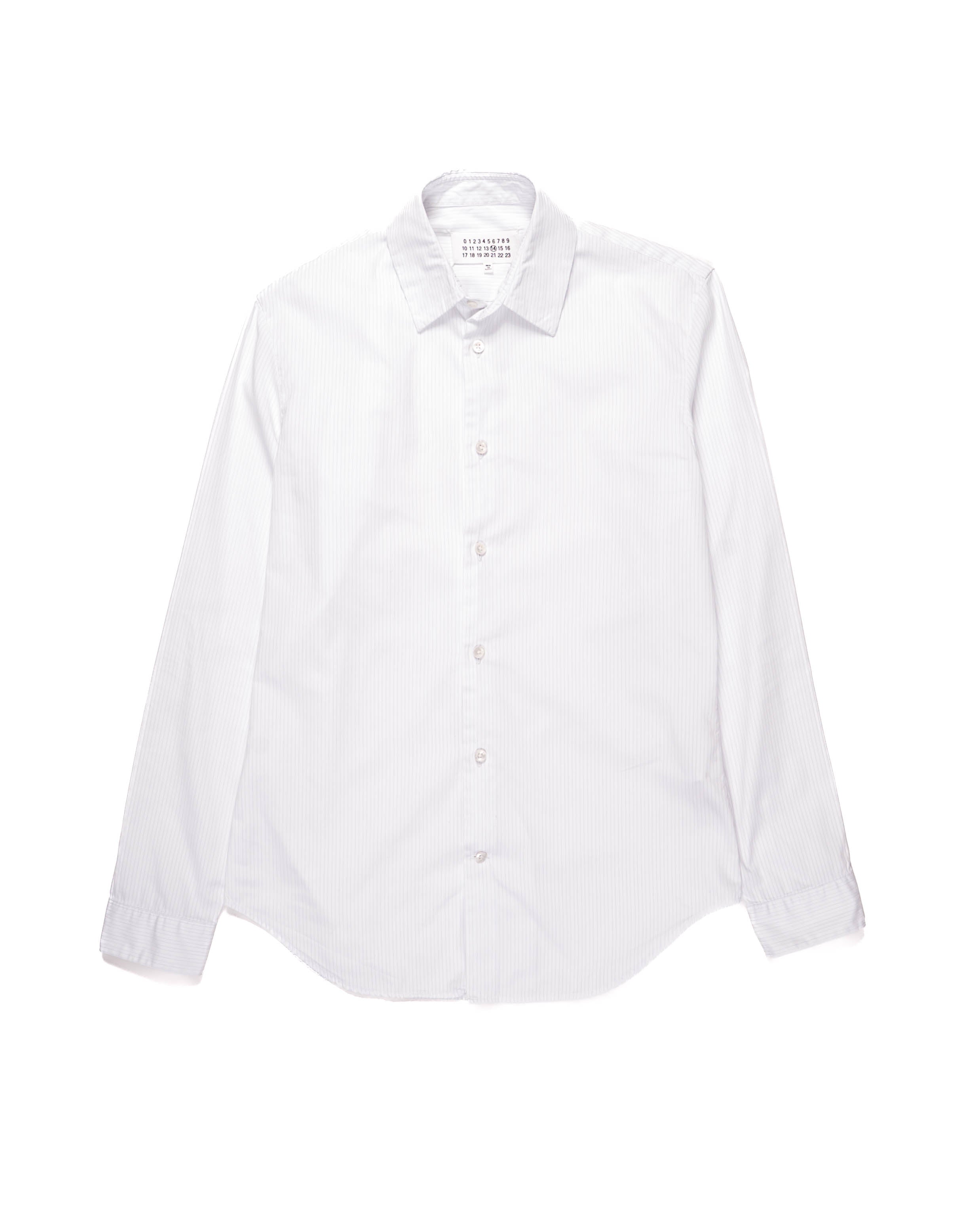 A study in quiet precision, this Maison Margiela shirt captures the label’s refined approach to wardrobe essentials. Cut from crisp striped cotton popeline, it features a sharp silhouette with subtle tailoring that emphasizes structure without stiffness. The concealed placket and minimal detailing highlight Margiela’s understated craftsmanship where clarity of form takes precedence over ornament.