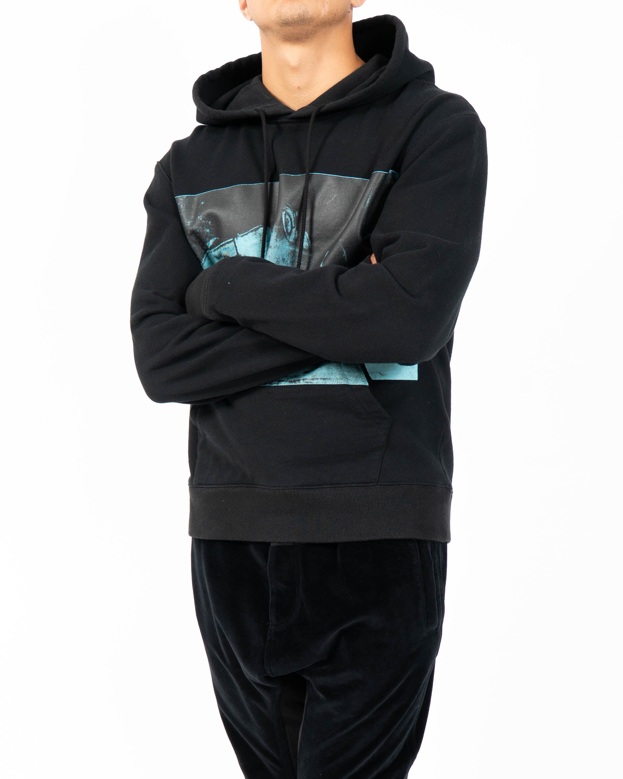 Featured in the SS18 Calvin Klein 205W39NYC collection, this hoodie integrates Andy Warhol’s Car Crash print into a casual silhouette. The stark black cotton base sets a backdrop for the turquoise toned print, merging pop art with streetwear ease.