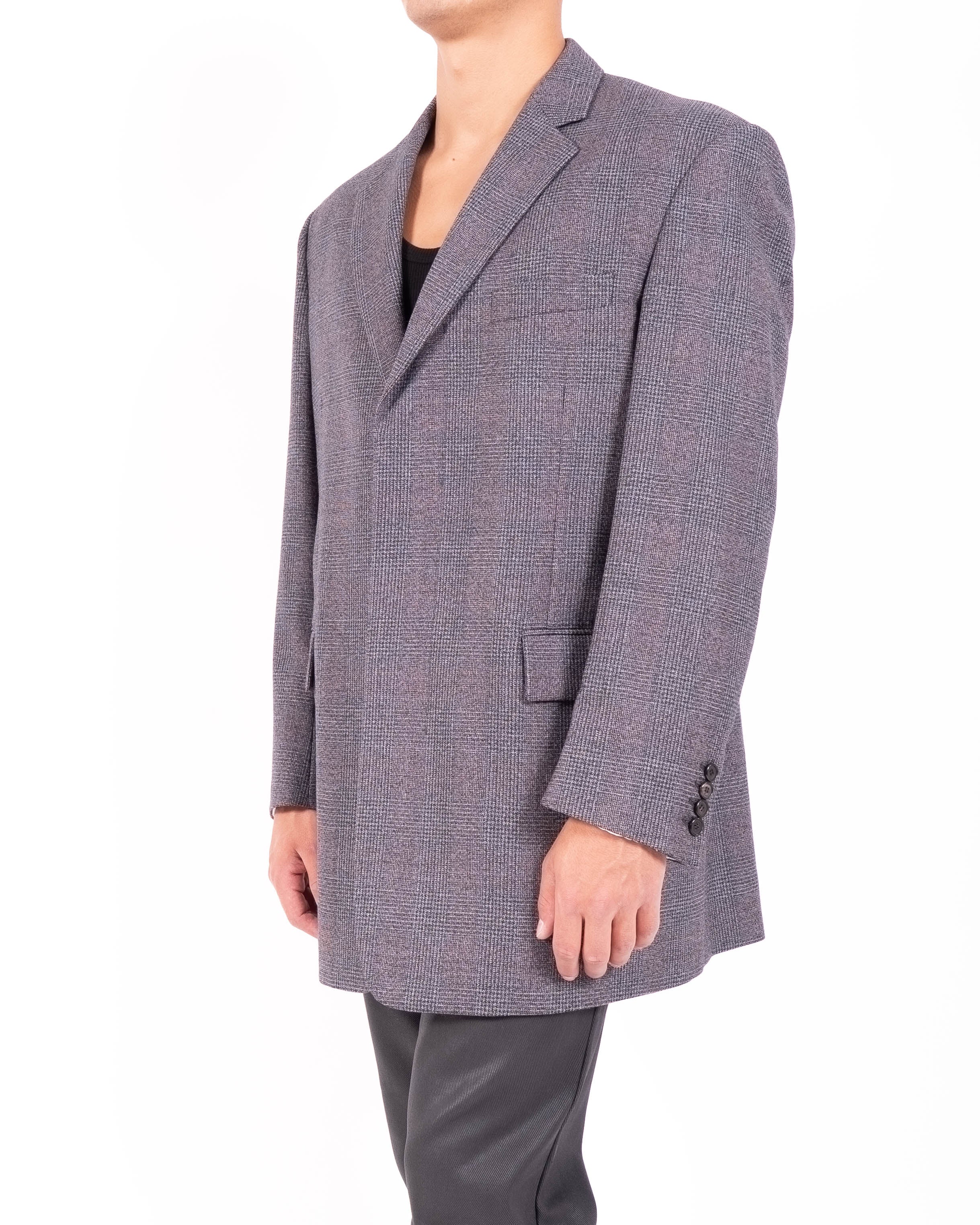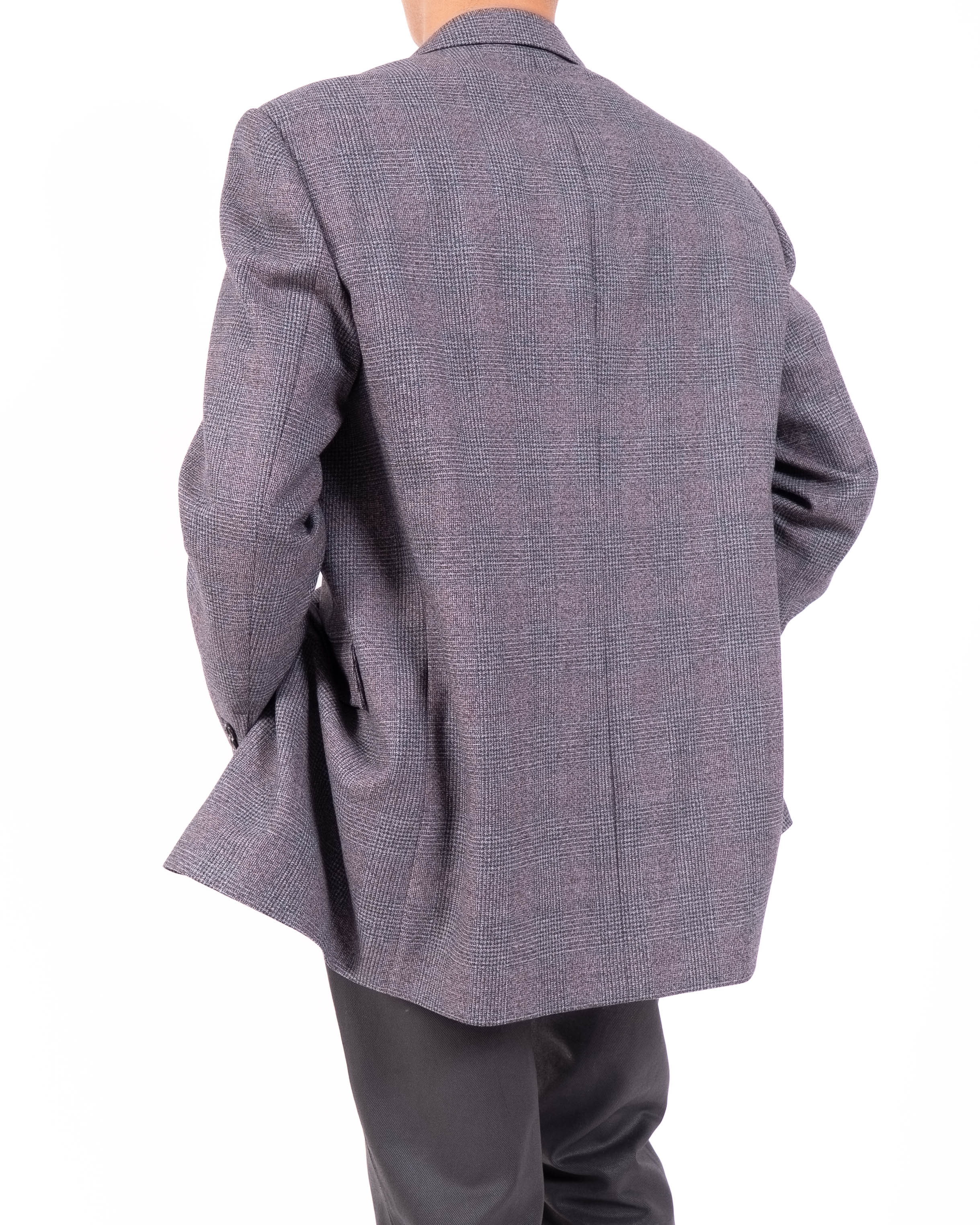 Crafted from checked grey wool, the fabric brings a traditional menswear pattern into a more contemporary frame. The lightly padded shoulders and elongated lines emphasize structure, while the relaxed fit softens the overall presence, striking a balance between discipline and ease.
