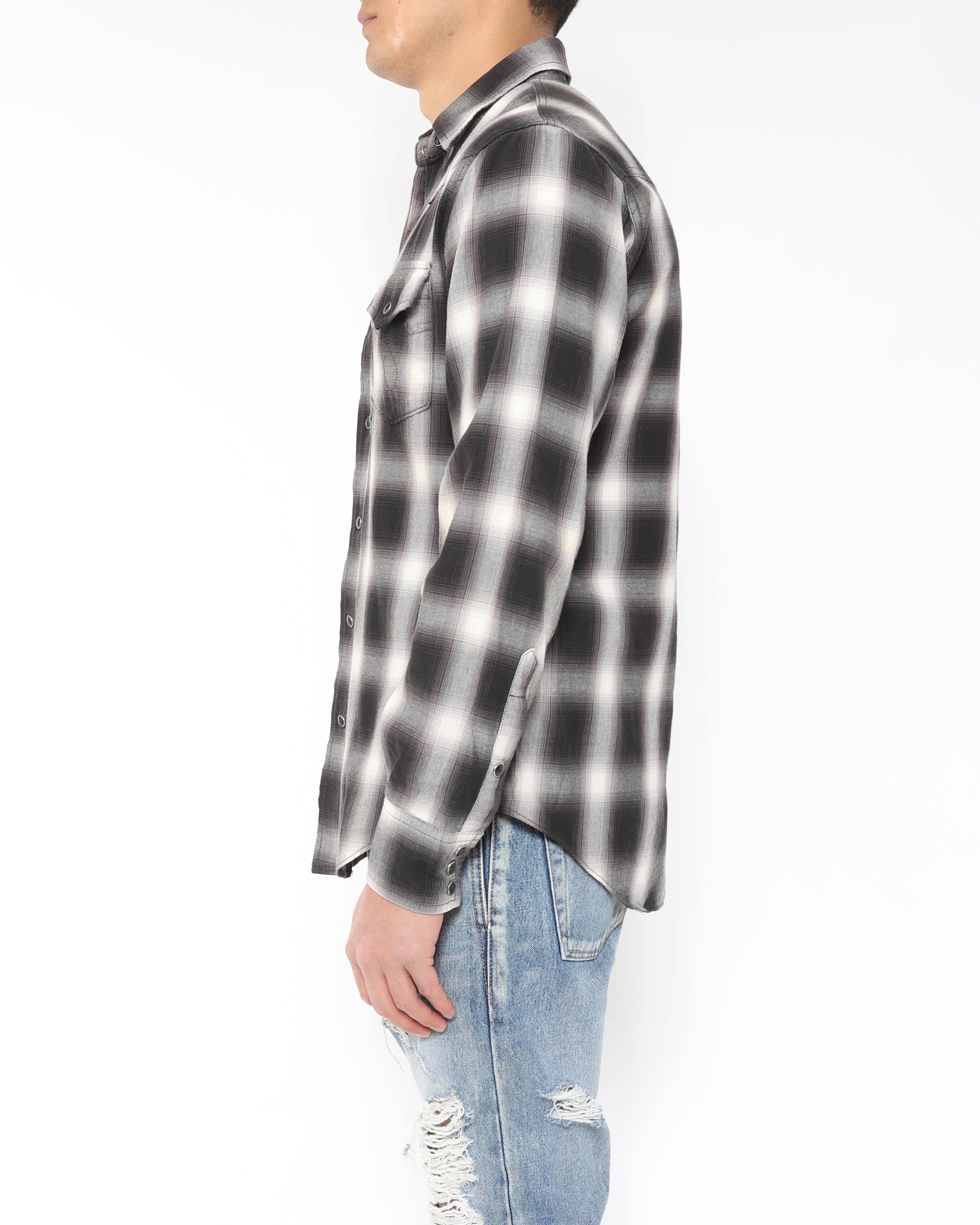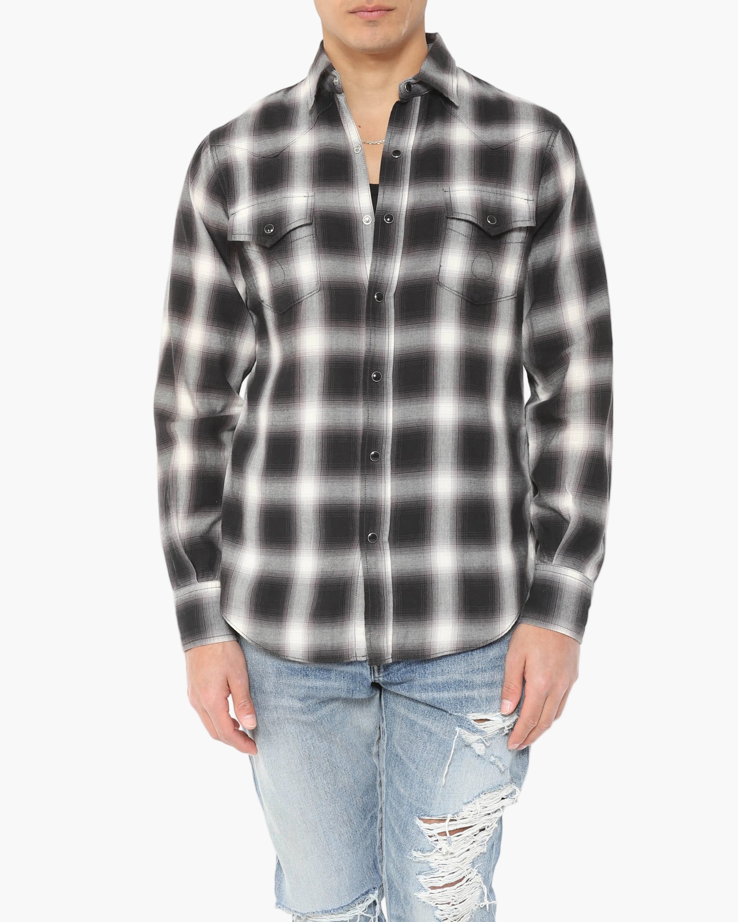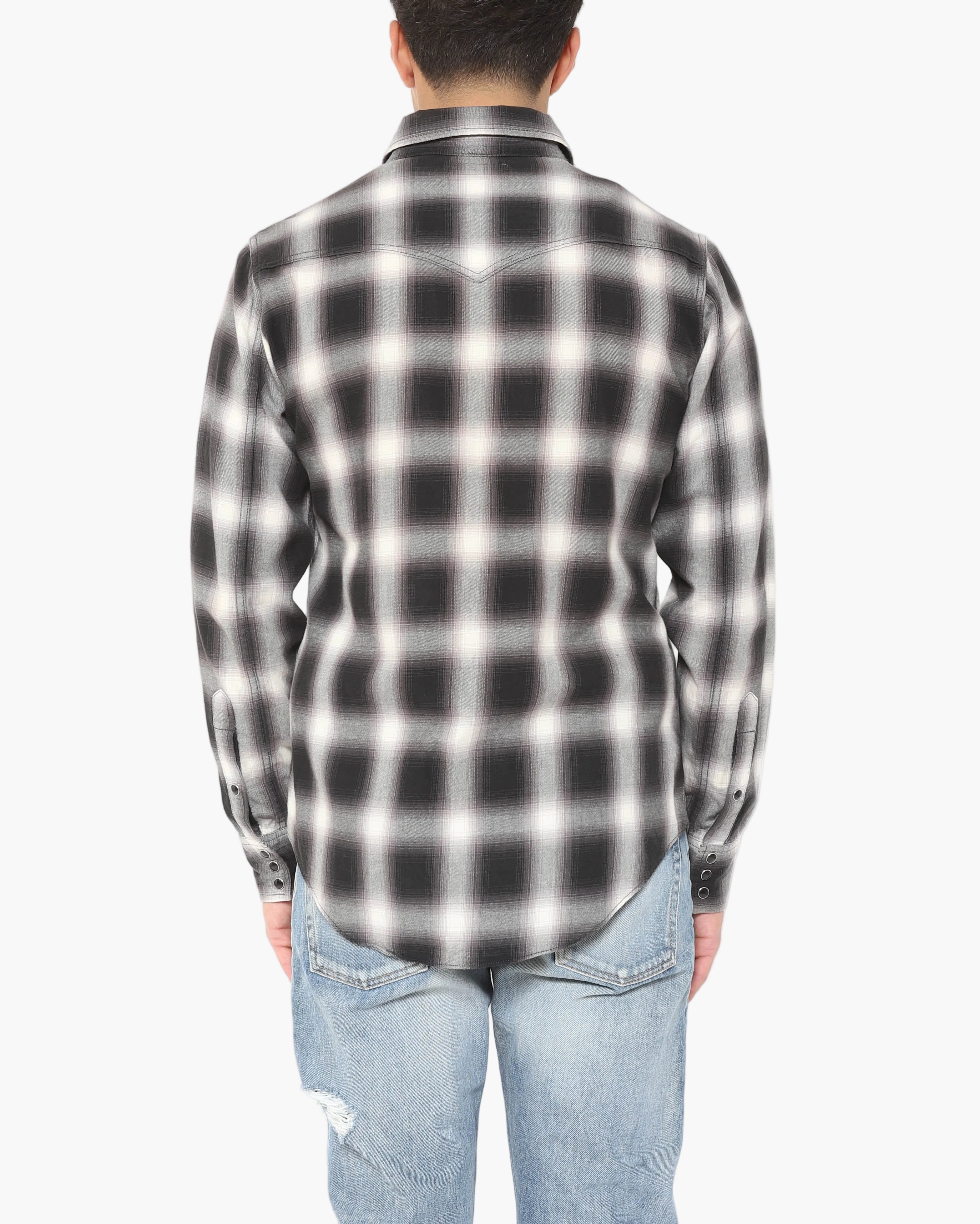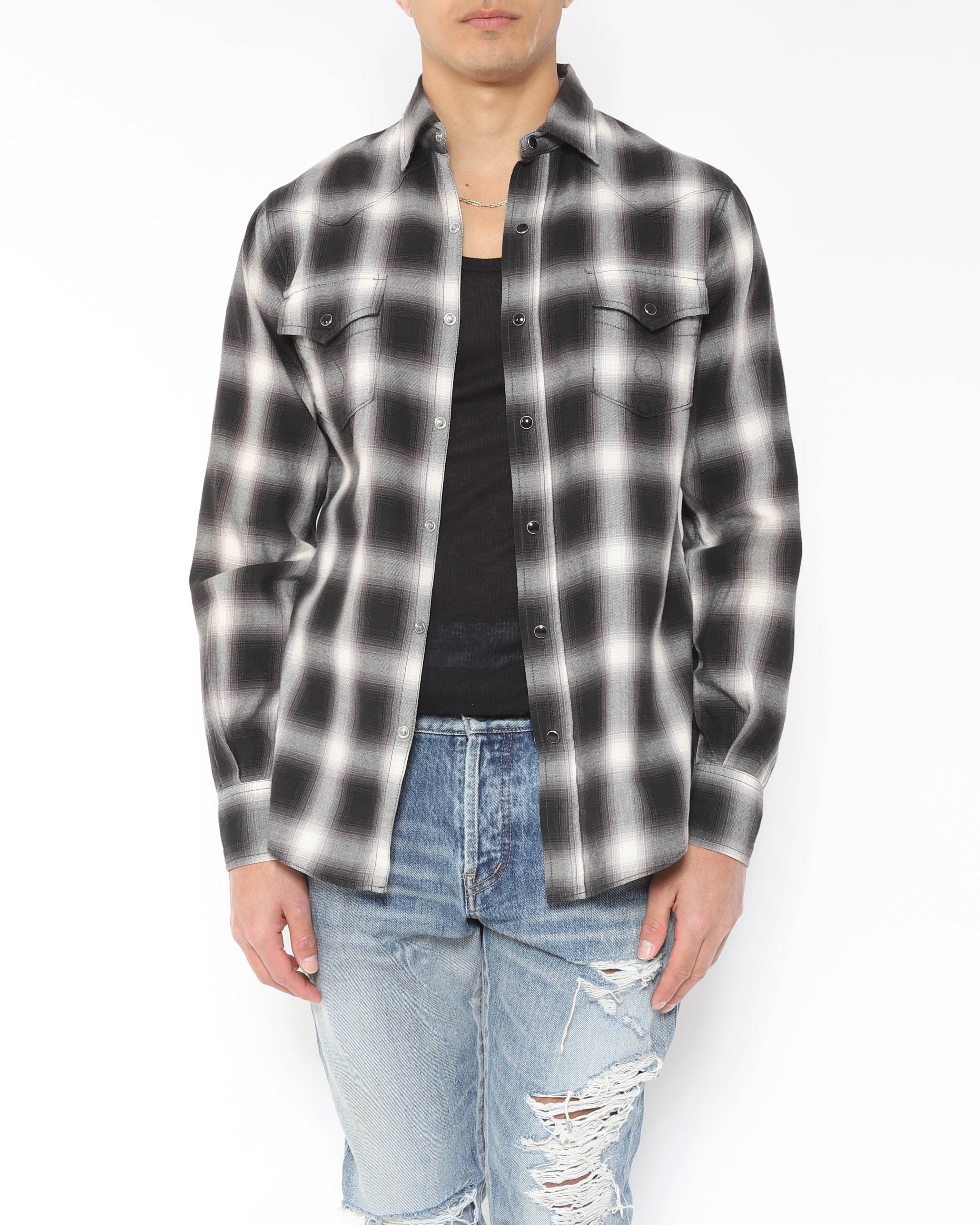 Signature elements like the pointed yoke, snap button closure, and chest pockets stay true to the western reference, while the overall execution remains clean and restrained. A straightforward piece that balances heritage influence with Saint Laurent’s precise approach to shirting.
