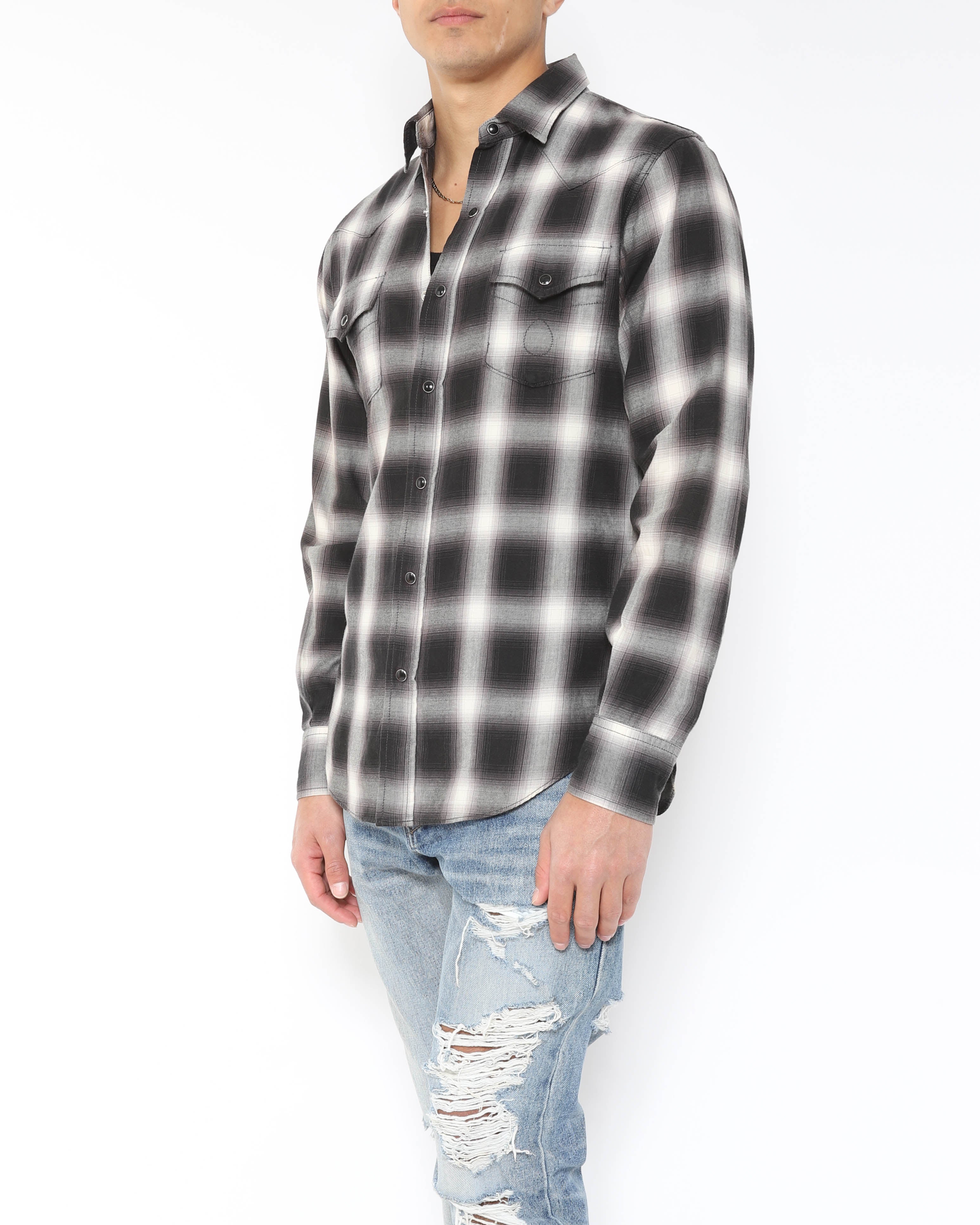 This classic western shirt by Haider Ackermann is defined by its sharp black and white contrast and traditional western detailing. The cut is straight and relaxed, giving it an easy, wearable shape without feeling oversized.