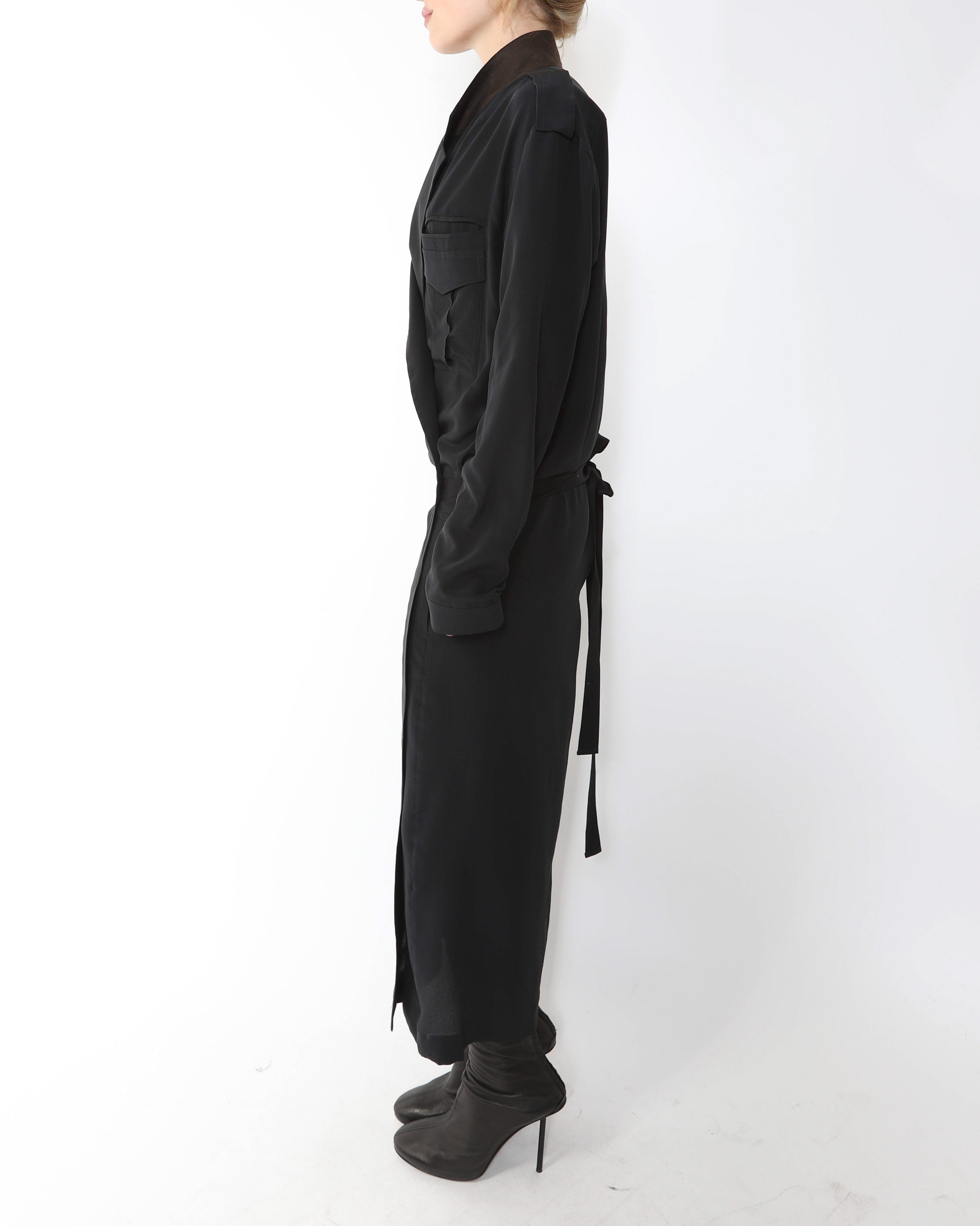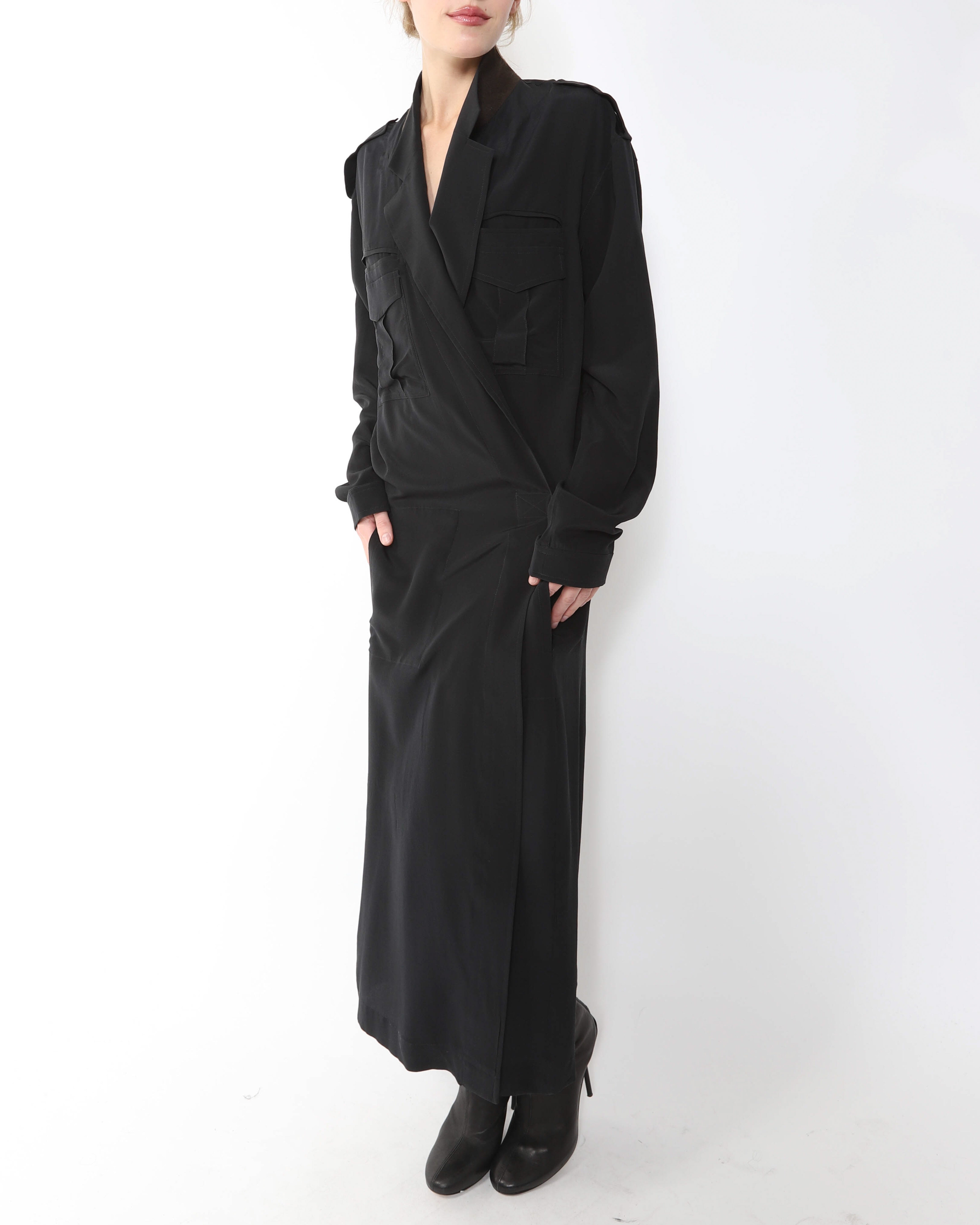 In this FW14 kimono dress, Haider Ackermann channels utilitarian codes into something quietly poetic. Cut from black silk, the silhouette drapes with robe like ease, while pocket detailing adds a subtle, functional edge that keeps it grounded. The piece captures a signature Ackermann tension: softness paired with discipline, sensuality tempered by control. Elegant without feeling precious, it reads as modern armor in fluid form, understated yet deeply intentional.