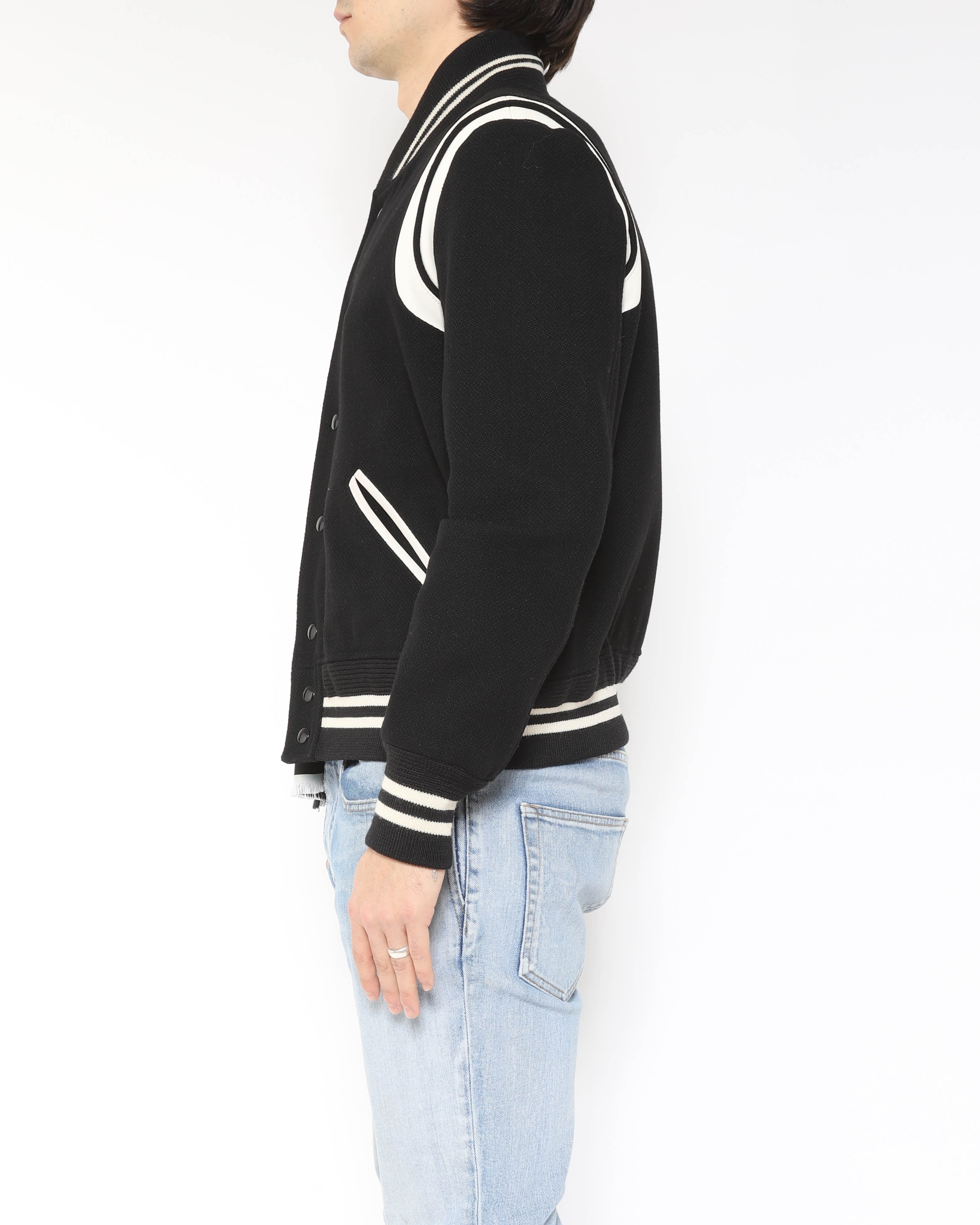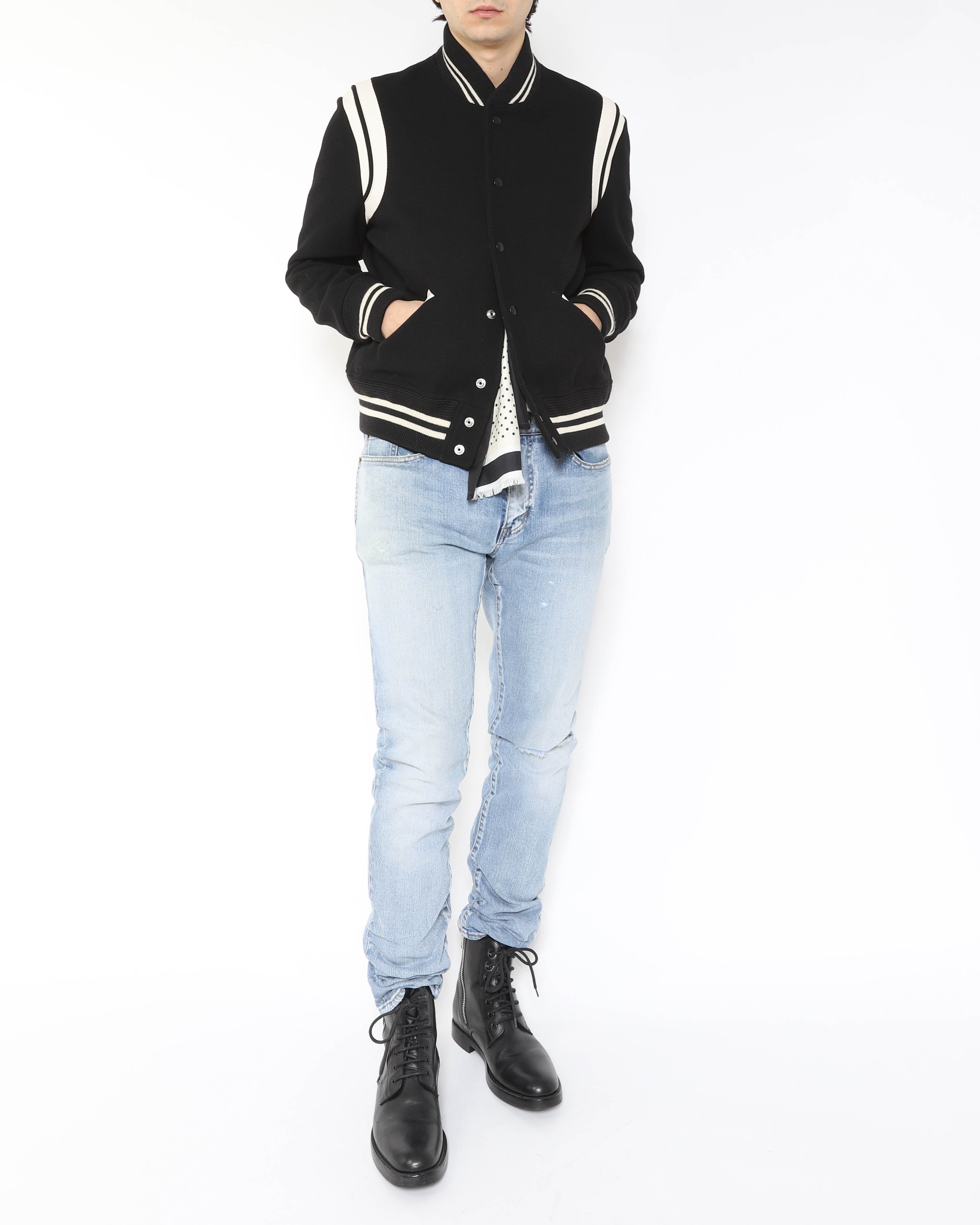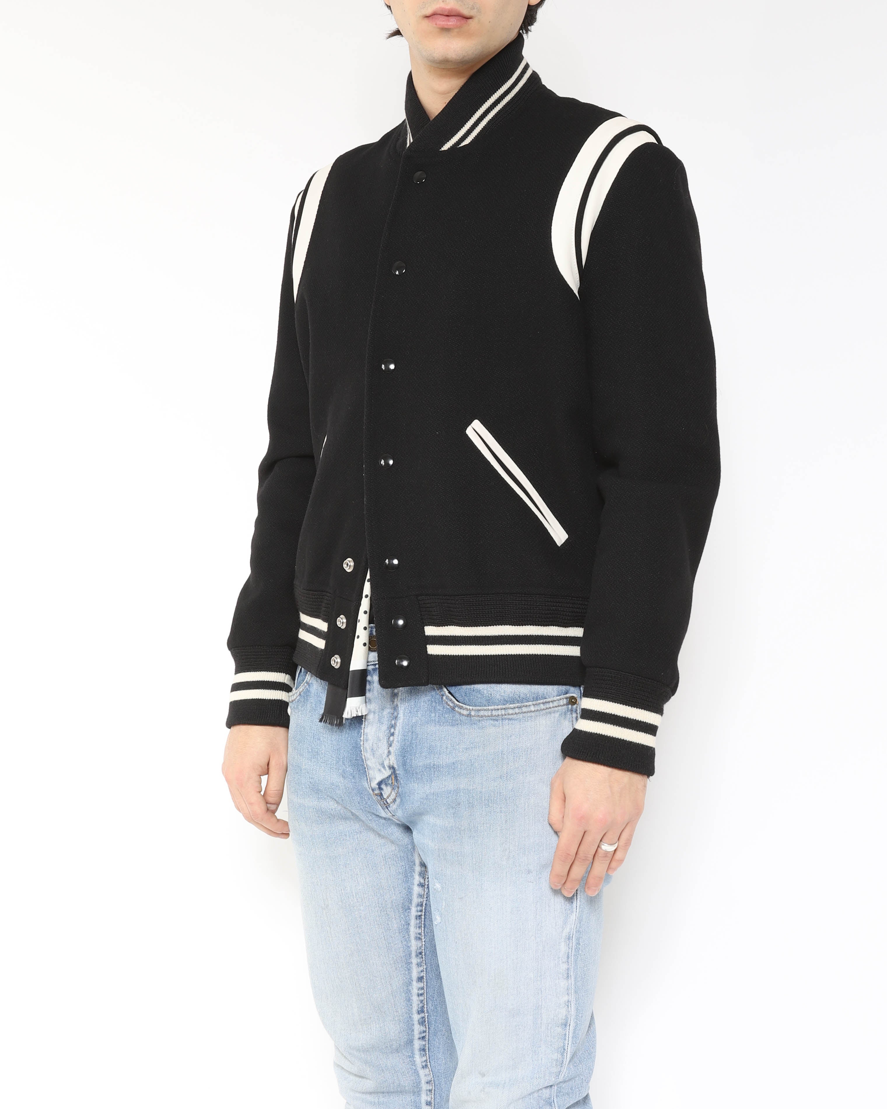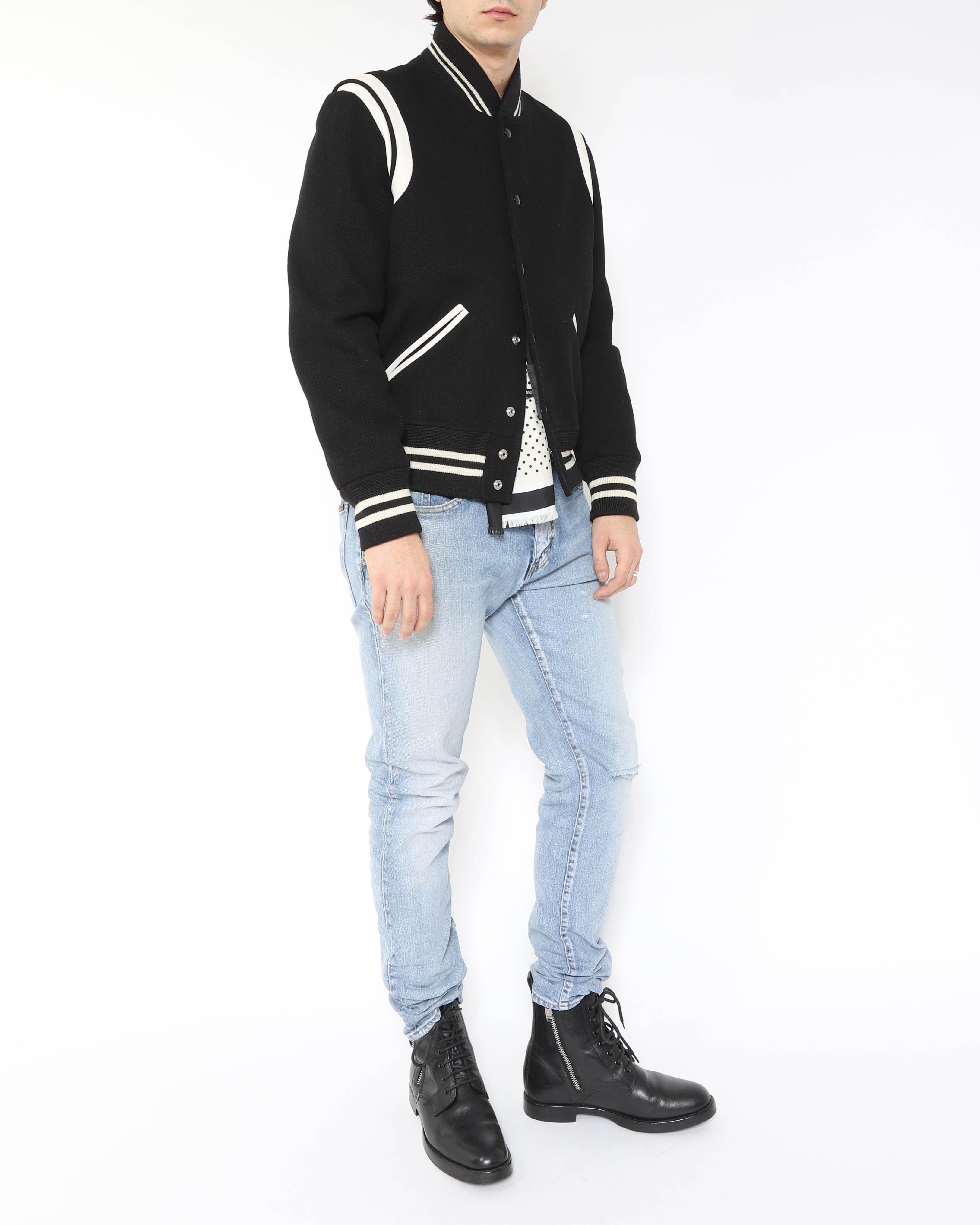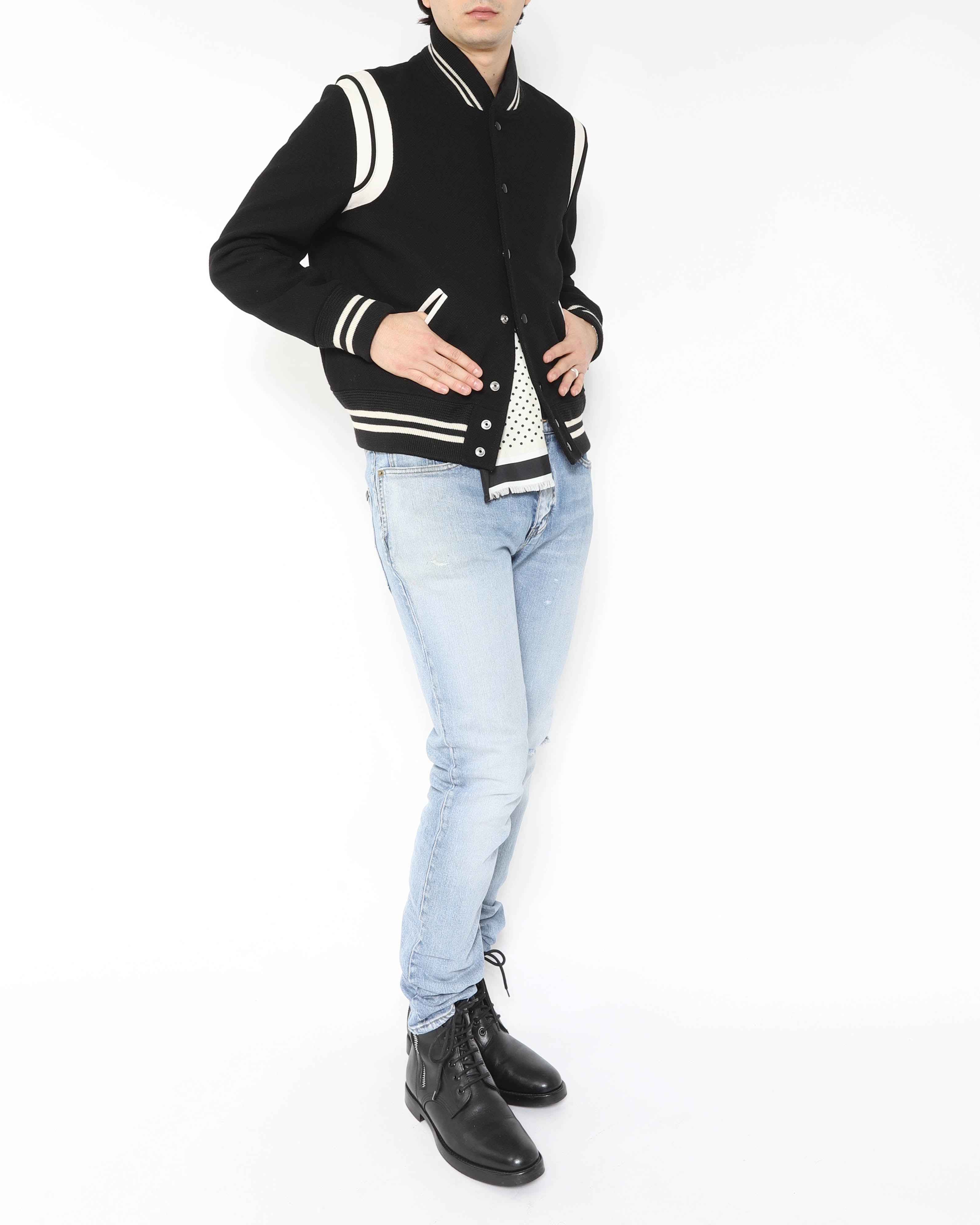 The jacket captures Saint Laurent’s sharp, youthful energy from the era. The silhouette is slim and slightly cropped, sitting close to the body with a clean, structured shoulder line. Ribbed trims at the collar, cuffs, and hem reinforce the classic varsity language, while the textured wool exterior, luxurious silk lining, and high-quality leather detailing elevate it with a refined finish.