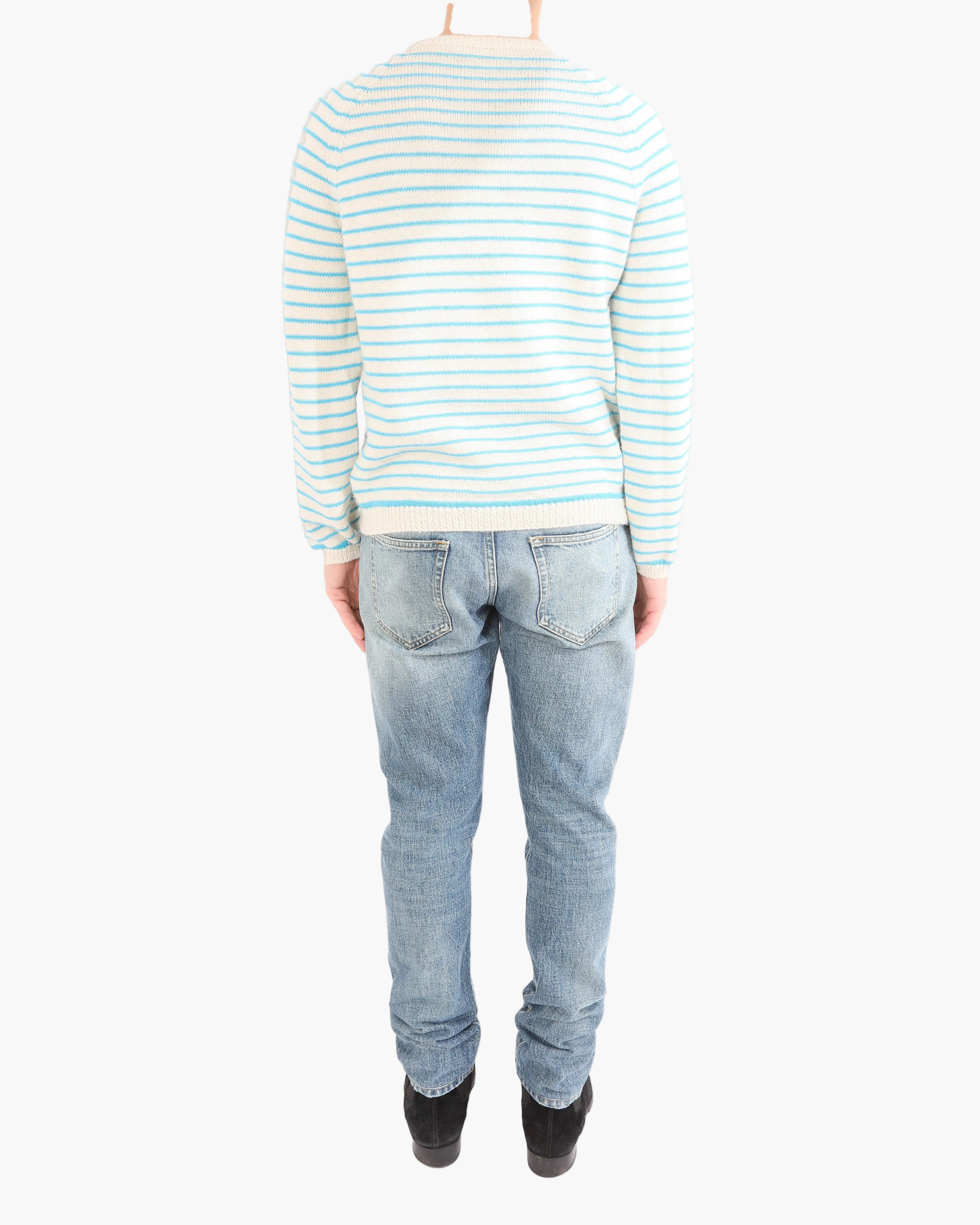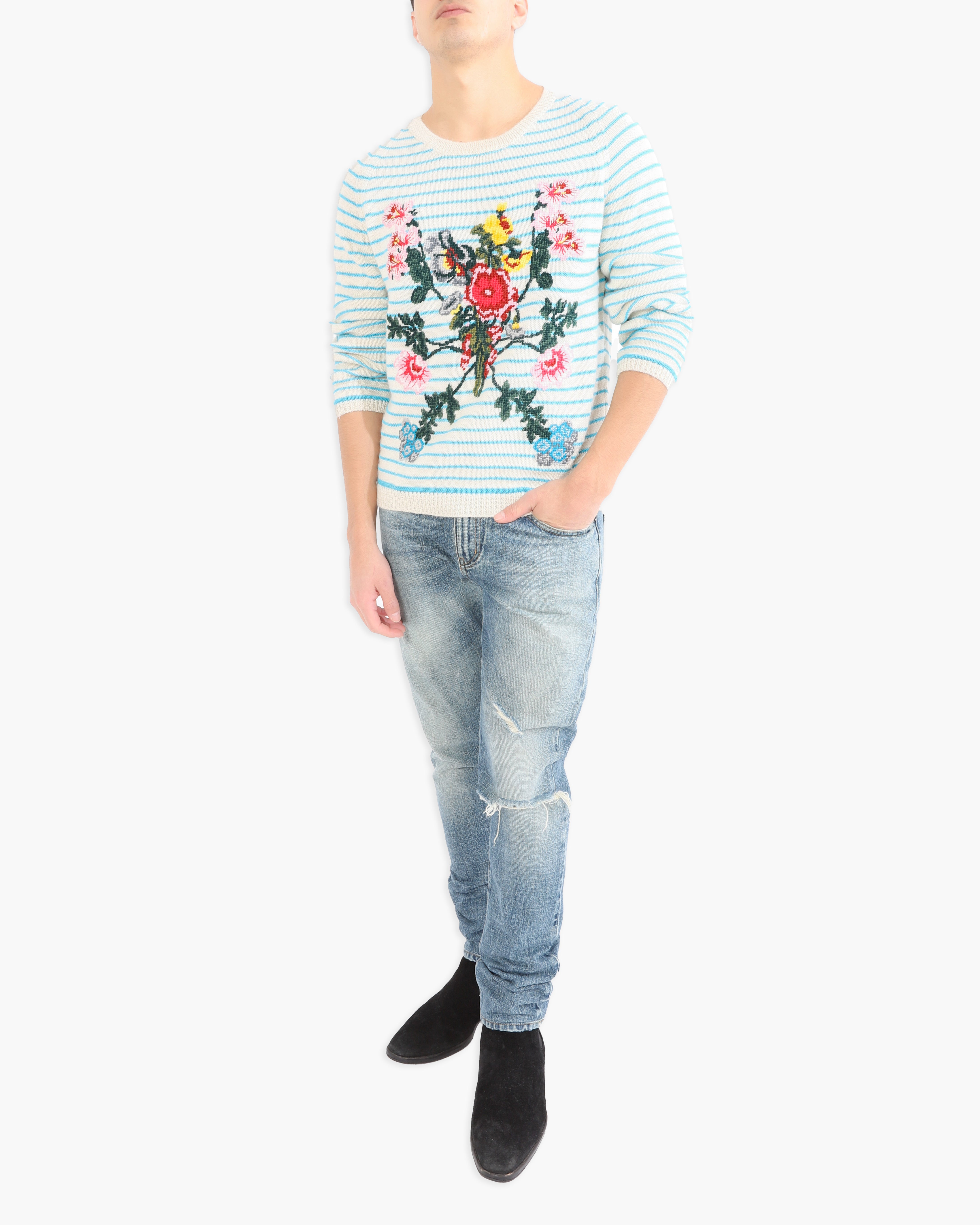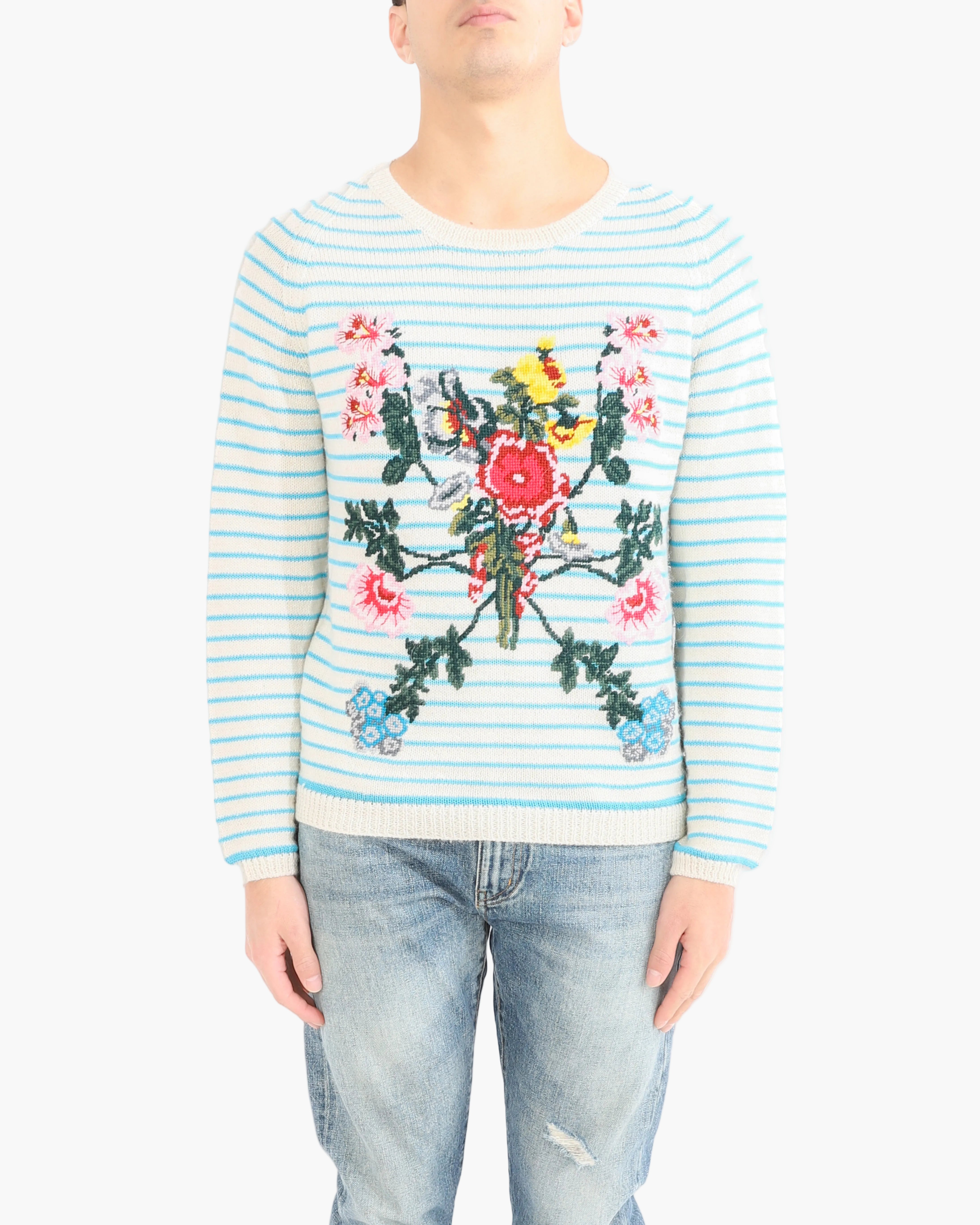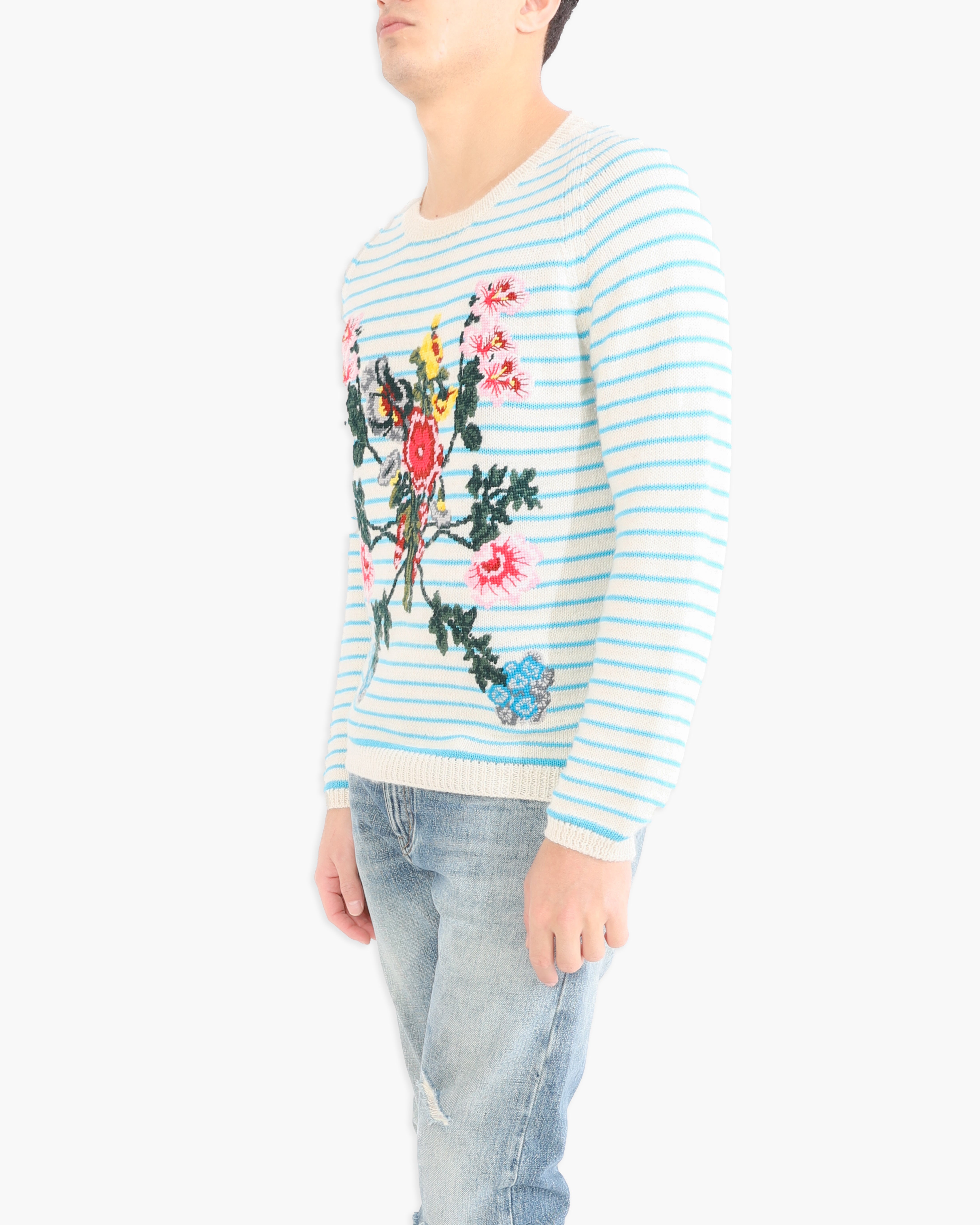 Gucci Garden Floral Embroidered Striped Knit in White & Blue