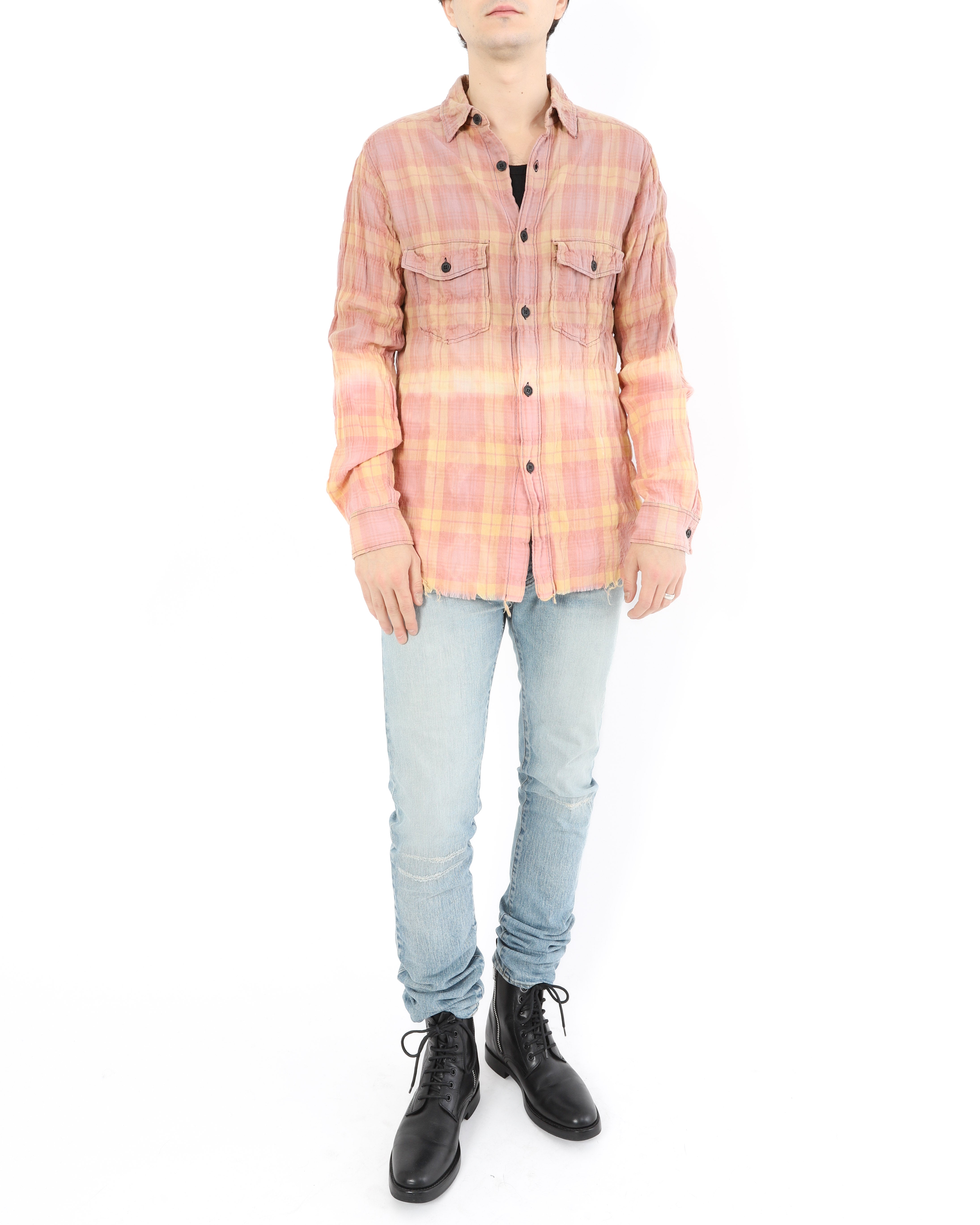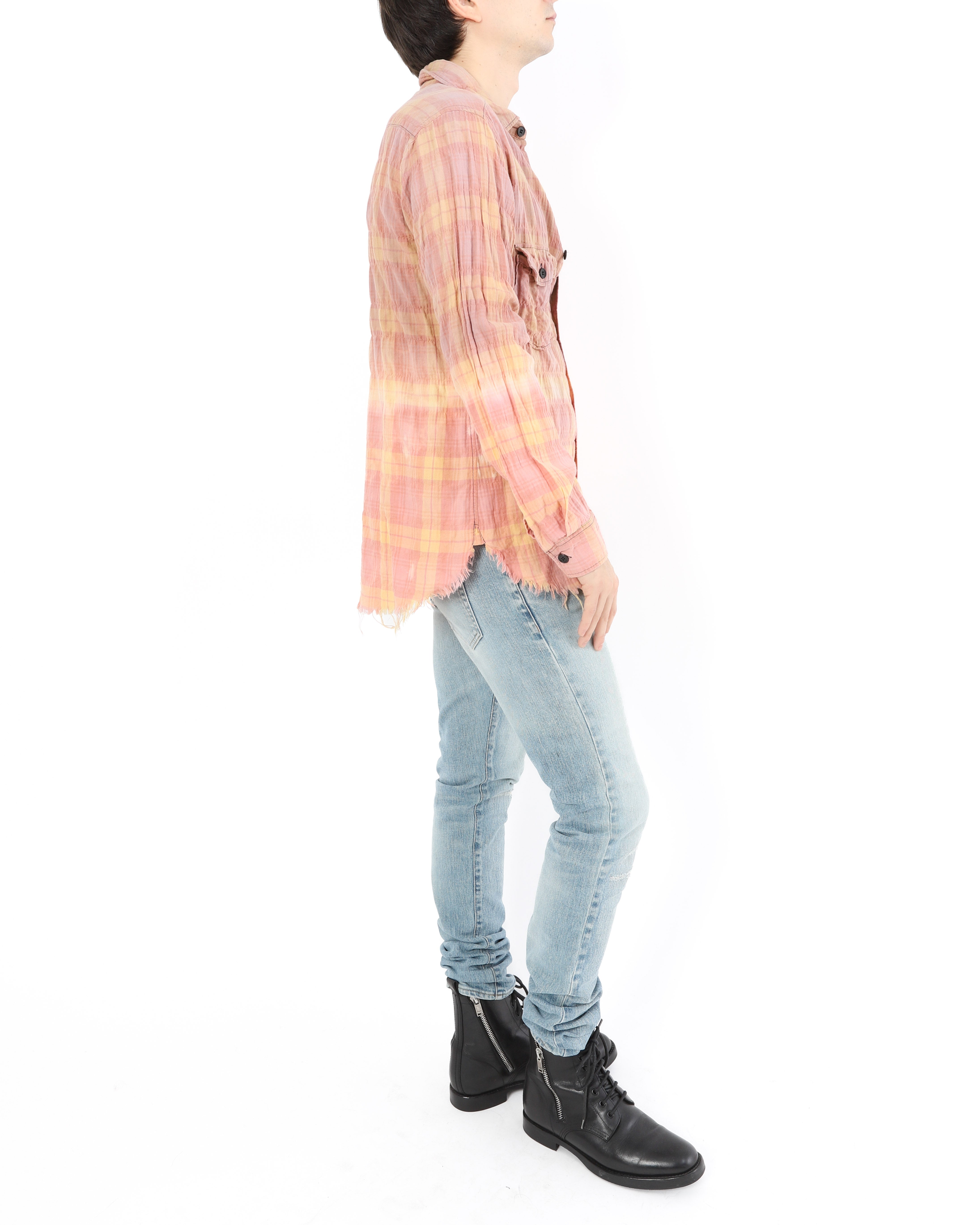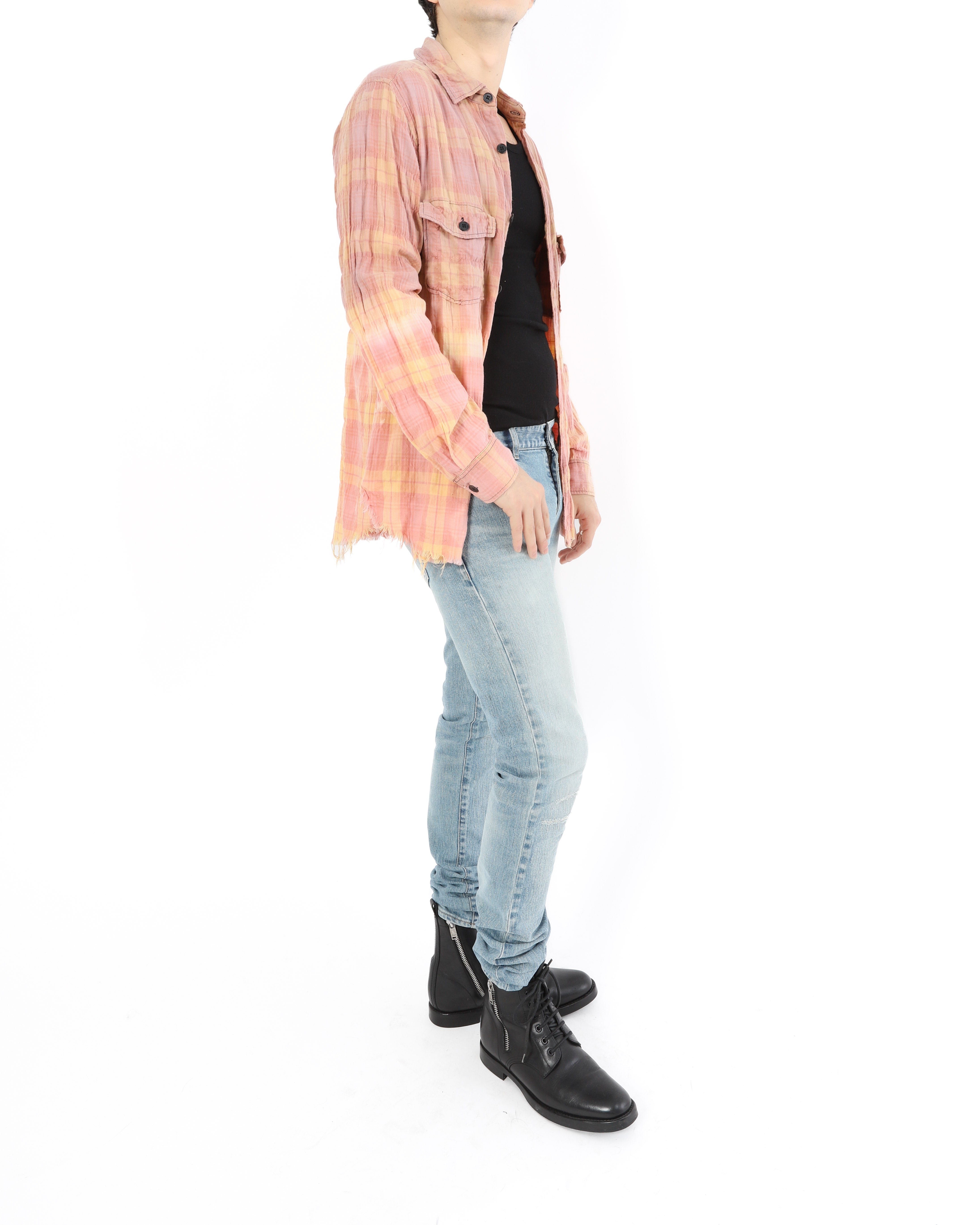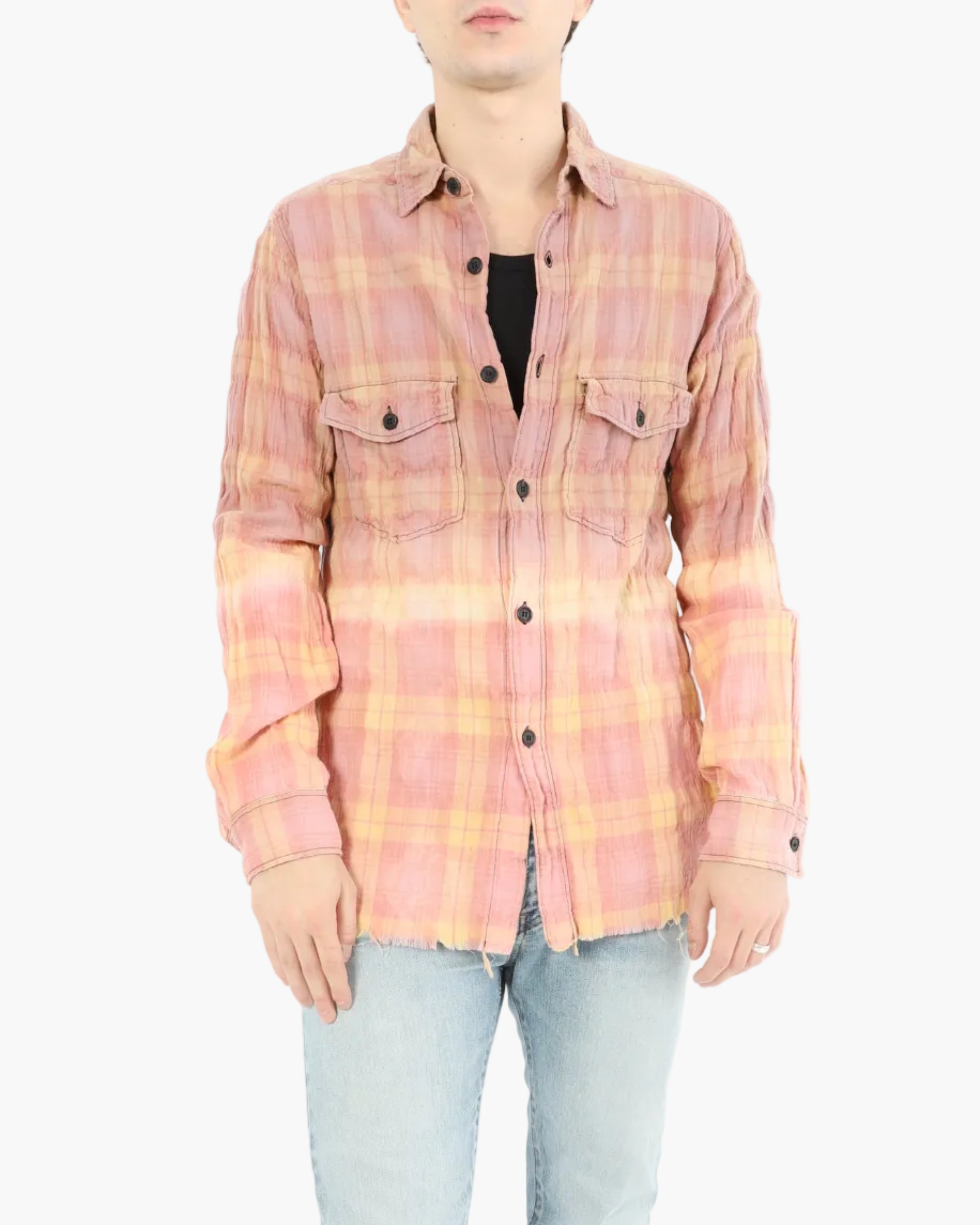 The cut is straightforward and relaxed, allowing the fabric and treatment to take the lead. Details are kept simple, with classic shirting elements and an unforced shape that feels natural on the body. There is a casual quality throughout, balanced by a clear sense of intention in the construction.