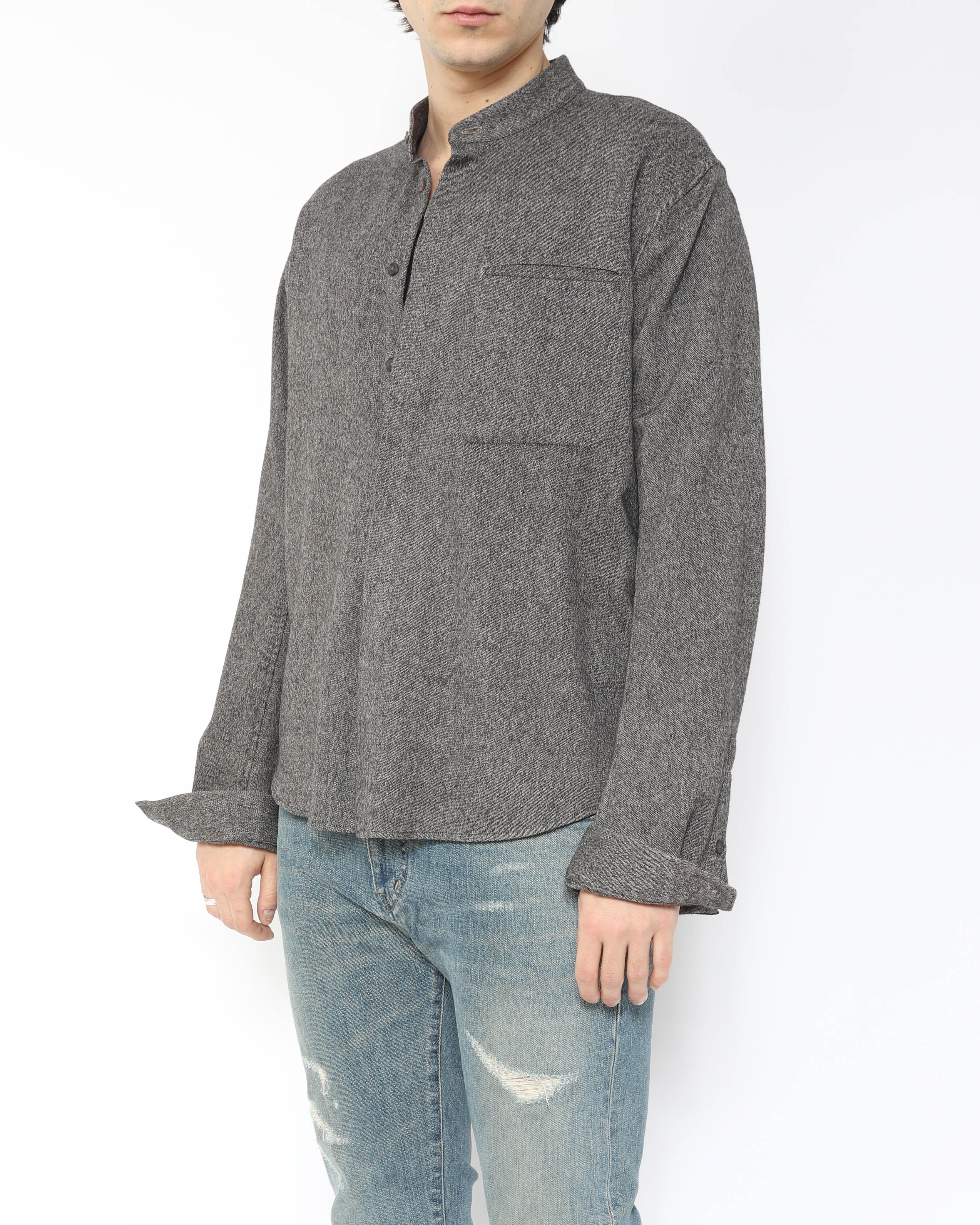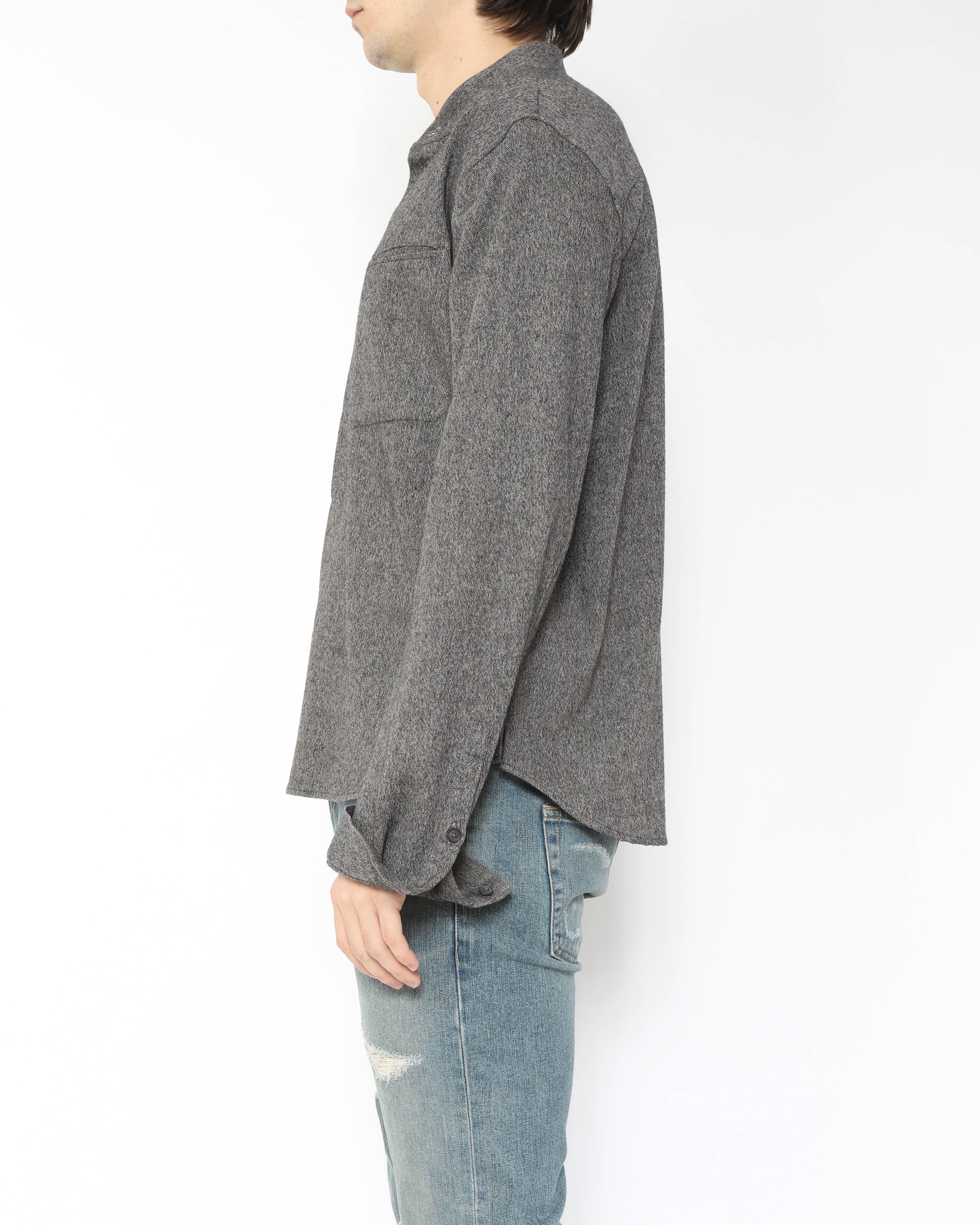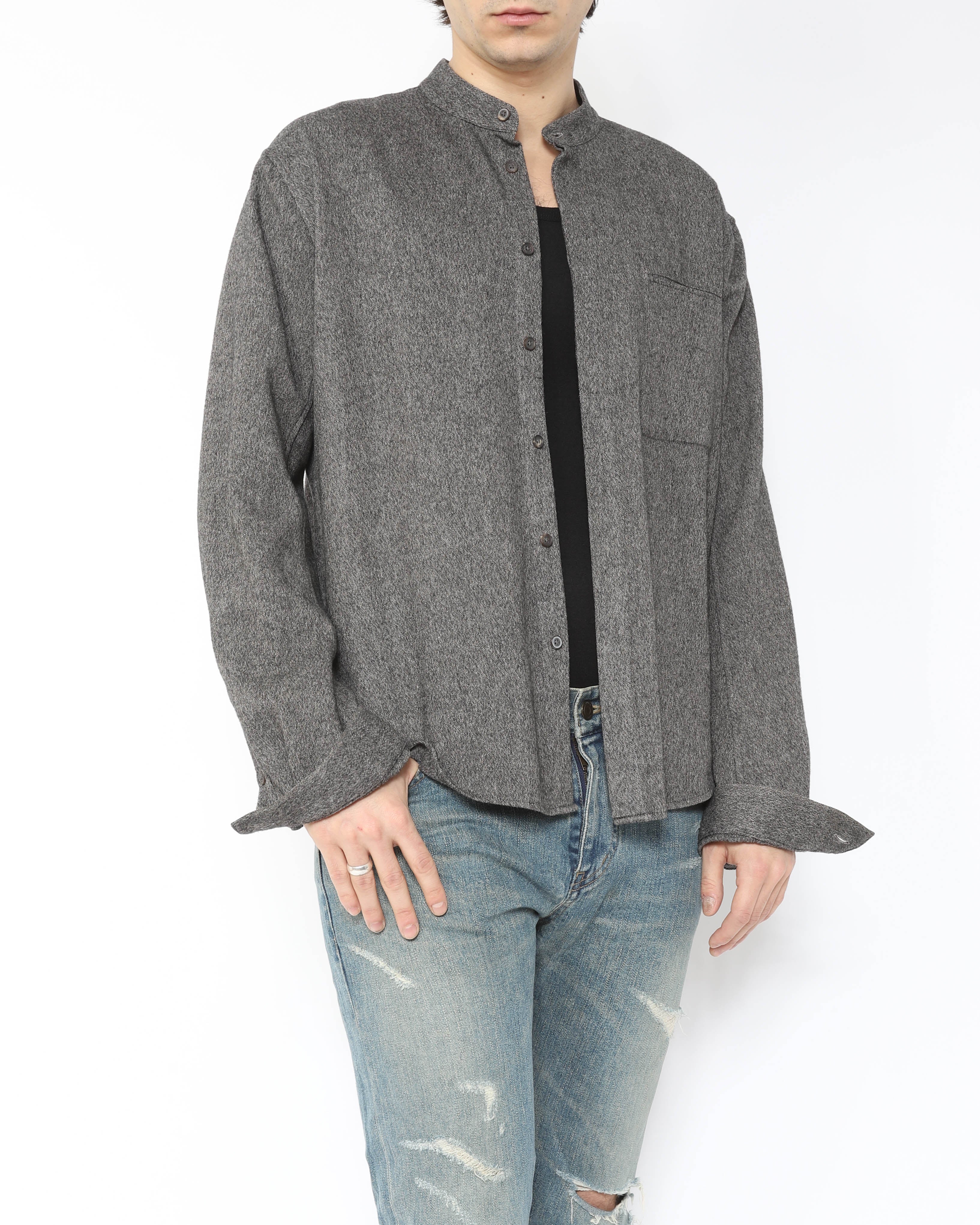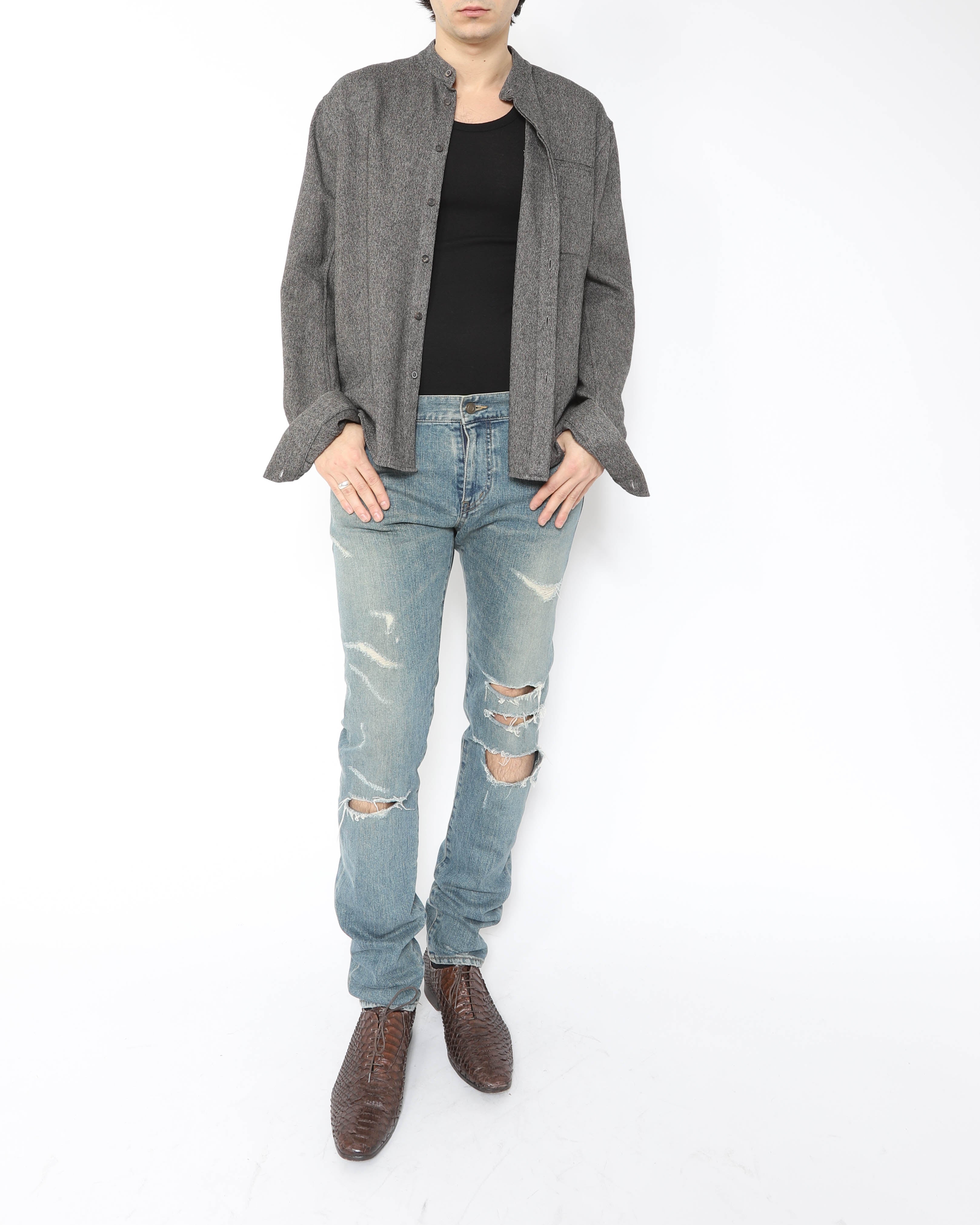 A staple piece from Haider Ackermann's FW14 collection, a season defined by its use of richly textured wool fabrics and muted grey tones throughout. This jacket reflects that vision directly, built around the mandarin collar that recurs across his work as one of his most characteristic details. The boxy cut and deliberately elongated sleeves give the silhouette an unhurried, sculptural quality consistent with Ackermann's approach to proportion. The textured wool mix fabric sits within the tonal grey palette central to the collection, adding depth and tactility that becomes more apparent the closer you look.