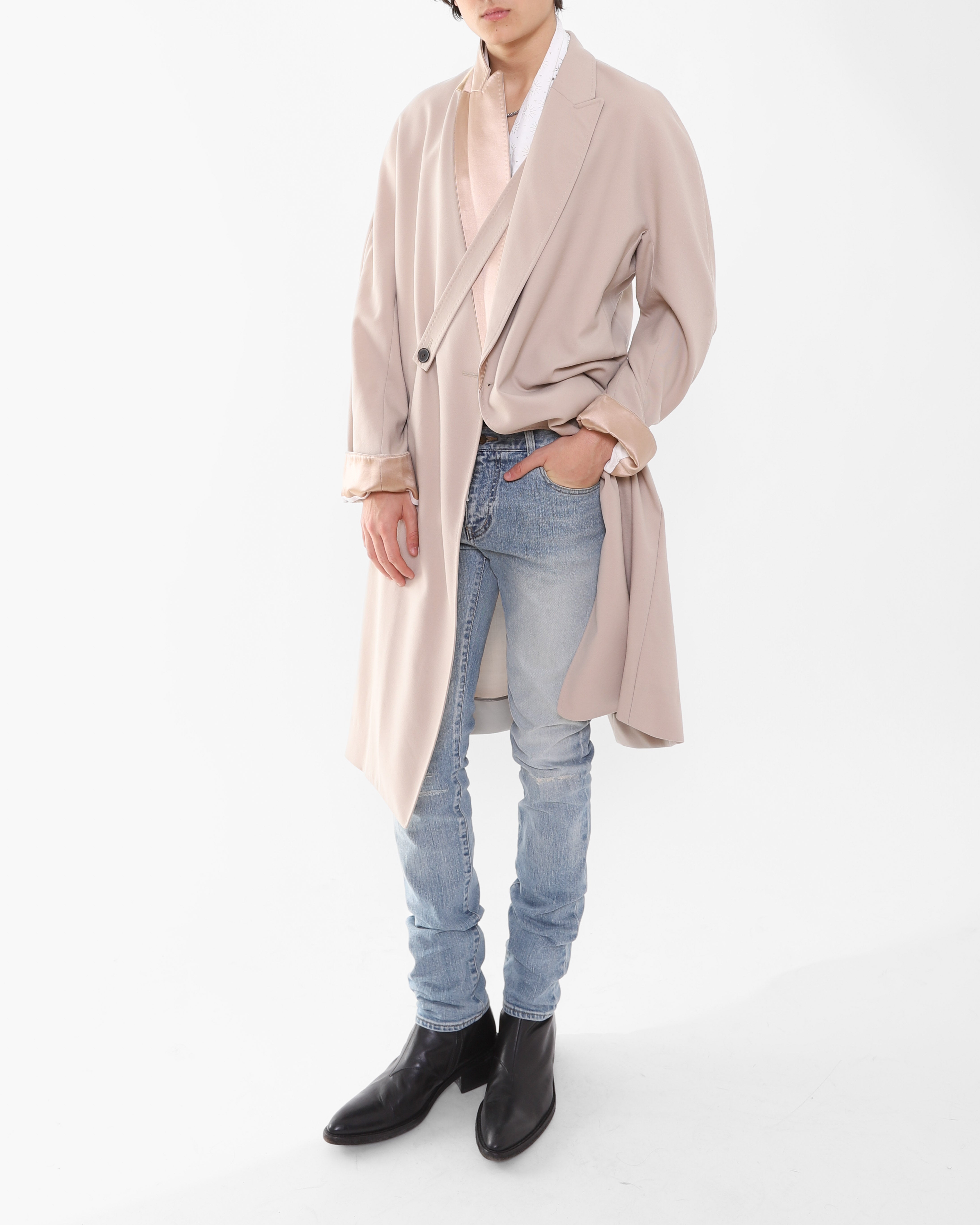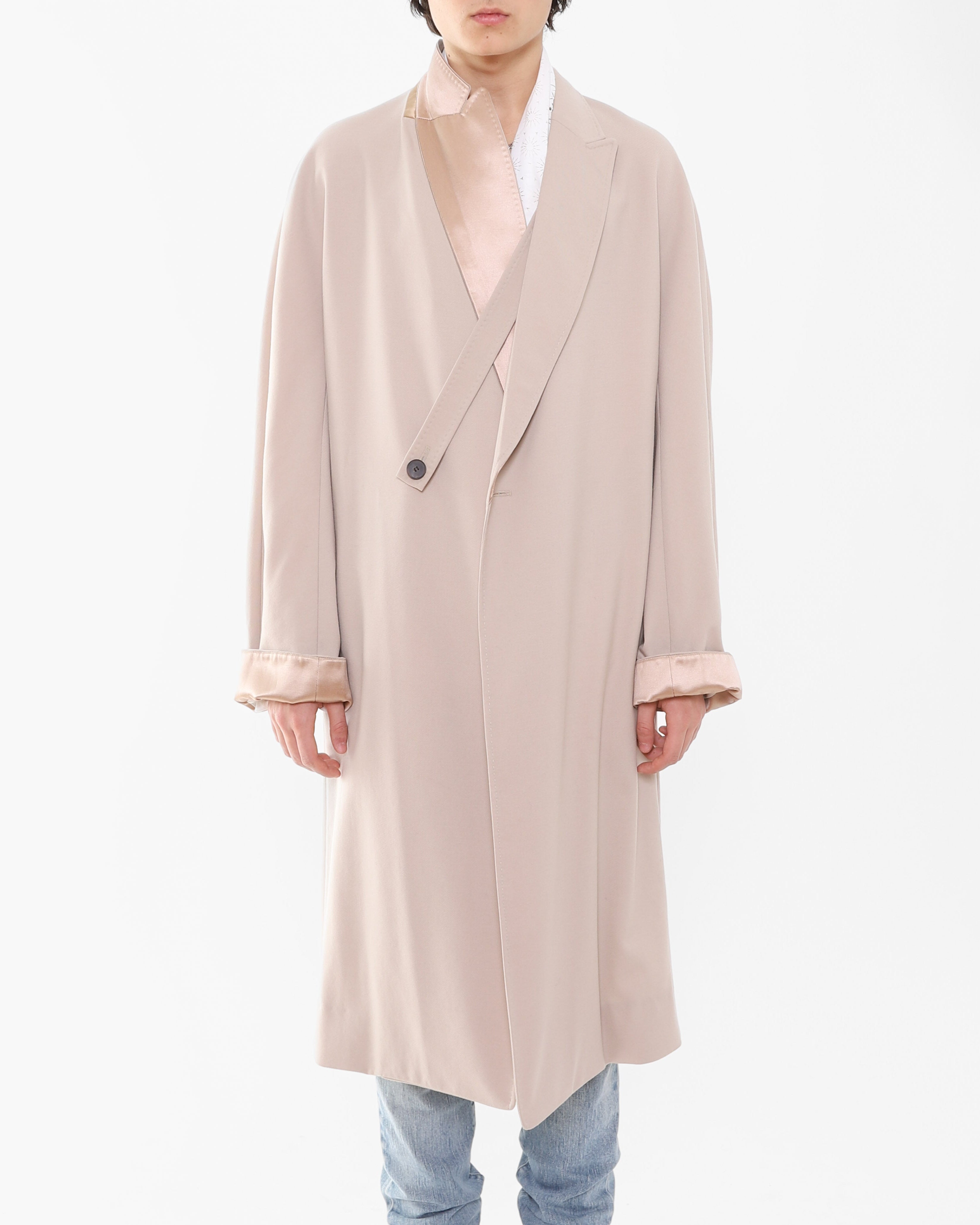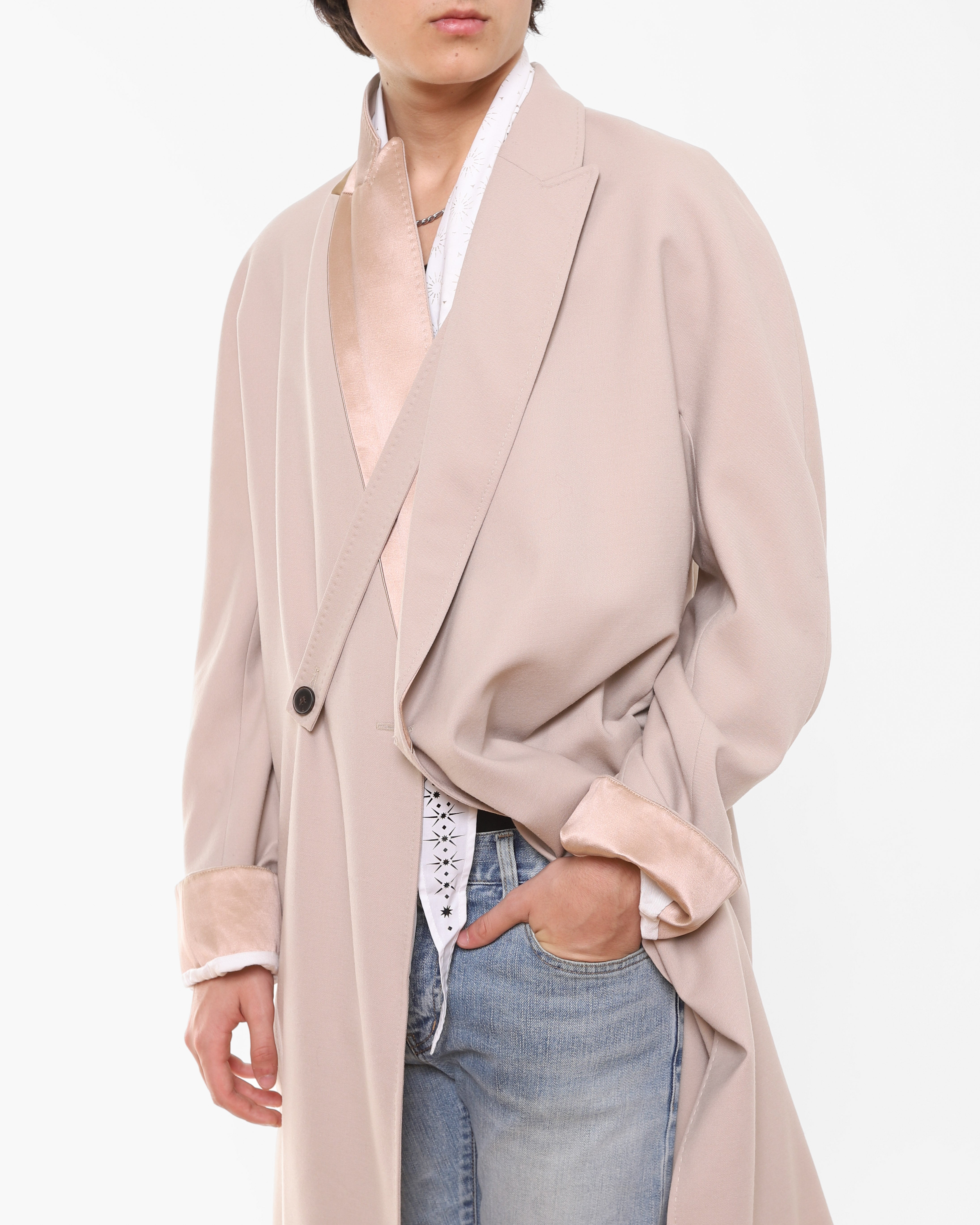 What makes this piece truly special is the depth of detail hidden throughout. Silk panels beneath the collar can be worn up, completely transforming the feel and expression of the coat in an instant. The same silk reappears inside the cuffs, which can be rolled up to reveal another layer of quiet luxury. A strap detail adds a subtle military reference that can be used to give the coat some structure without fully closing it.