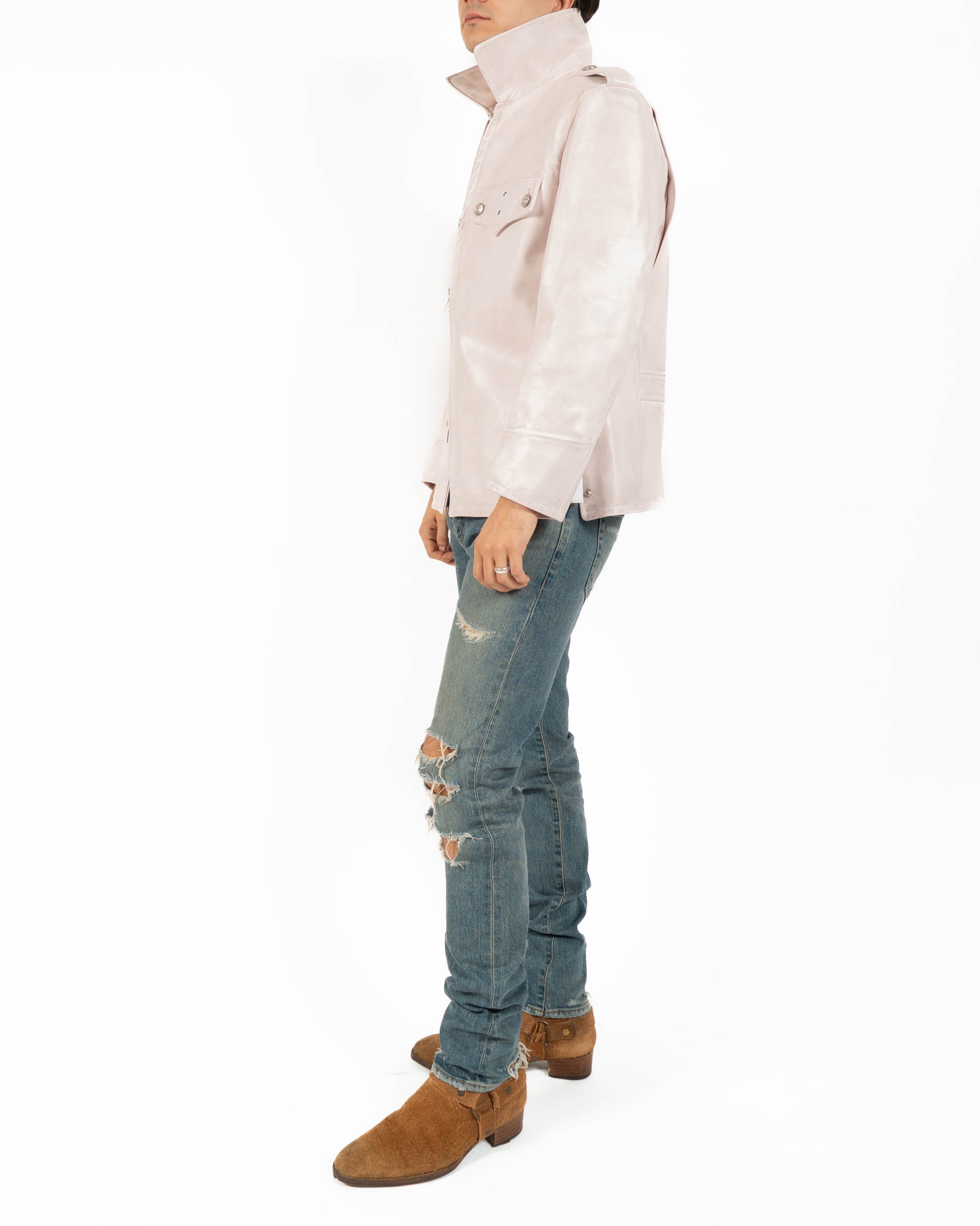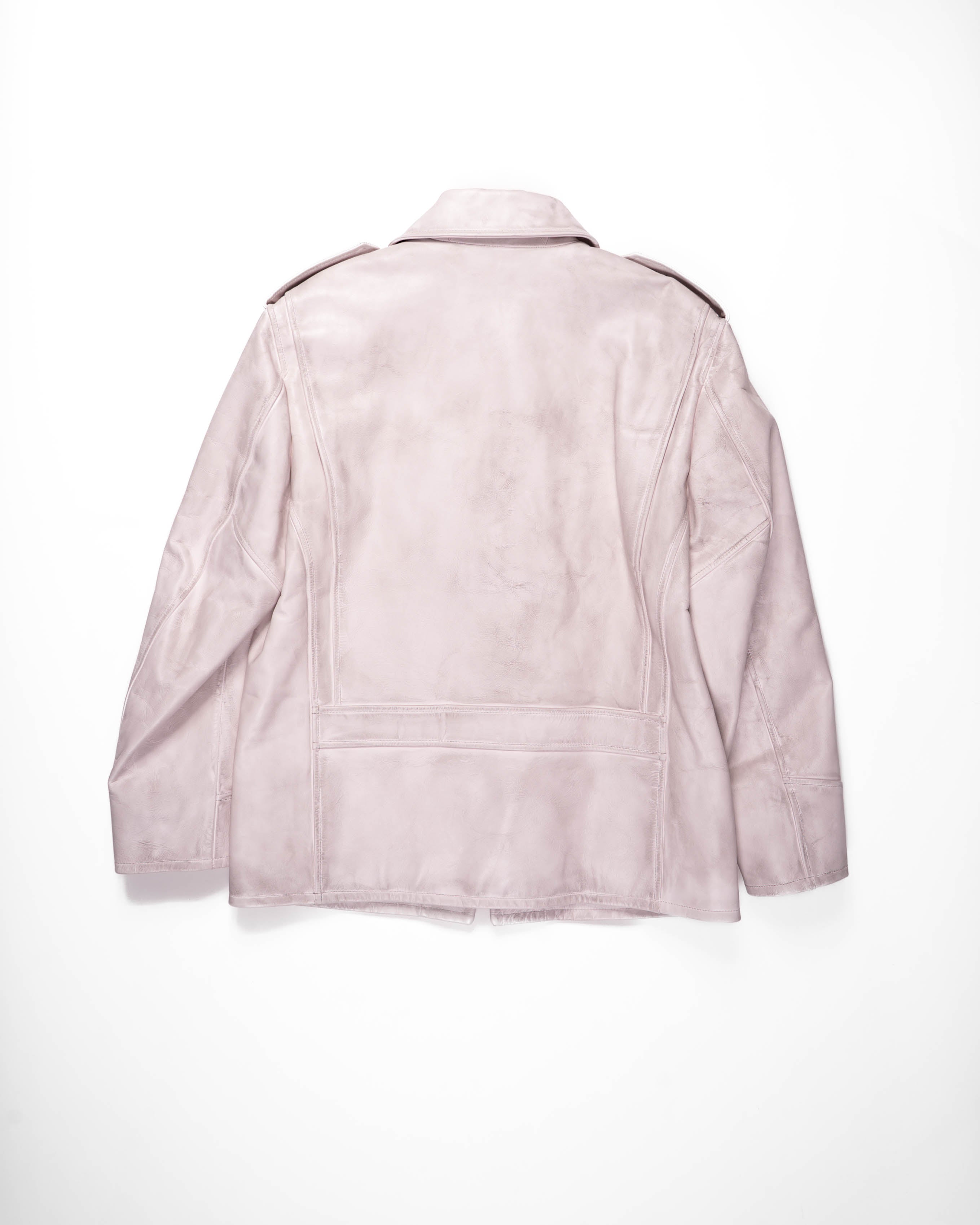 Part of the Fall Winter 2017 collection, this Police Jacket reimagines a traditionally rugged silhouette through an unexpected lens. Cut from soft pink leather, its faded surface lends a patinated, worn character that contrasts with the structured lines of its design.