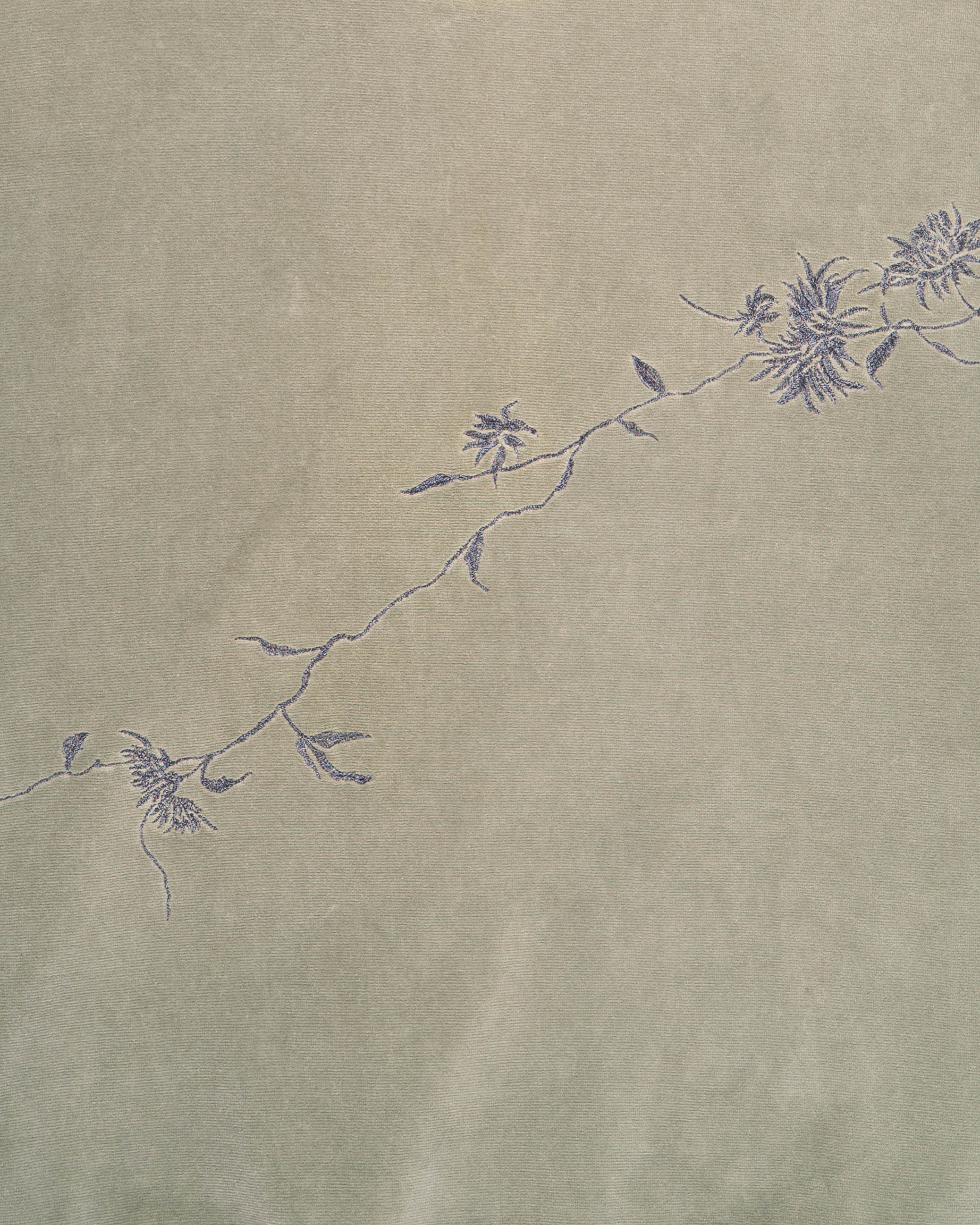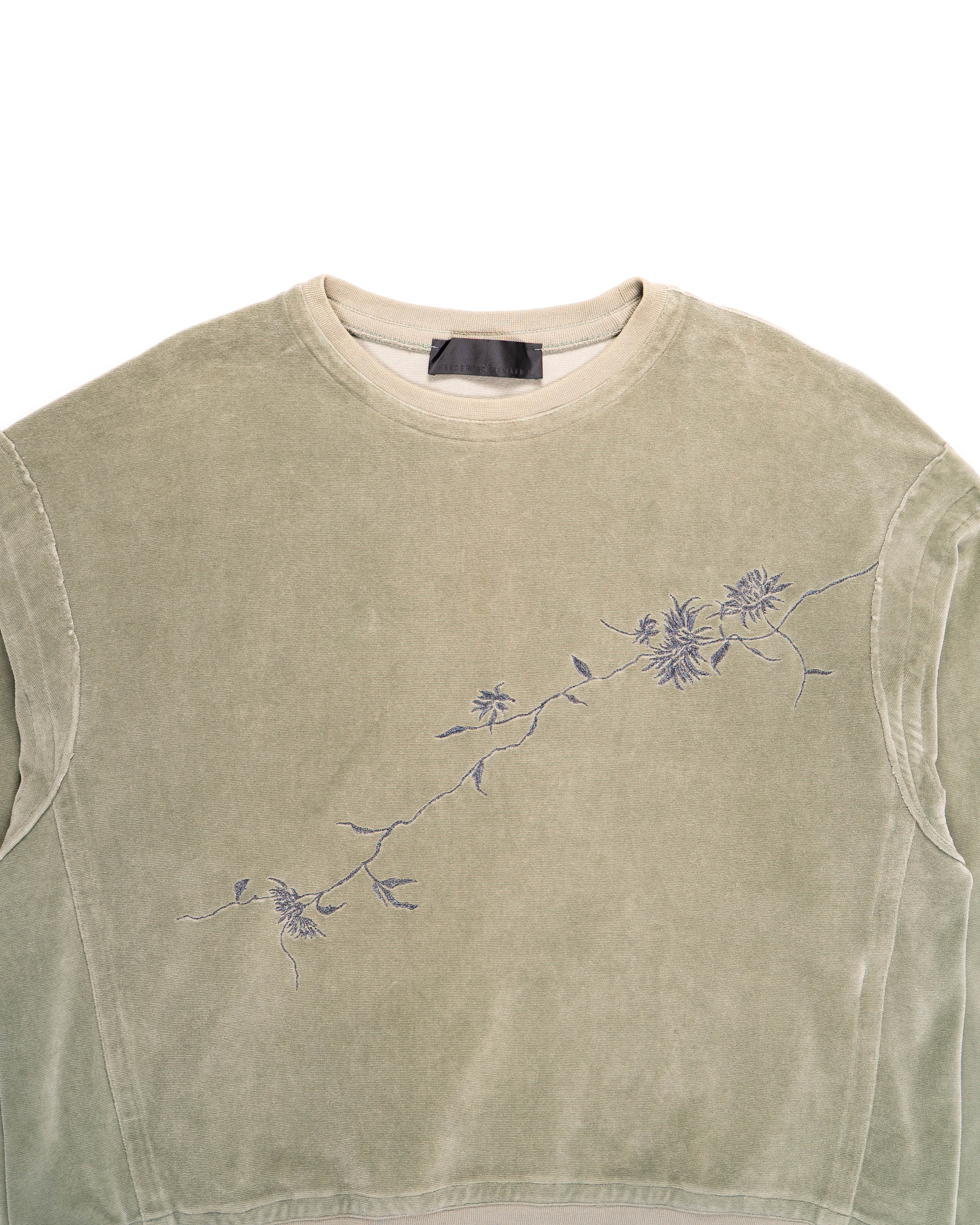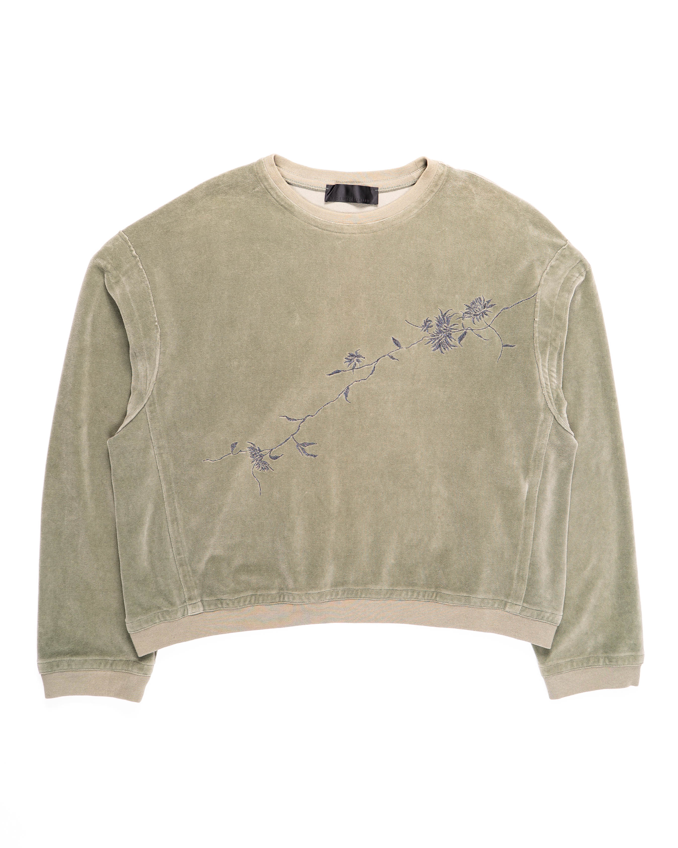 Crafted from cotton with a soft velvet finish, the light green tone has a washed, almost muted quality that enhances the casual ease of the design. Embroidered floral motifs stretch across the chest in delicate lines.