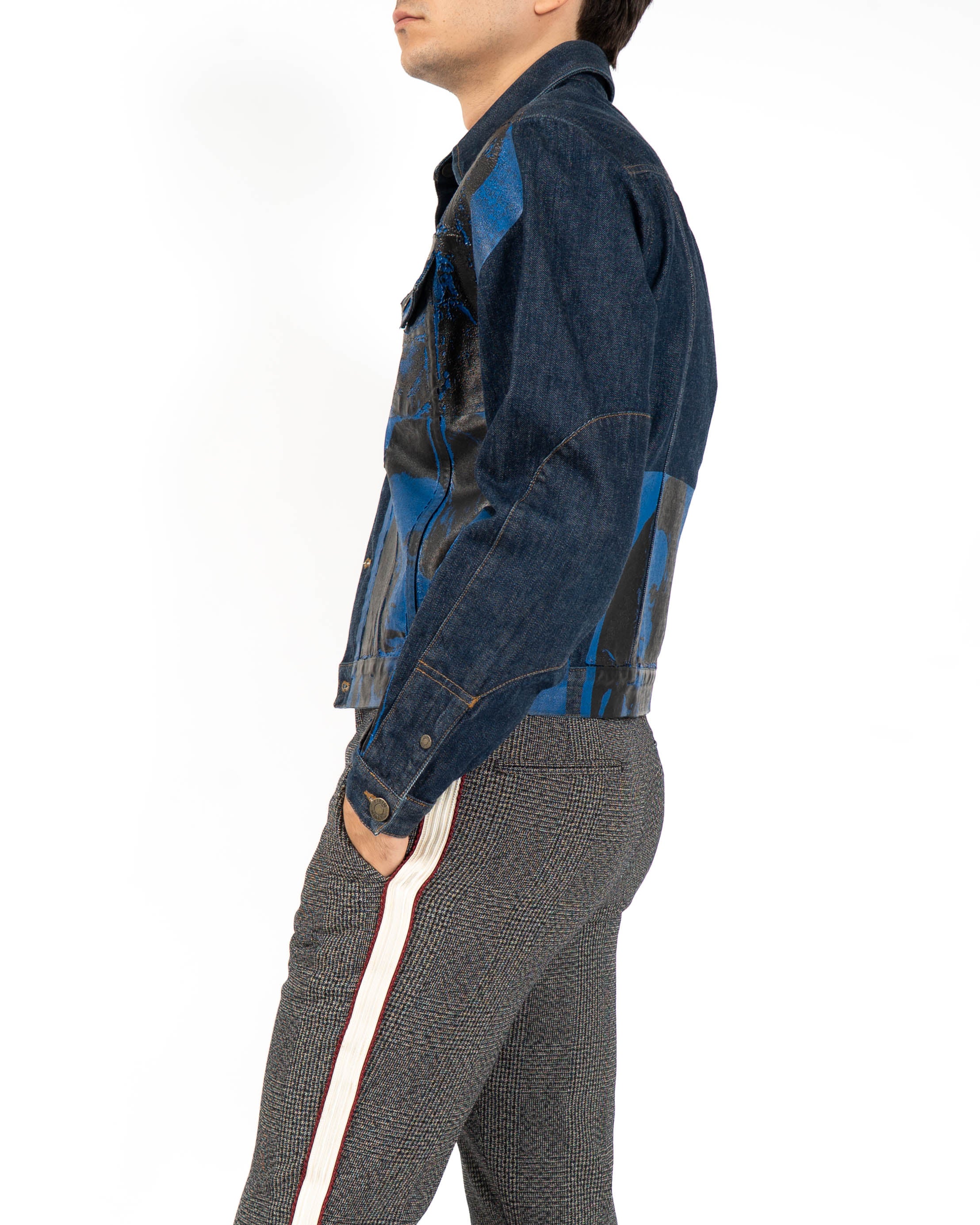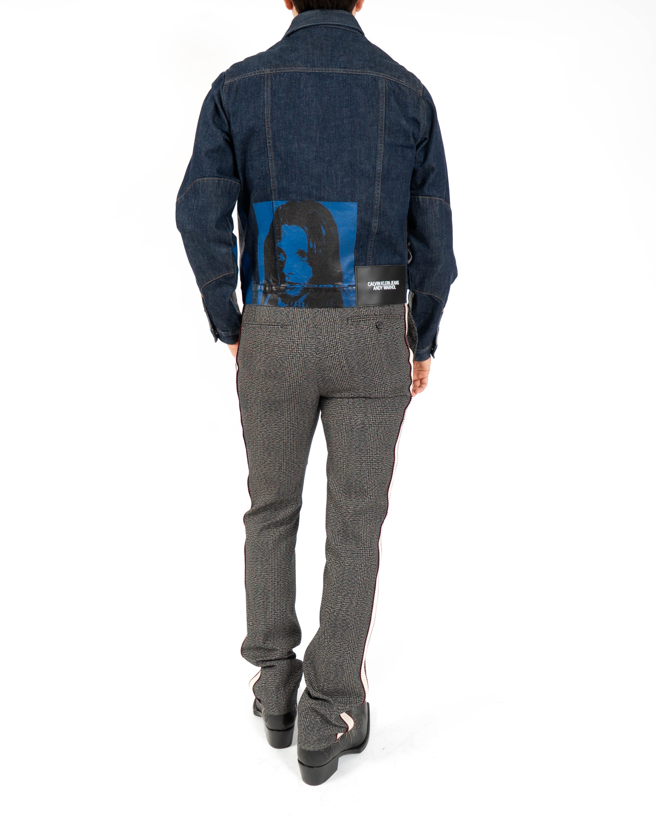 This denim jacket was featured on the Spring/Summer 2018 runway show of Calvin Klein 205W39NYC. Created in collaboration with the Andy Warhol Foundation, the piece reflects Raf Simons’ exploration of American art and culture through Warhol’s work. The jacket features a striking blue screen print of a photograph-turned-pop artwork by Andy Warhol depicting Sandra Brant, wife of Peter Brant. Crafted from sturdy indigo denim, it captures the essence of Raf Simons’ tenure at Calvin Klein, blending artistic vision with utilitarian American workwear design. The fit is inspired by Helmut Lang’s iconic denim line, emphasizing a structured yet relaxed silhouette with a cropped body and classic buttoned front.