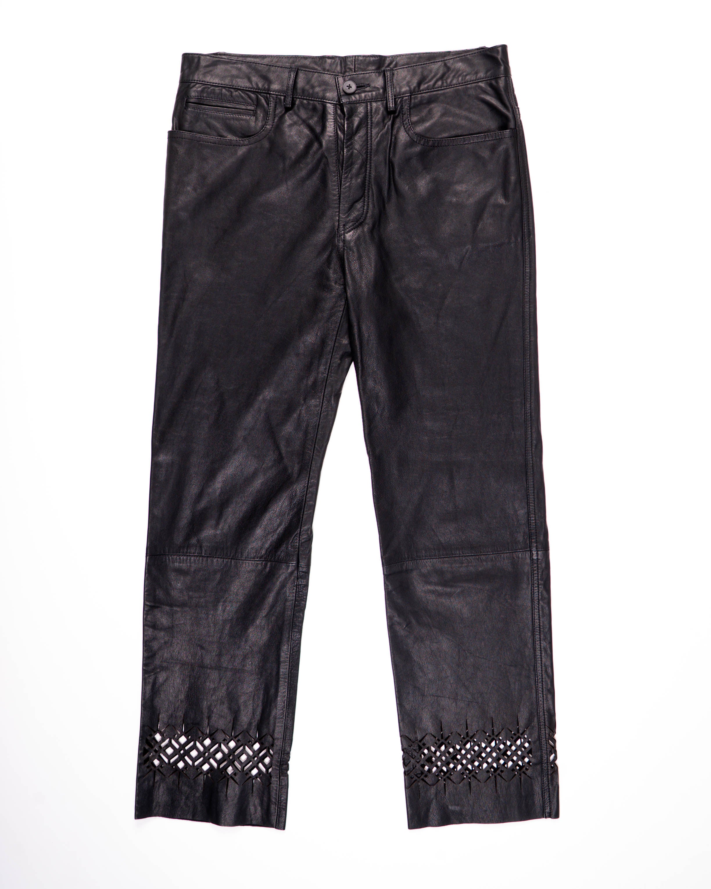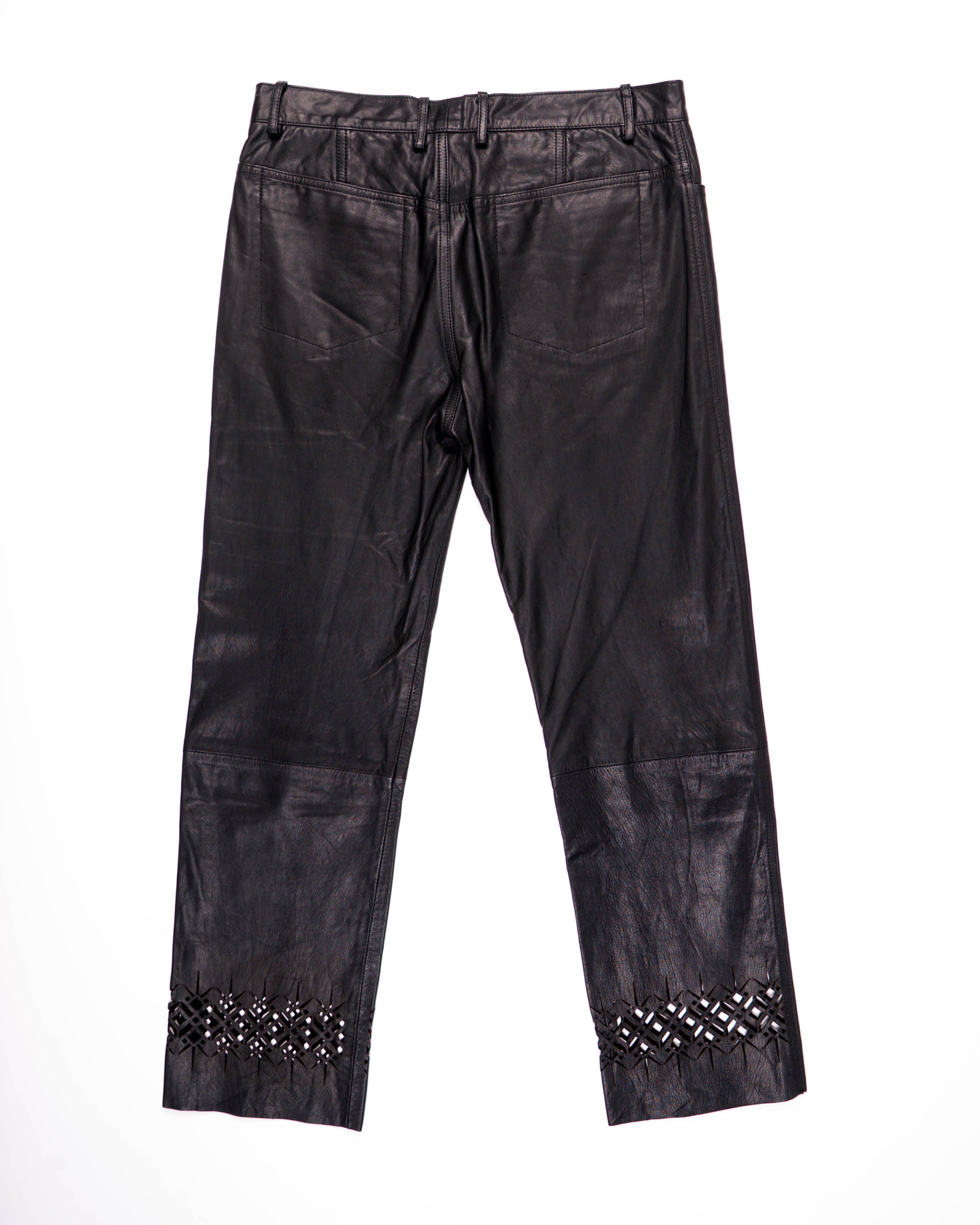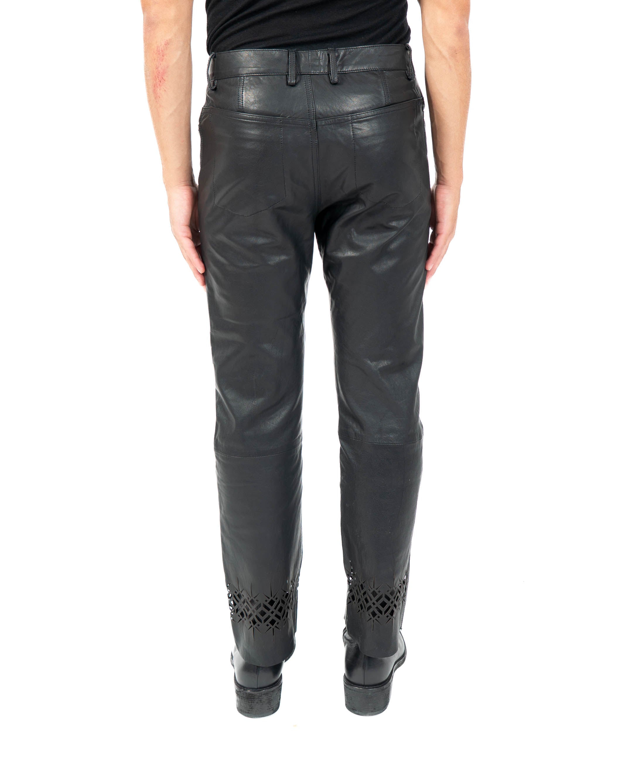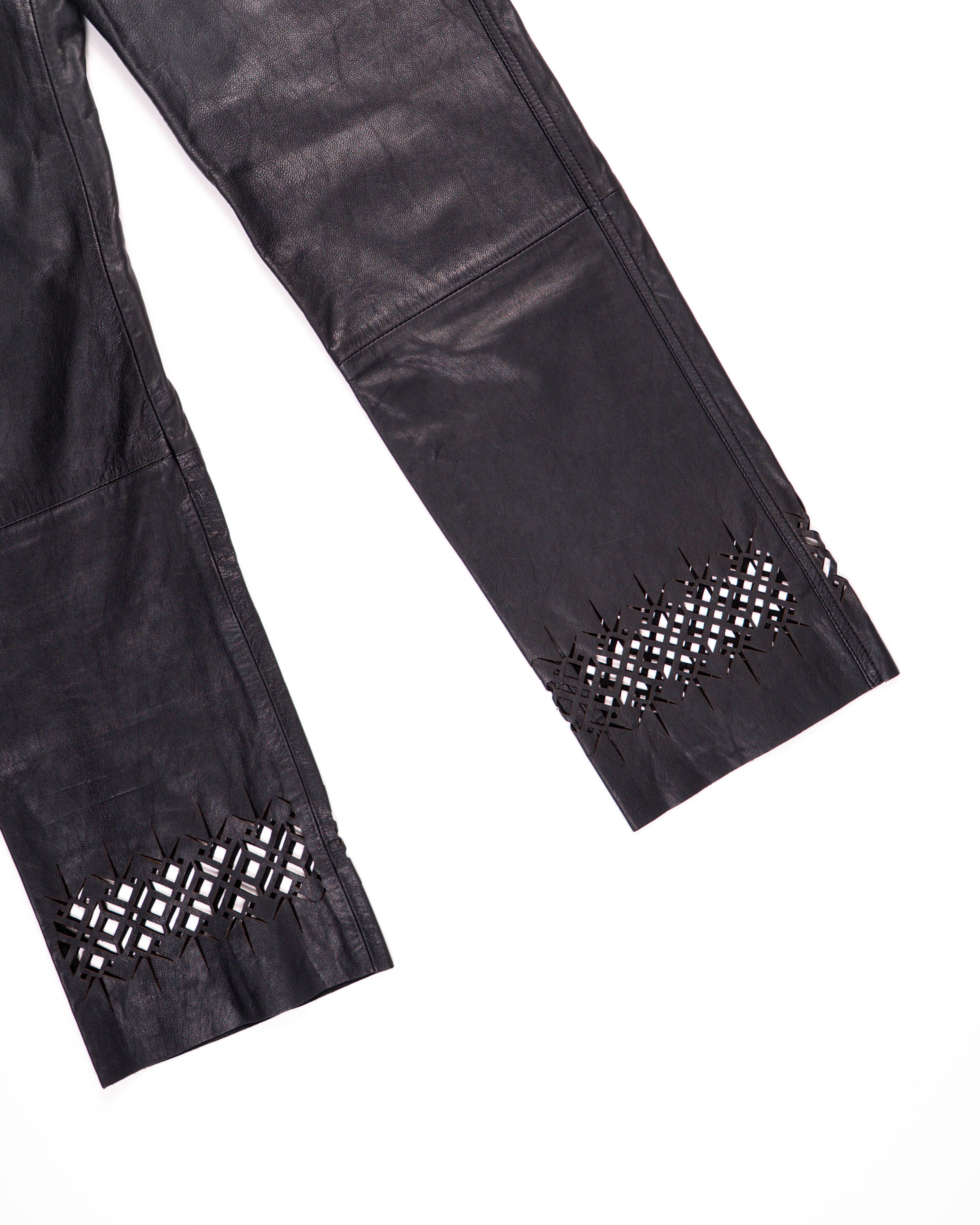 Crafted entirely from supple black leather, the trousers are defined by intricate lasercut patterns at the cuffs. This detail creates a interesting contrast between the strength of the leather and the delicacy of the perforations, giving the piece a sculptural elegance.