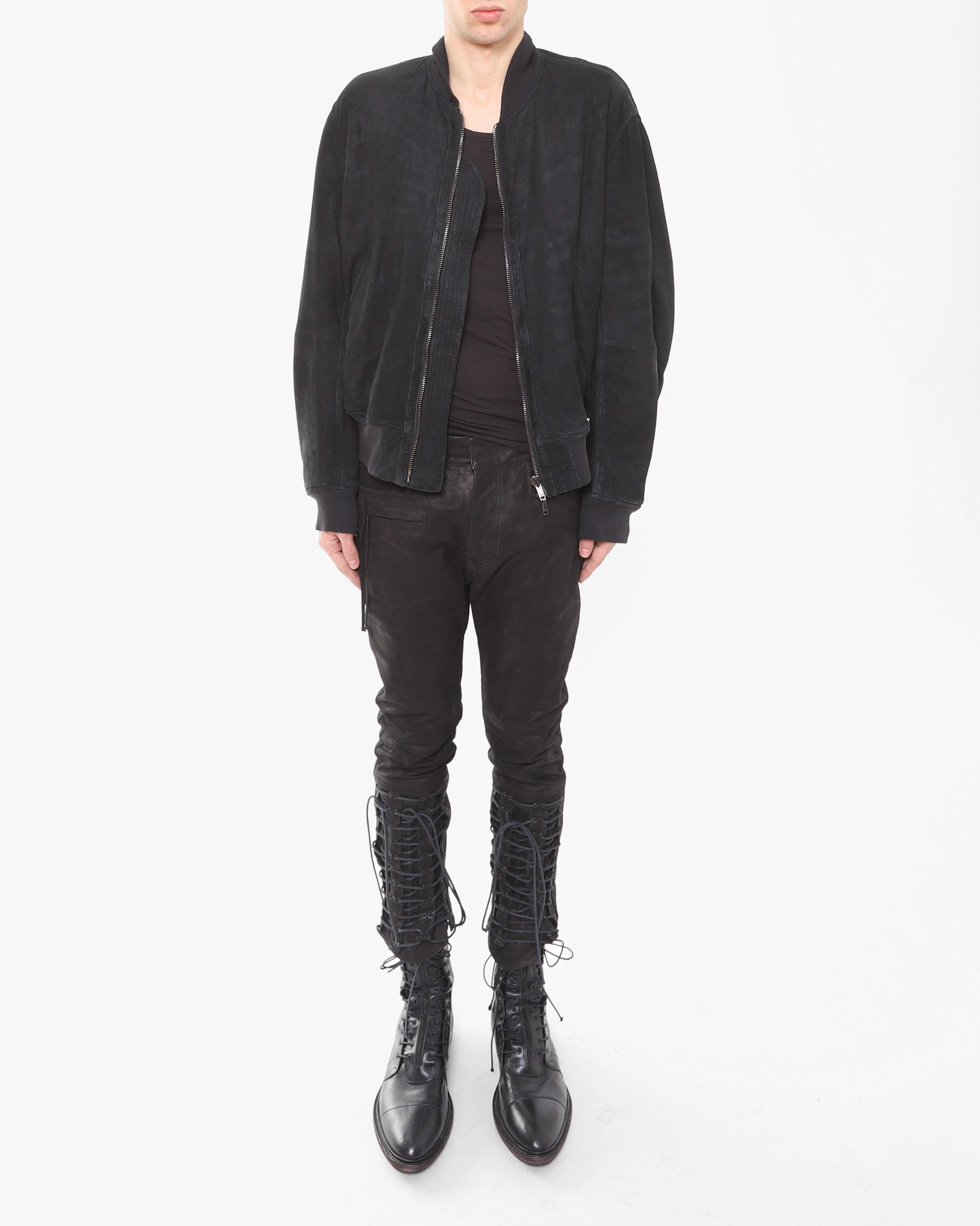 Part of Haider's first menswear collection, this bomber is as rare as it gets. The outer is crafted in a richly textured suede that lends the jacket a beautifully worn in, vintage feel, while the fully reversible construction reveals a clean black Perth cotton on the inside, completely transforming the character of the piece in an instant.