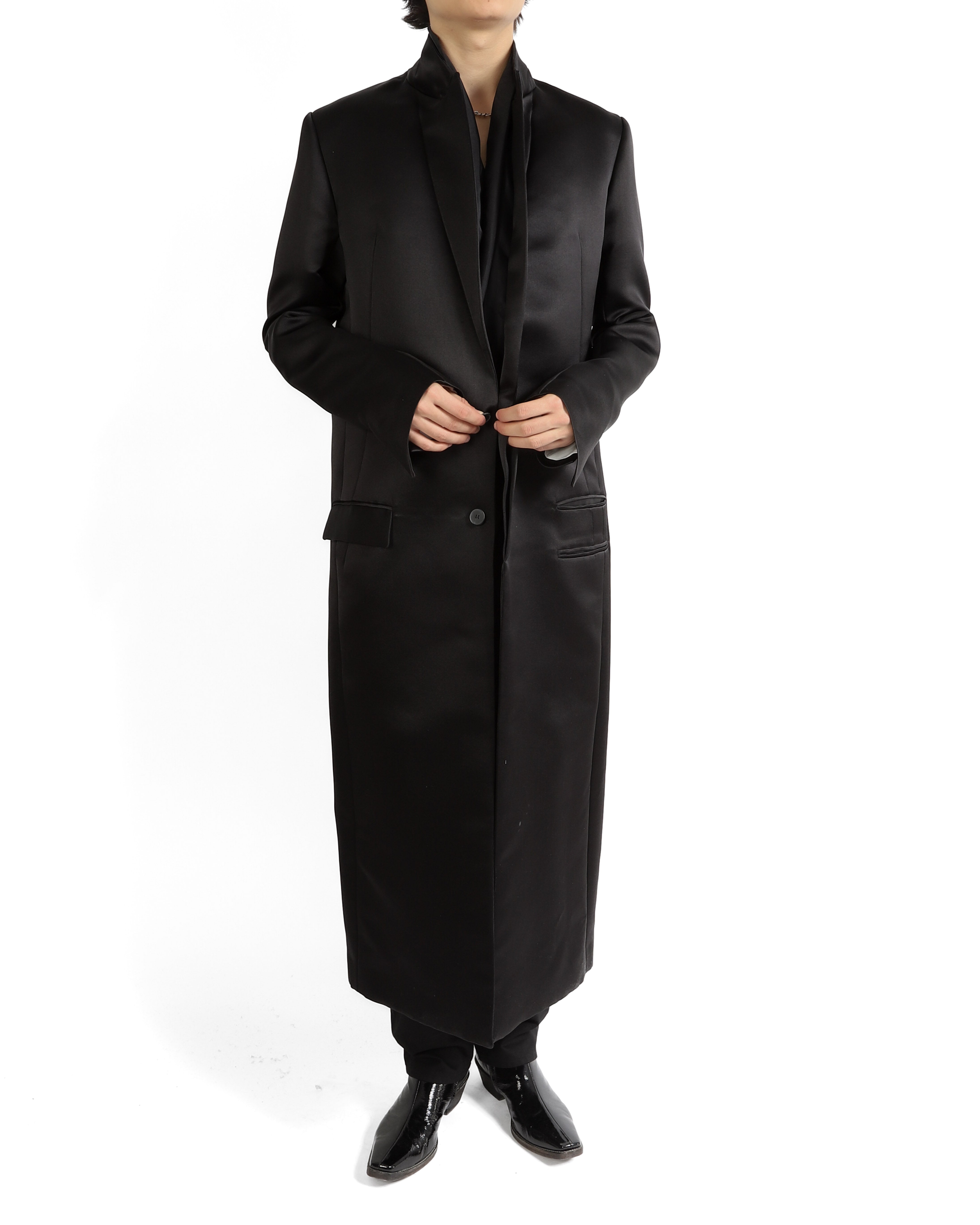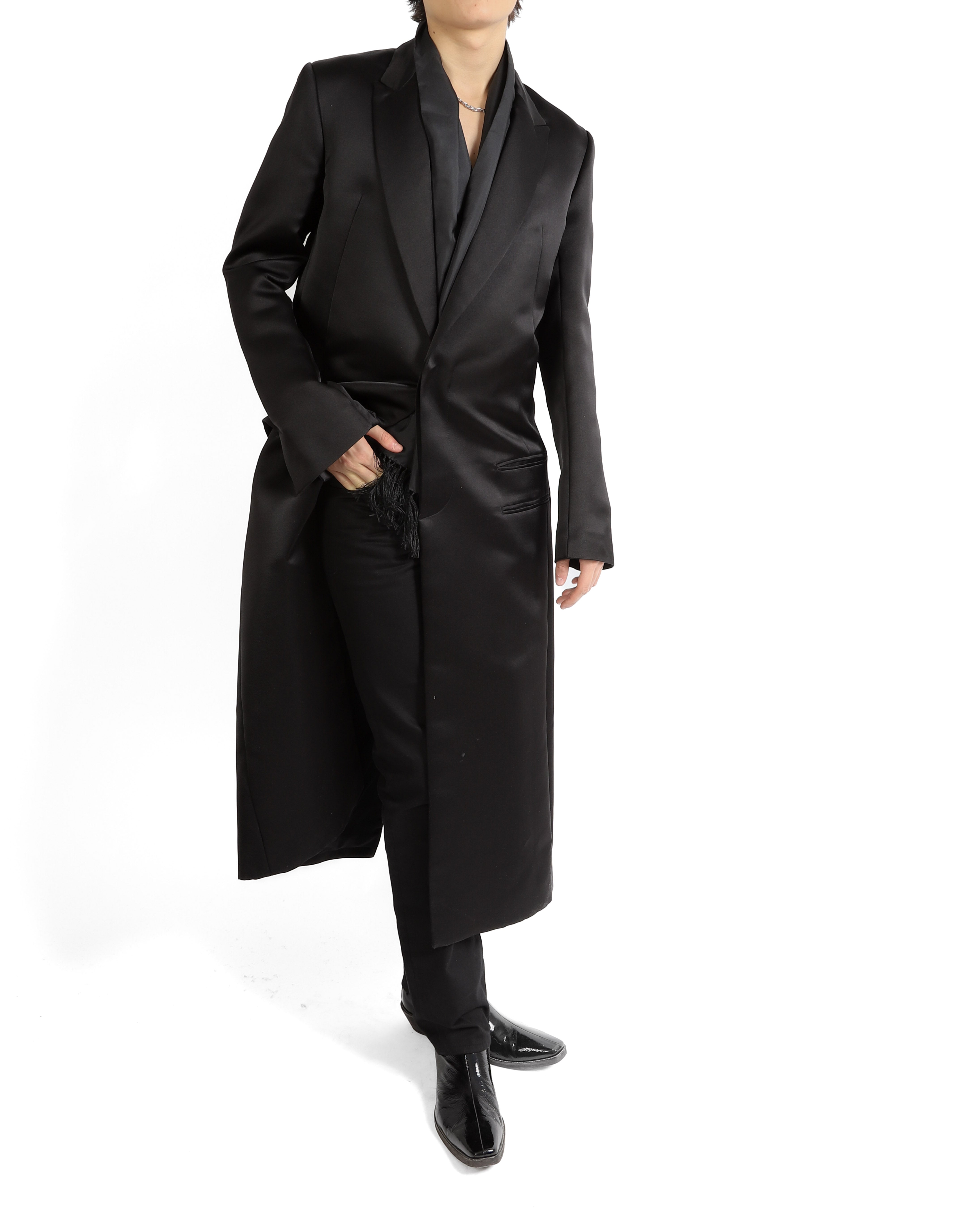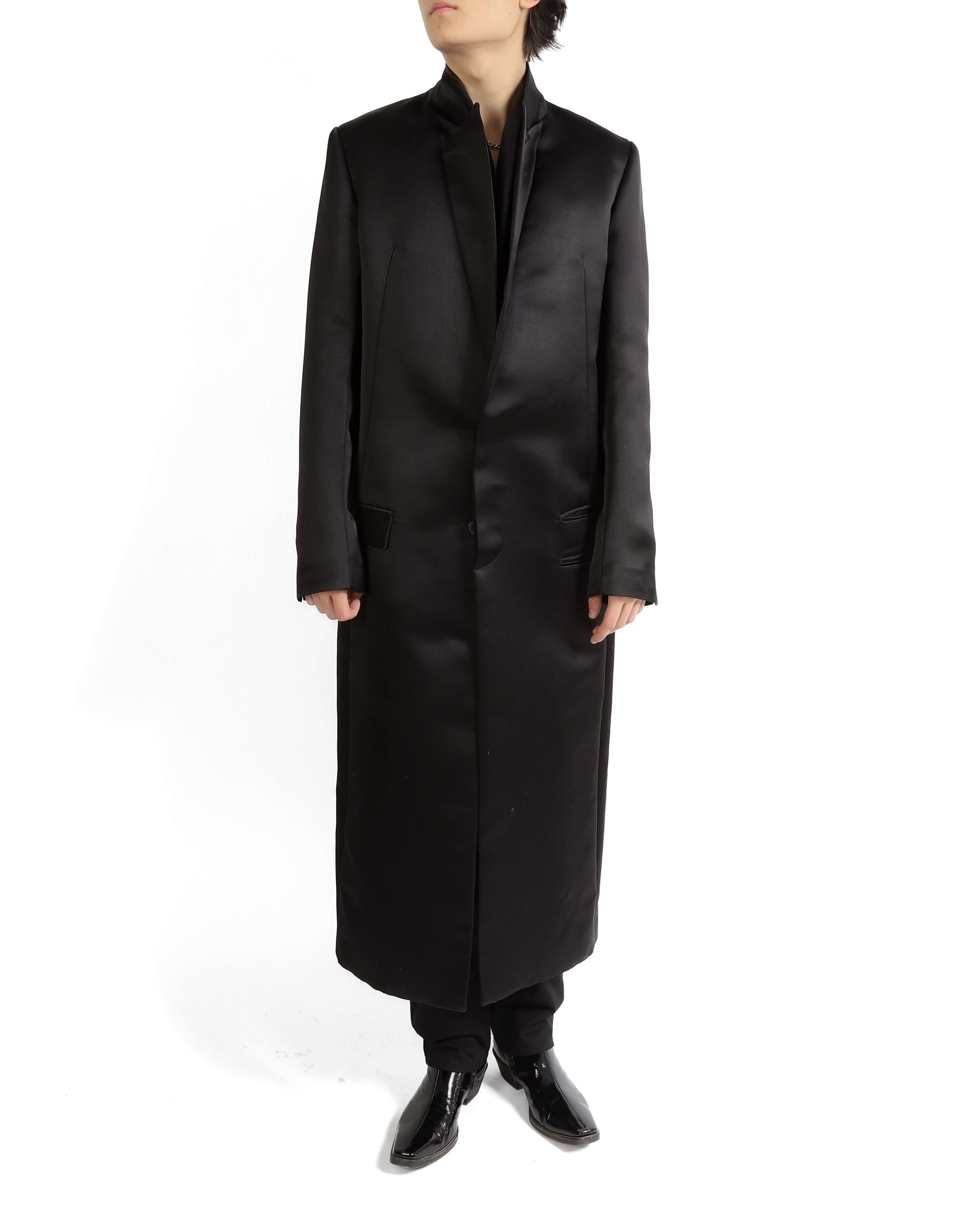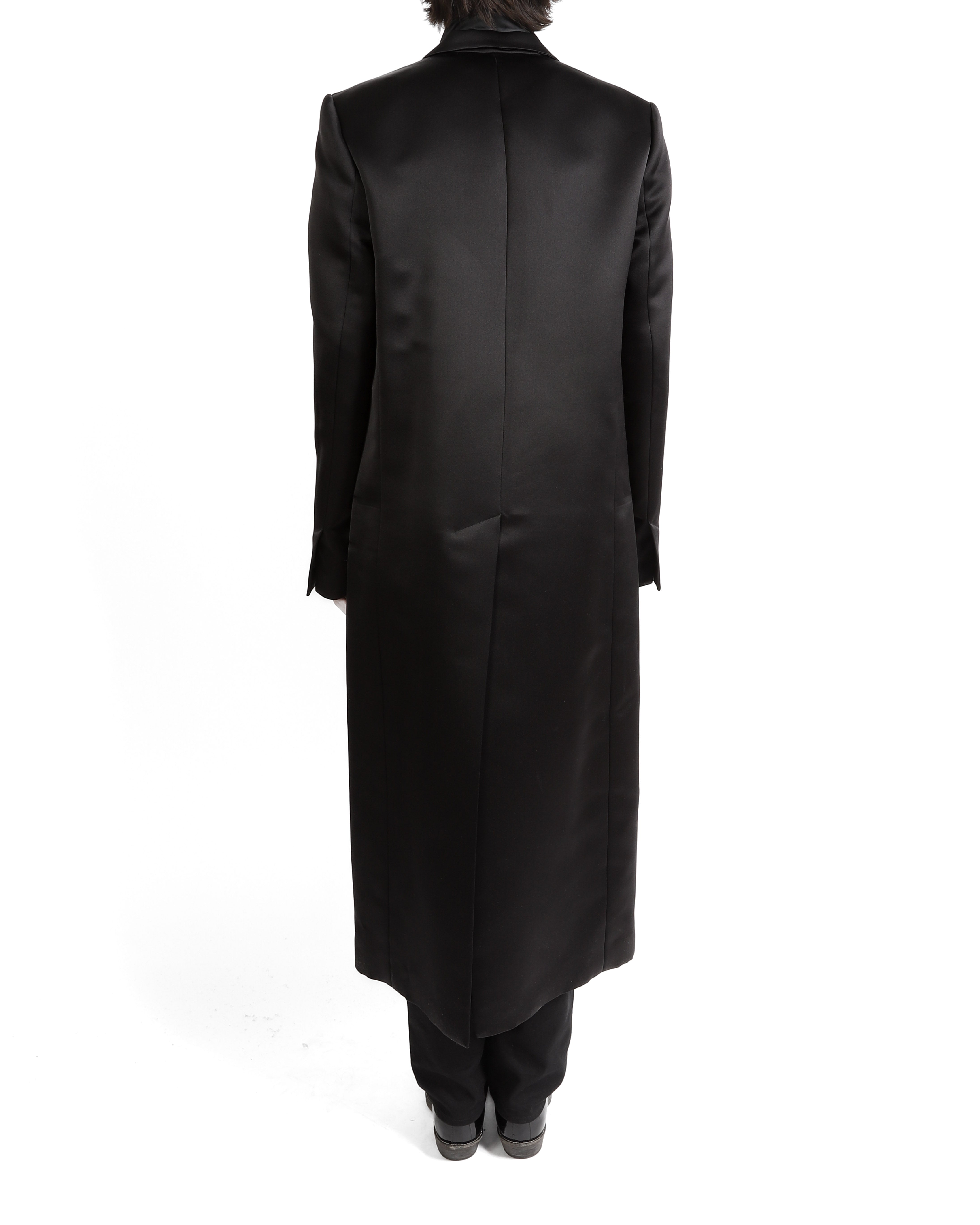 The silhouette embodies Haider’s uncompromising vision sharp, elongated, and quietly powerful. With its smooth, weighty drape the coat strikes a balance between minimalism and opulence. A collector’s-level piece, it represents the designer at his most uncompromised and refined.