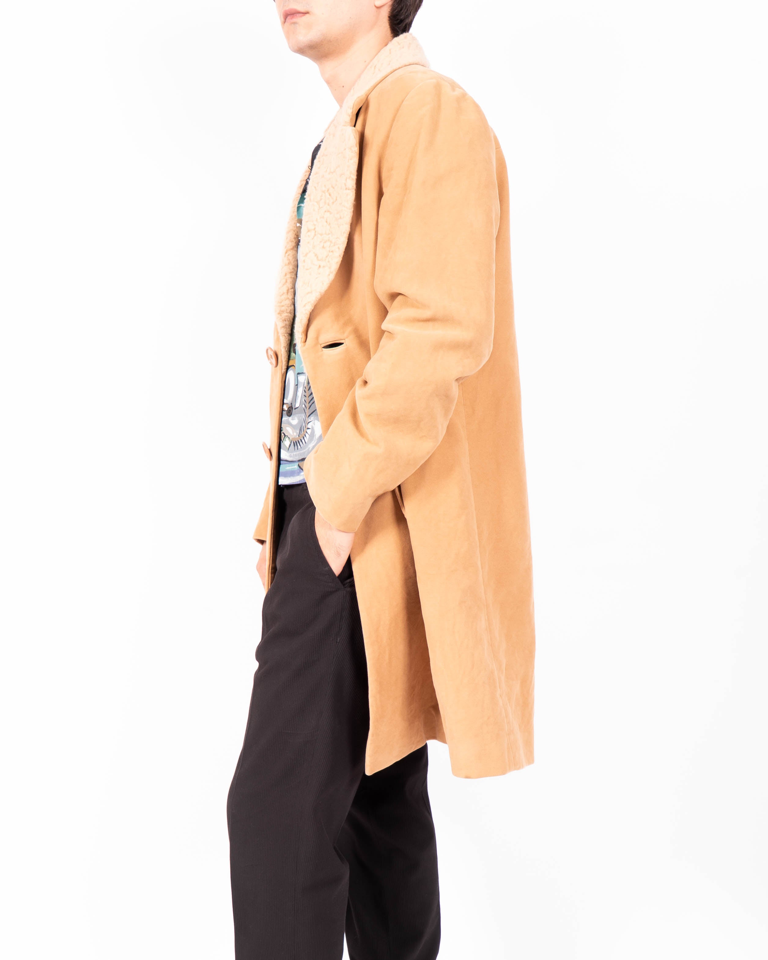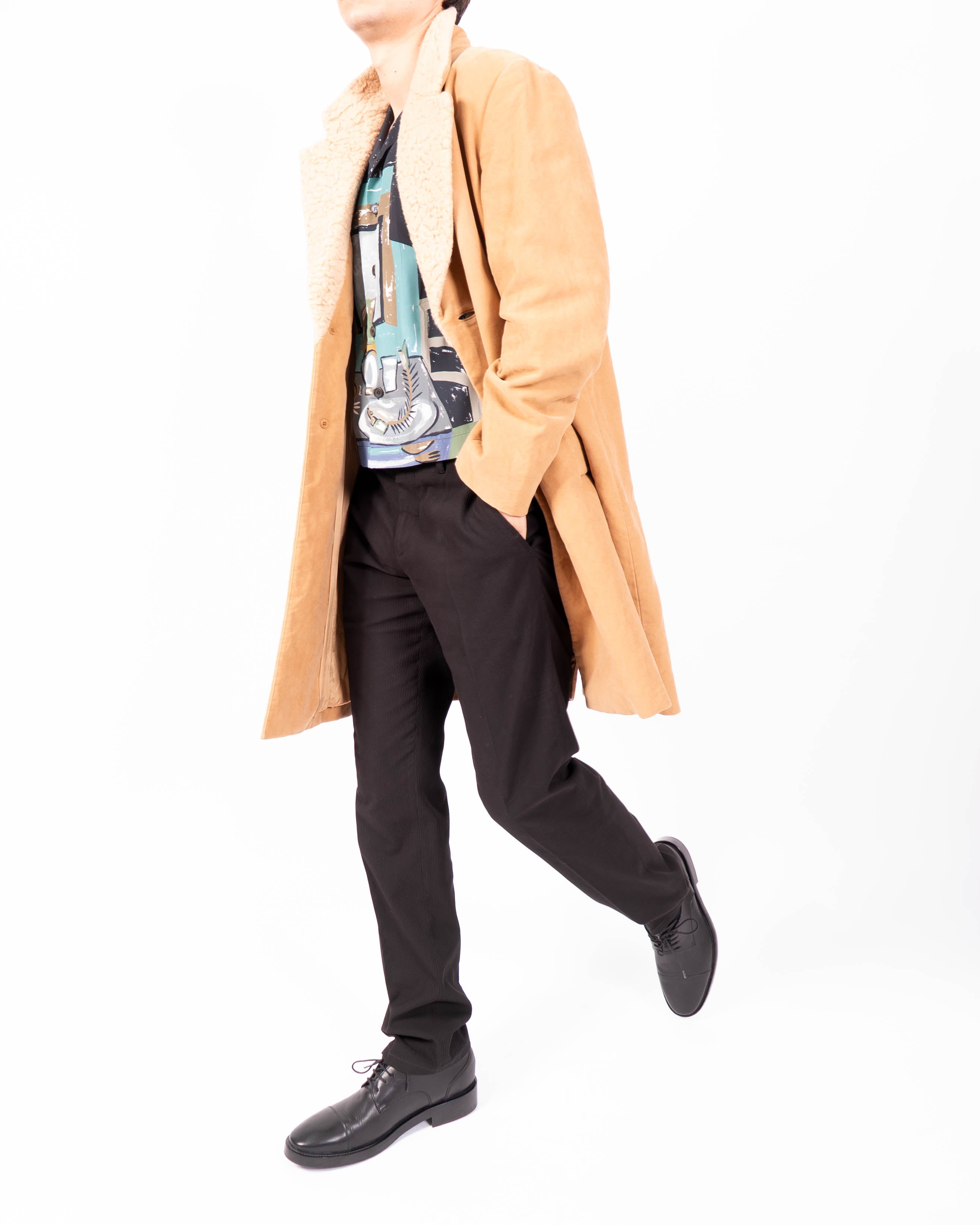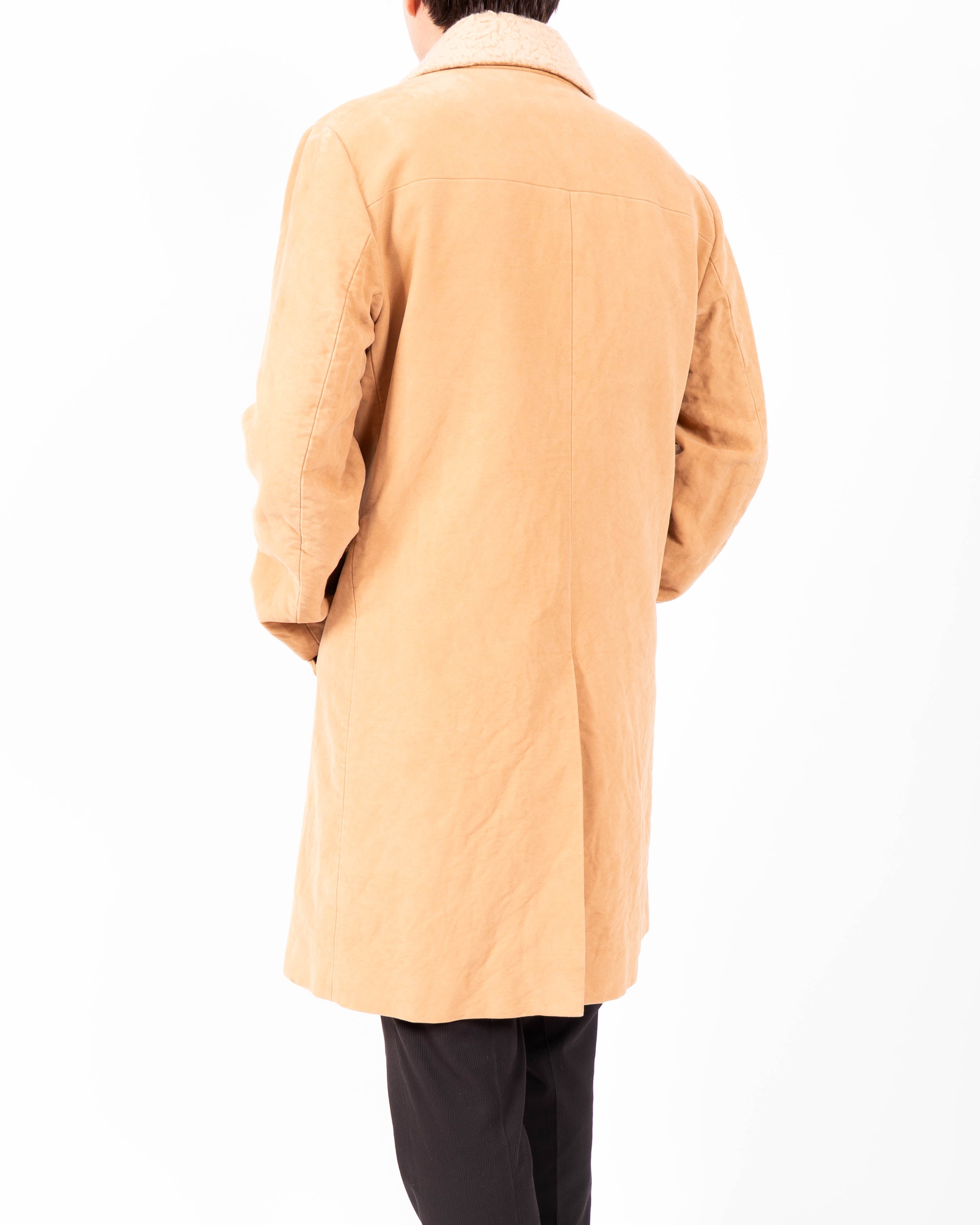 The 2010 Wool Trimmed Overcoat in beige highlights Prada’s ability to merge clean tailoring with subtle luxury. Cut from soft beige wool, the coat is defined by its relaxed straight silhouette and sharp lapel line. A standout feature is the shearling trimmed collar, which adds both texture and warmth while sticking to classic menswear outerwear.