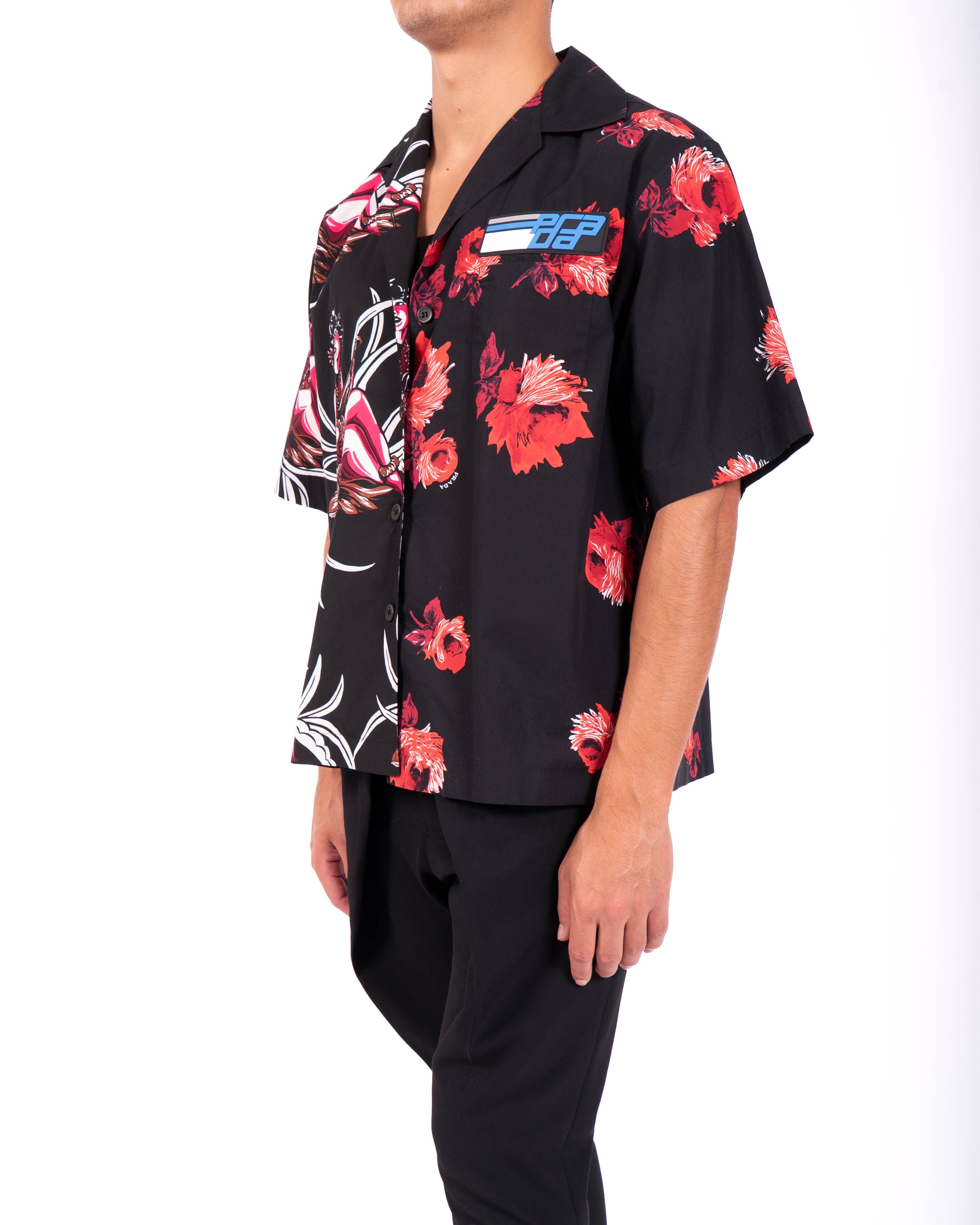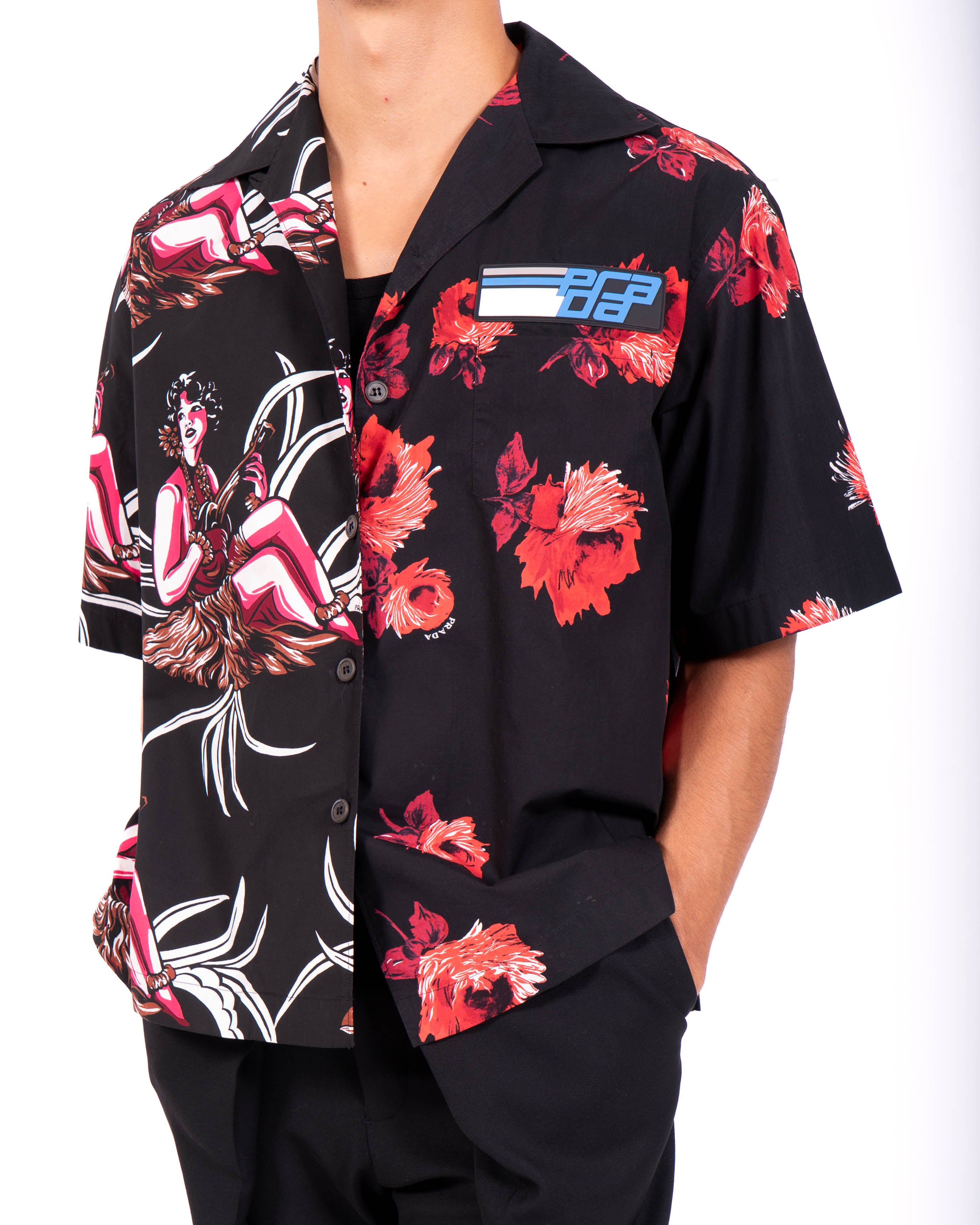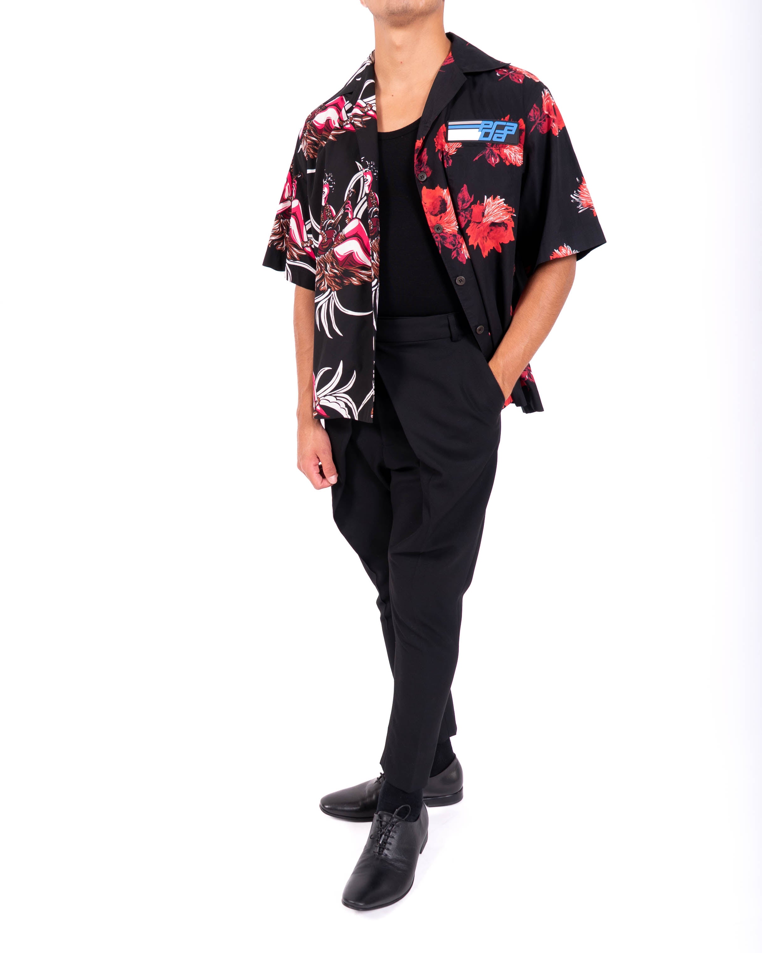 This short-sleeved bowling shirt was featured in the Fall/Winter 2018 collection under the creative direction of Raf Simons for Calvin Klein 205W39NYC. Crafted from smooth, lightweight cotton, it showcases a striking contrast print featuring pin up inspired motifs and vibrant red floral accents. The relaxed silhouette with a camp collar evokes classic mid century Americana, while the blue rubber logo patch at the chest adds a modern, industrial touch that became a signature of the era. Designed to blur the lines between nostalgia and subversion, this piece perfectly encapsulates Simons’ cinematic vision for Calvin Klein: bold and ironic.