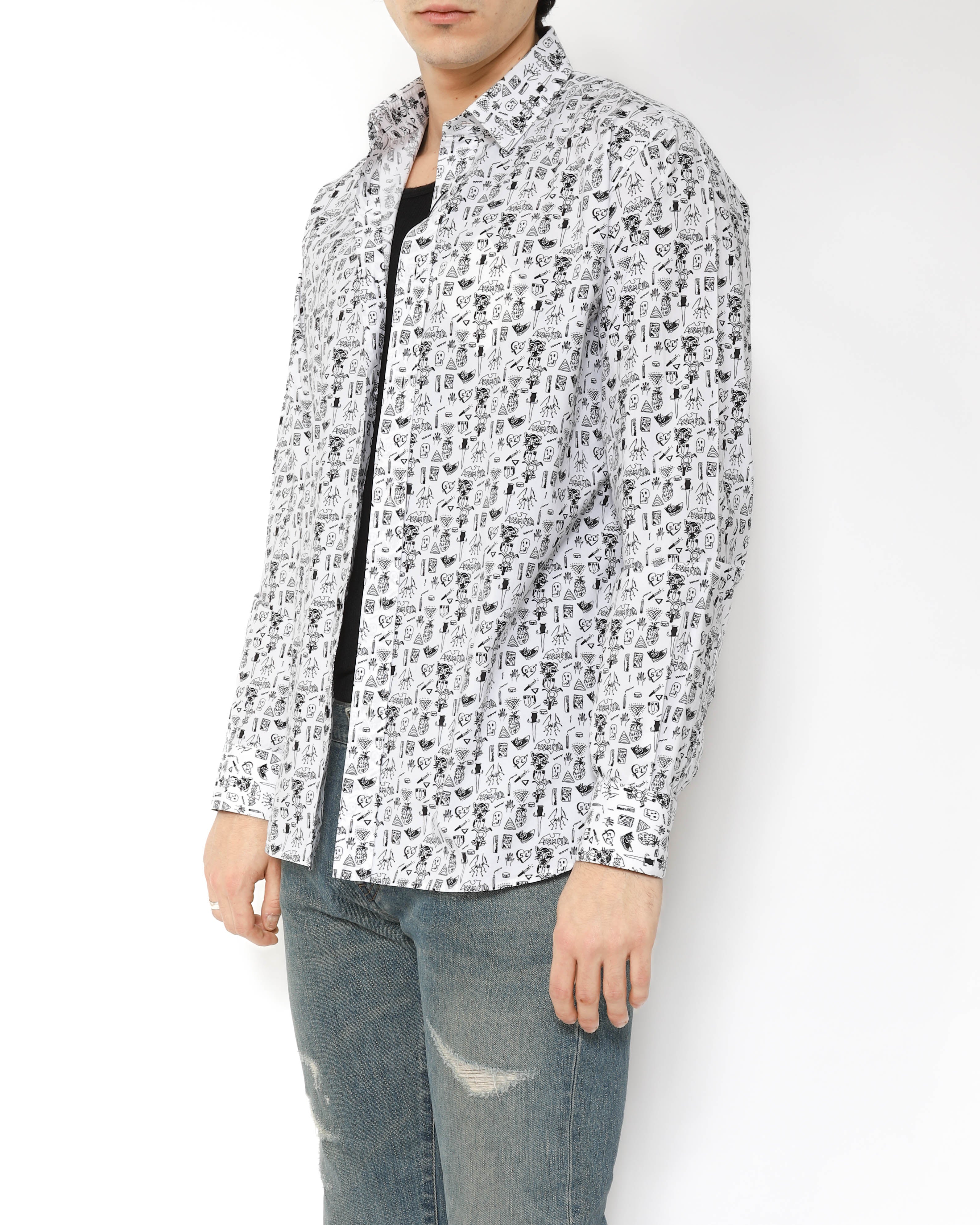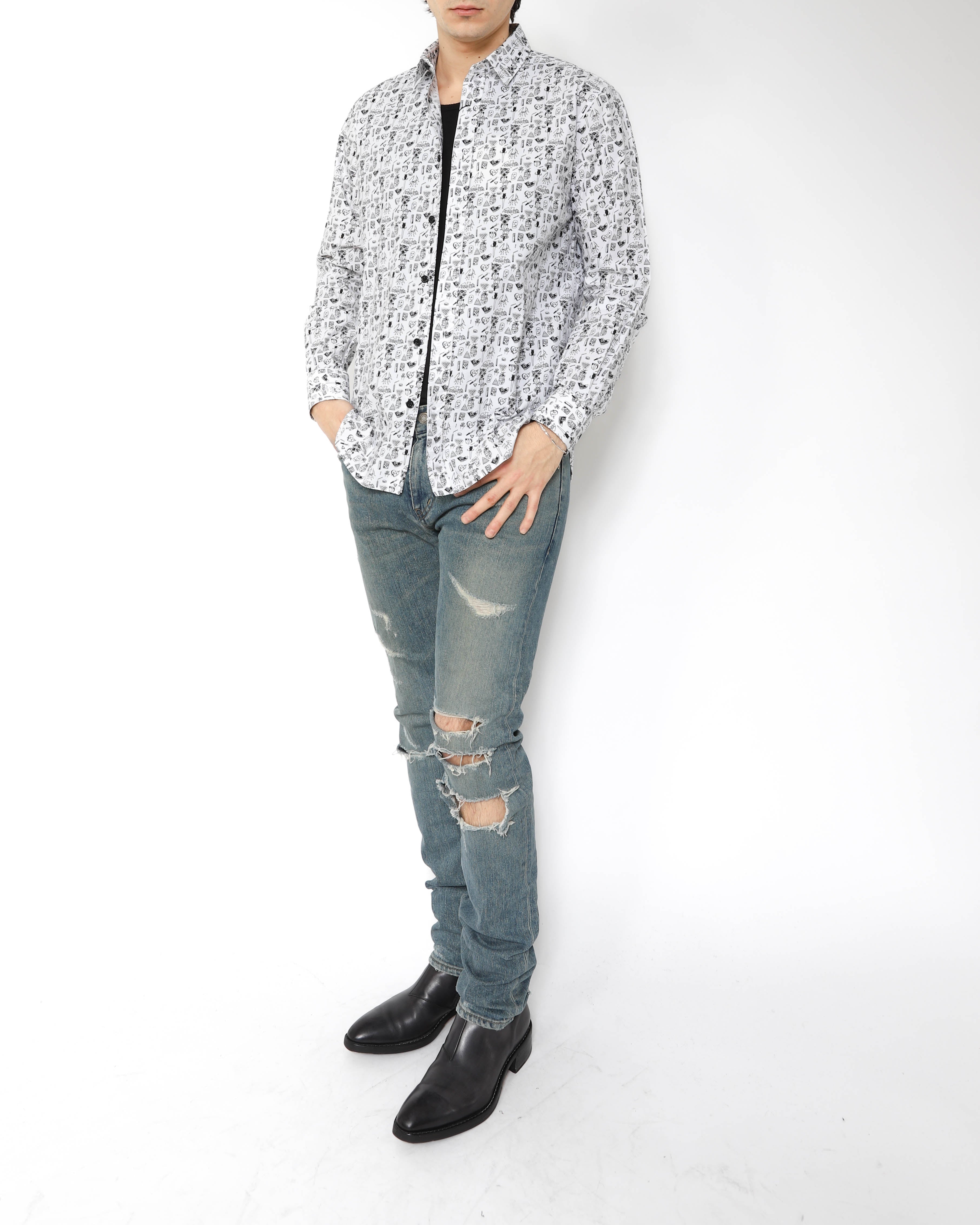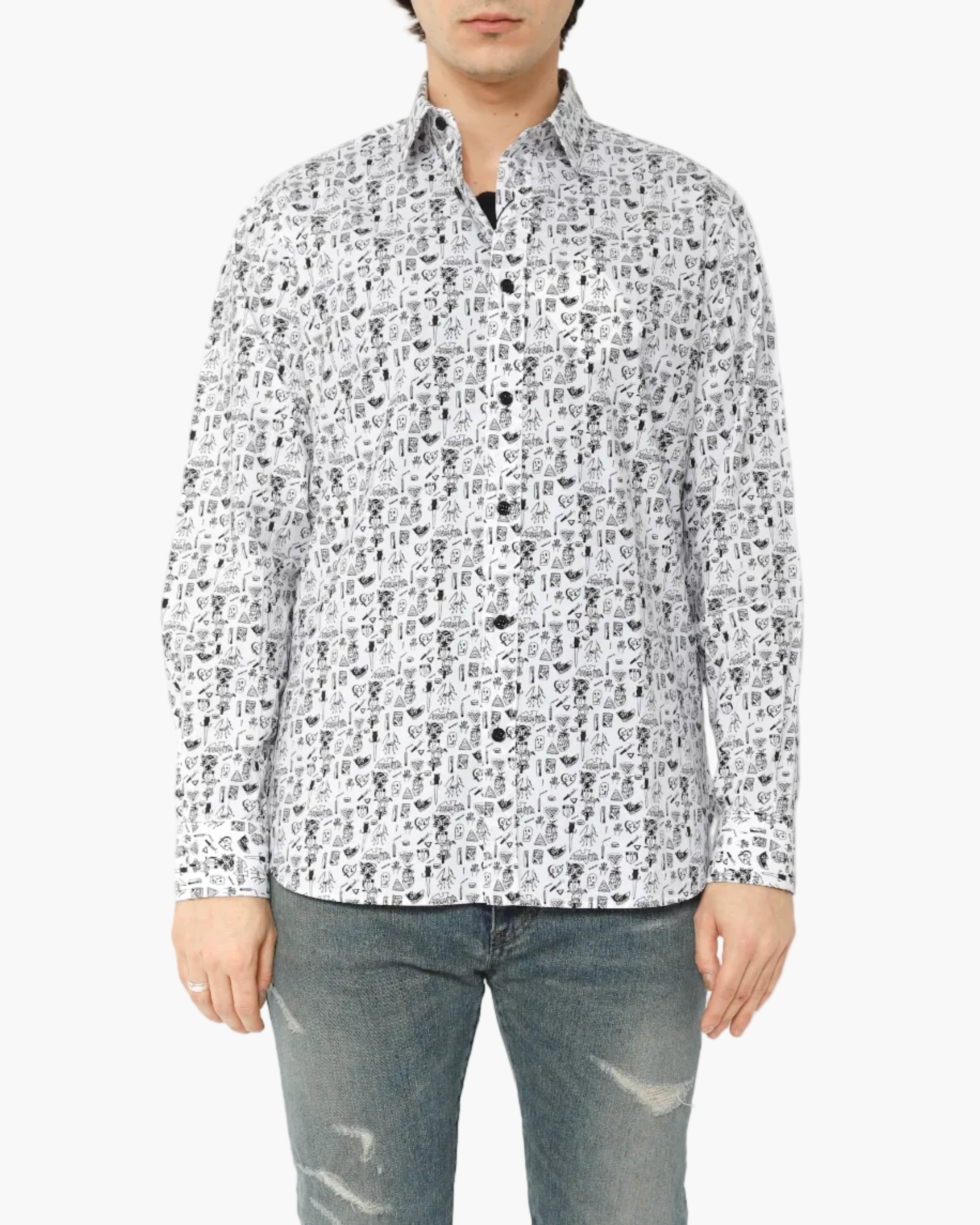 Hedi Slimane often played with playful graphics rooted in classic iconography throughout his Saint Laurent collections. This shirt from SS14 captures that spirit perfectly: a crisp cotton poplin base covered in an all-over symbol print that gives the piece a look that feels both lighthearted and sharply considered.
