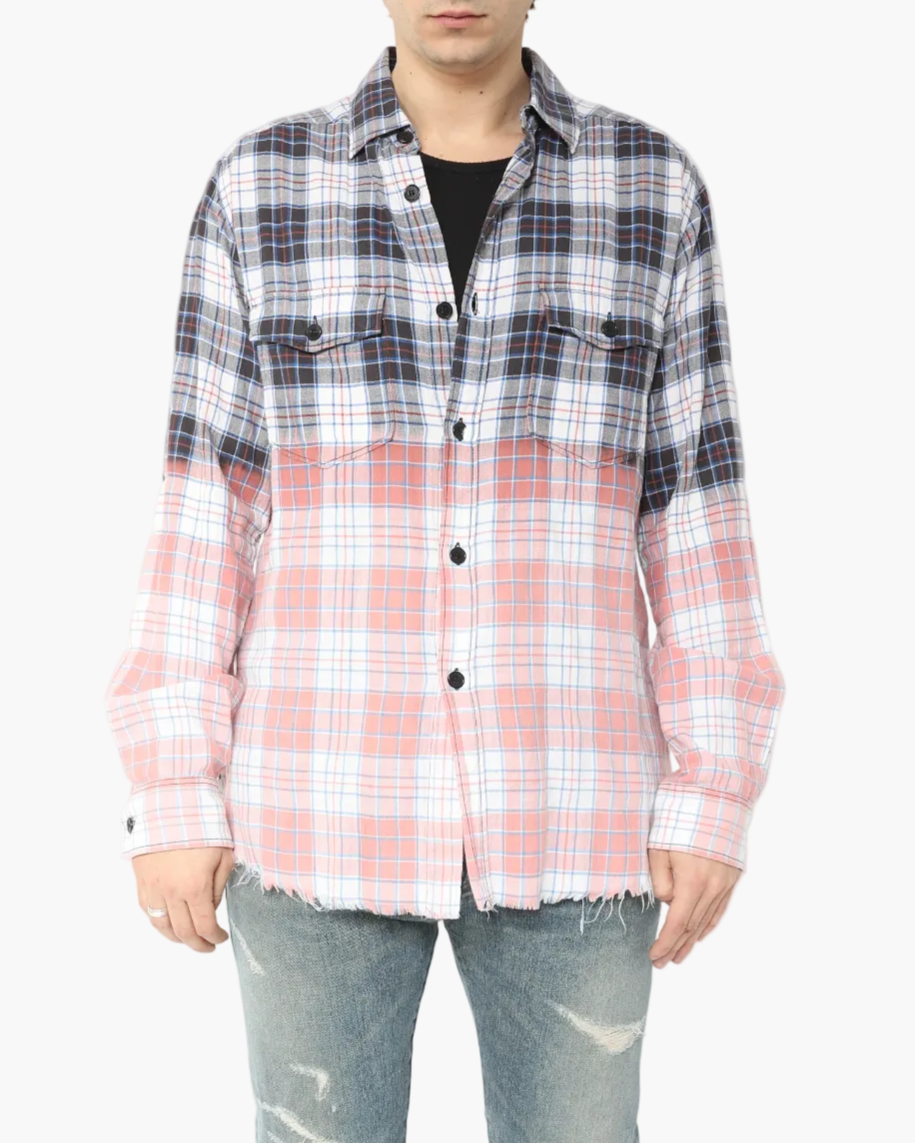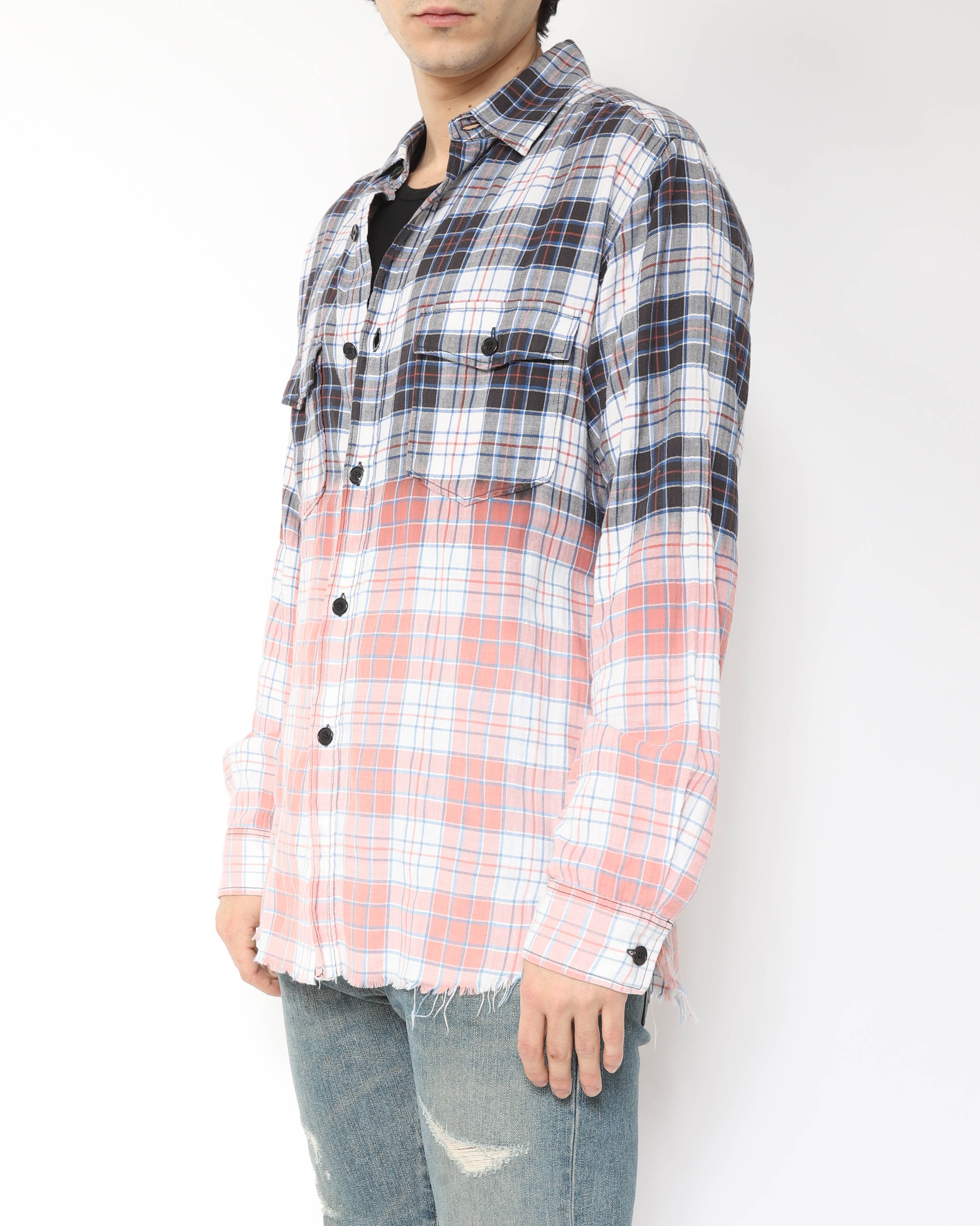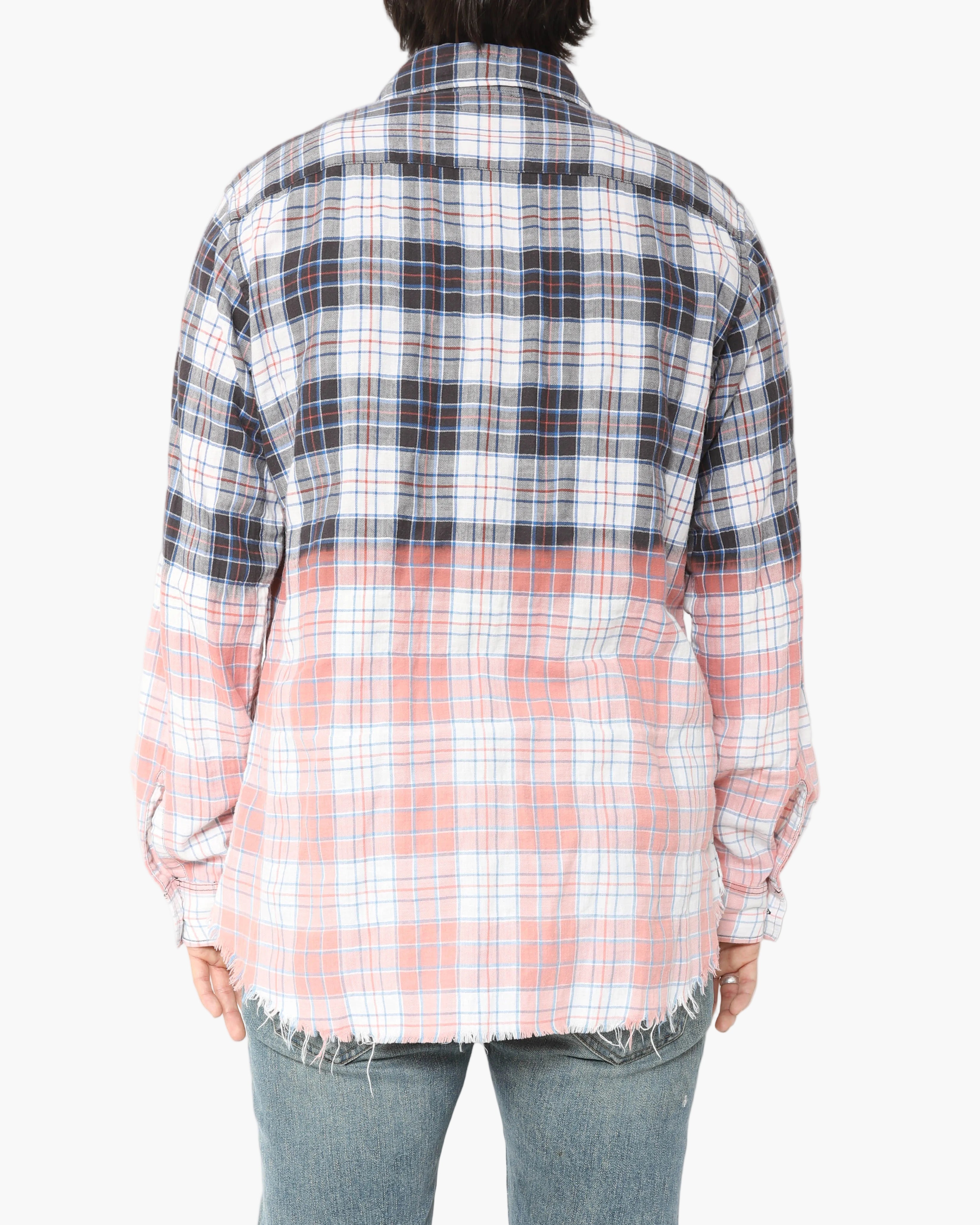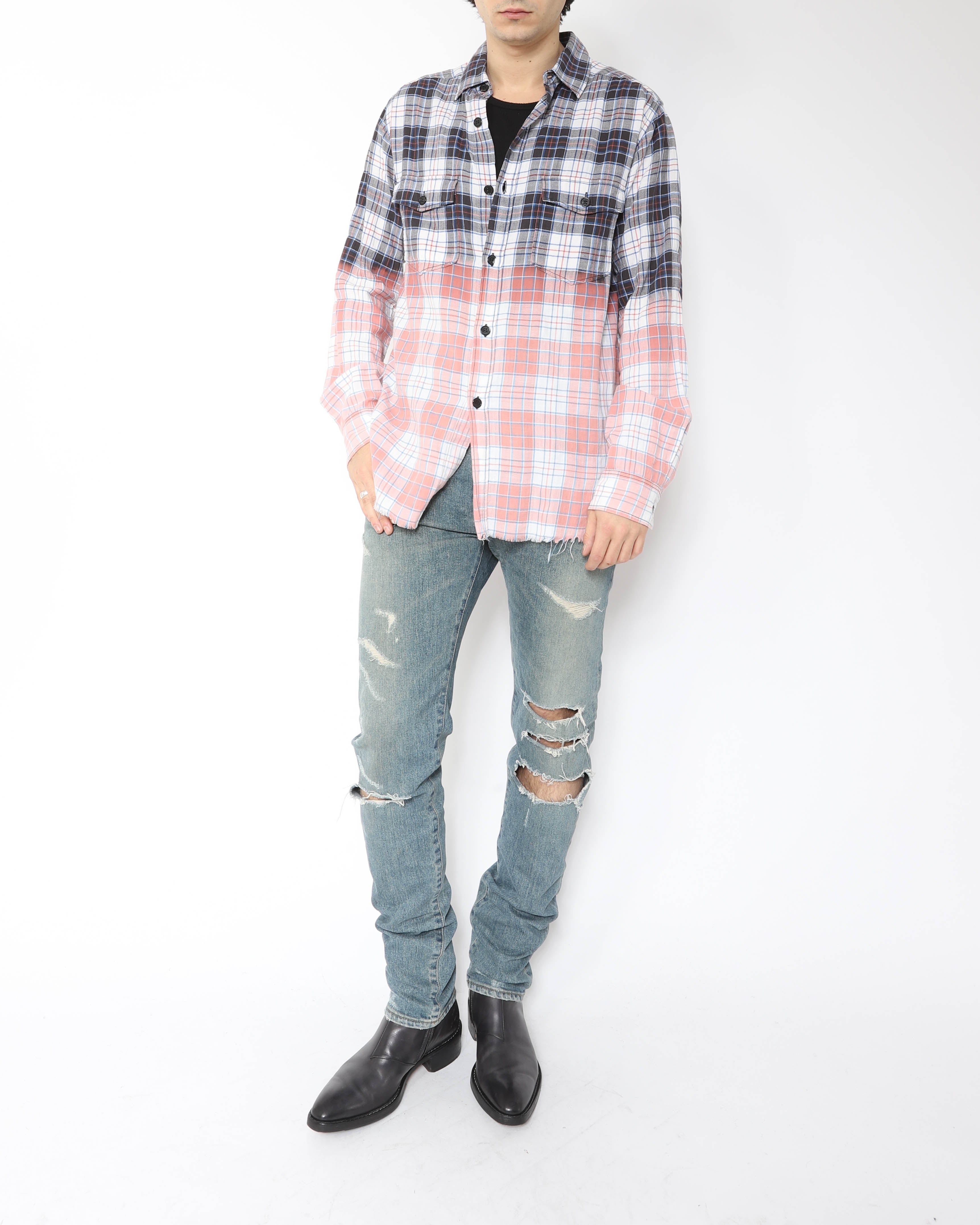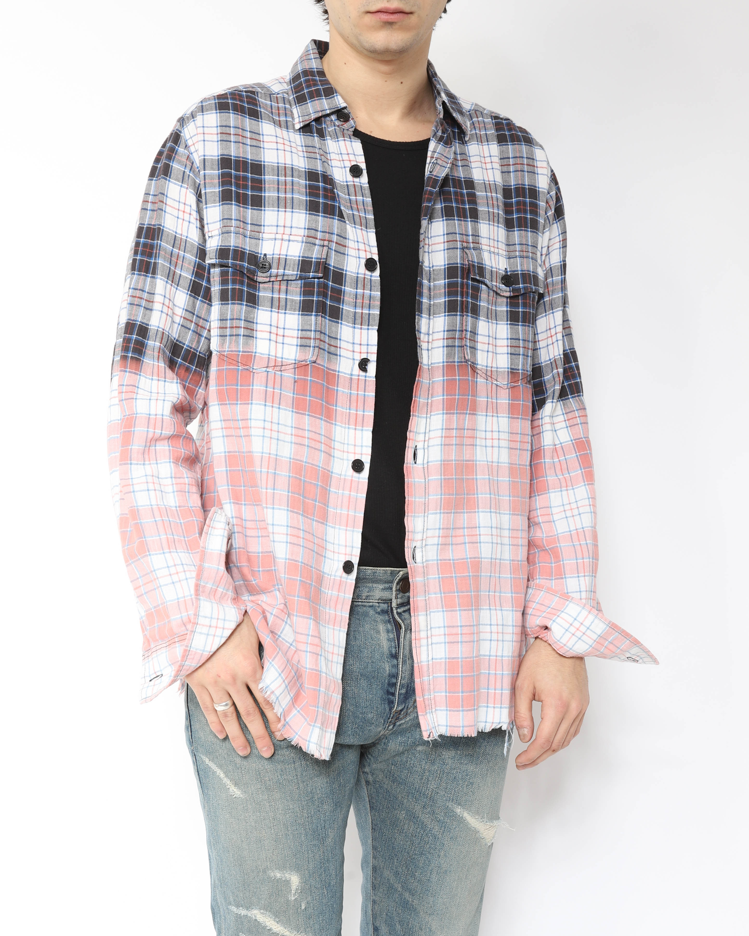This SS16 bleached distressed flannel from Saint Laurent is one of the standout shirts from Hedi Slimane’s Surf Sound season. The defining feature is the strong color fade, shifting from deep blue at the shoulders into orange through the lower half, finished with a naturally worn looking distressed hem. The fit is slightly oversized, so it works well buttoned up or worn open as a light layer.