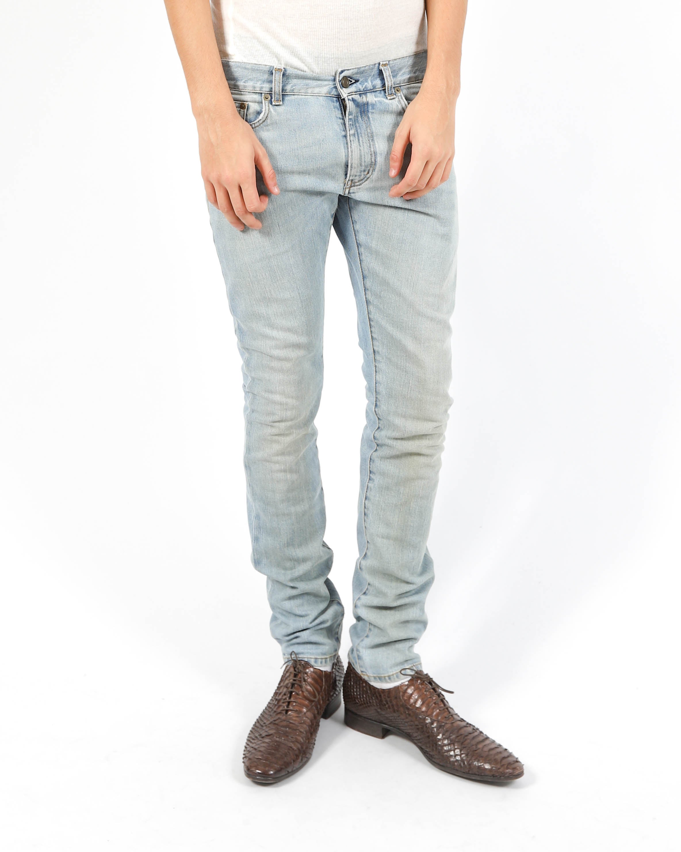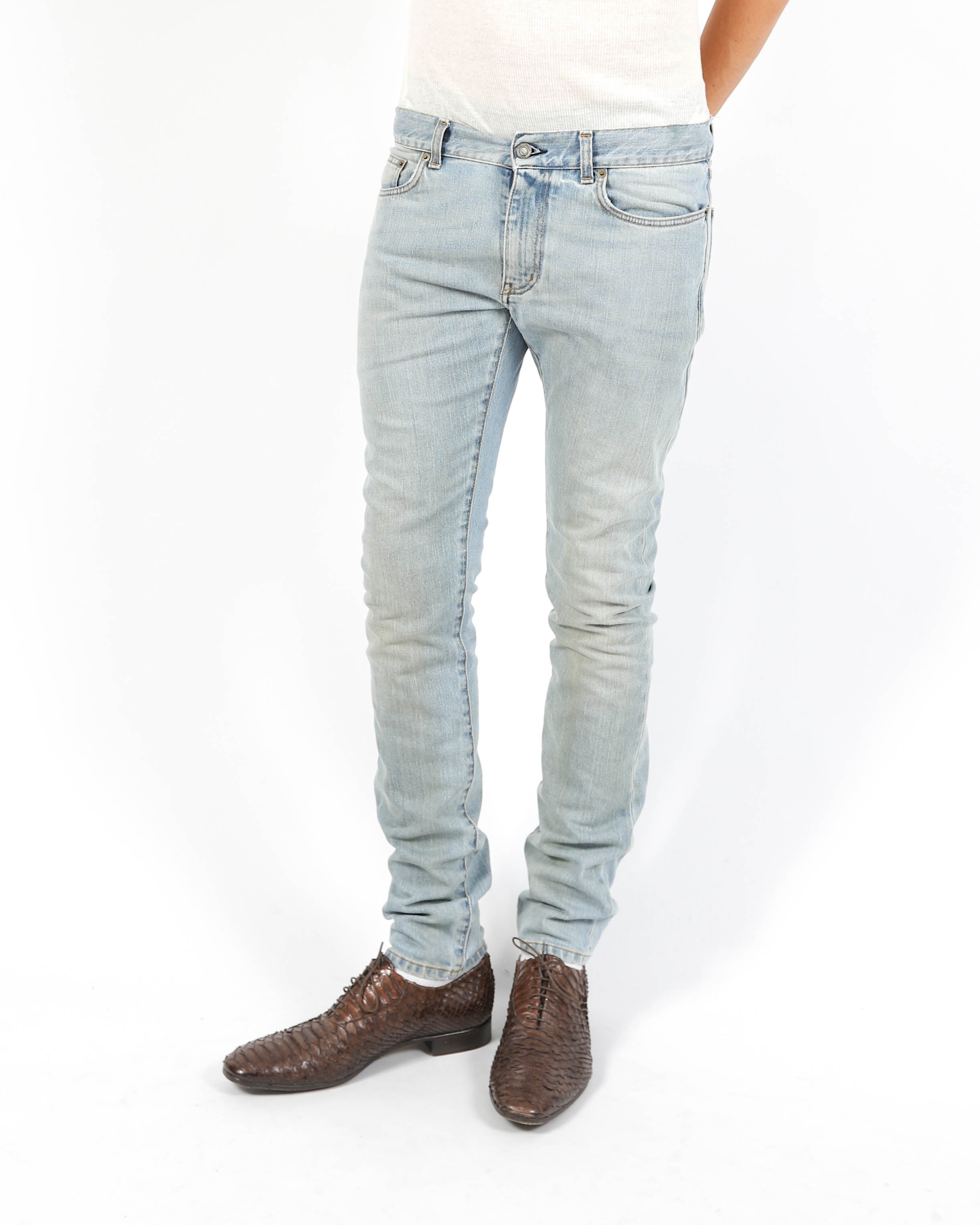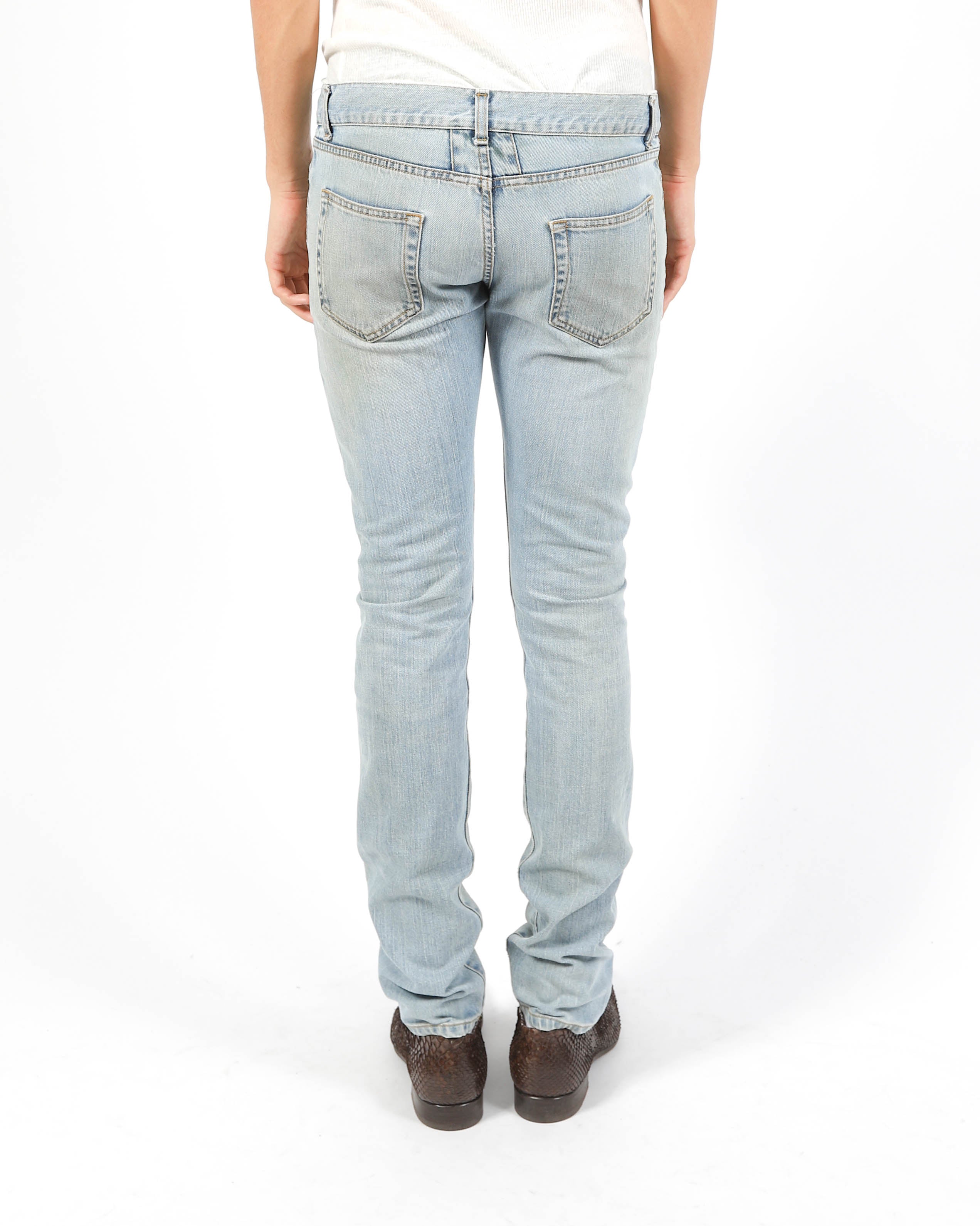 These skinny jeans in washed denim from FW13 are taut and streamlined, designed to hug the leg with clarity. The washed finish gives the fabric a softened, lived-in tone without losing structure.