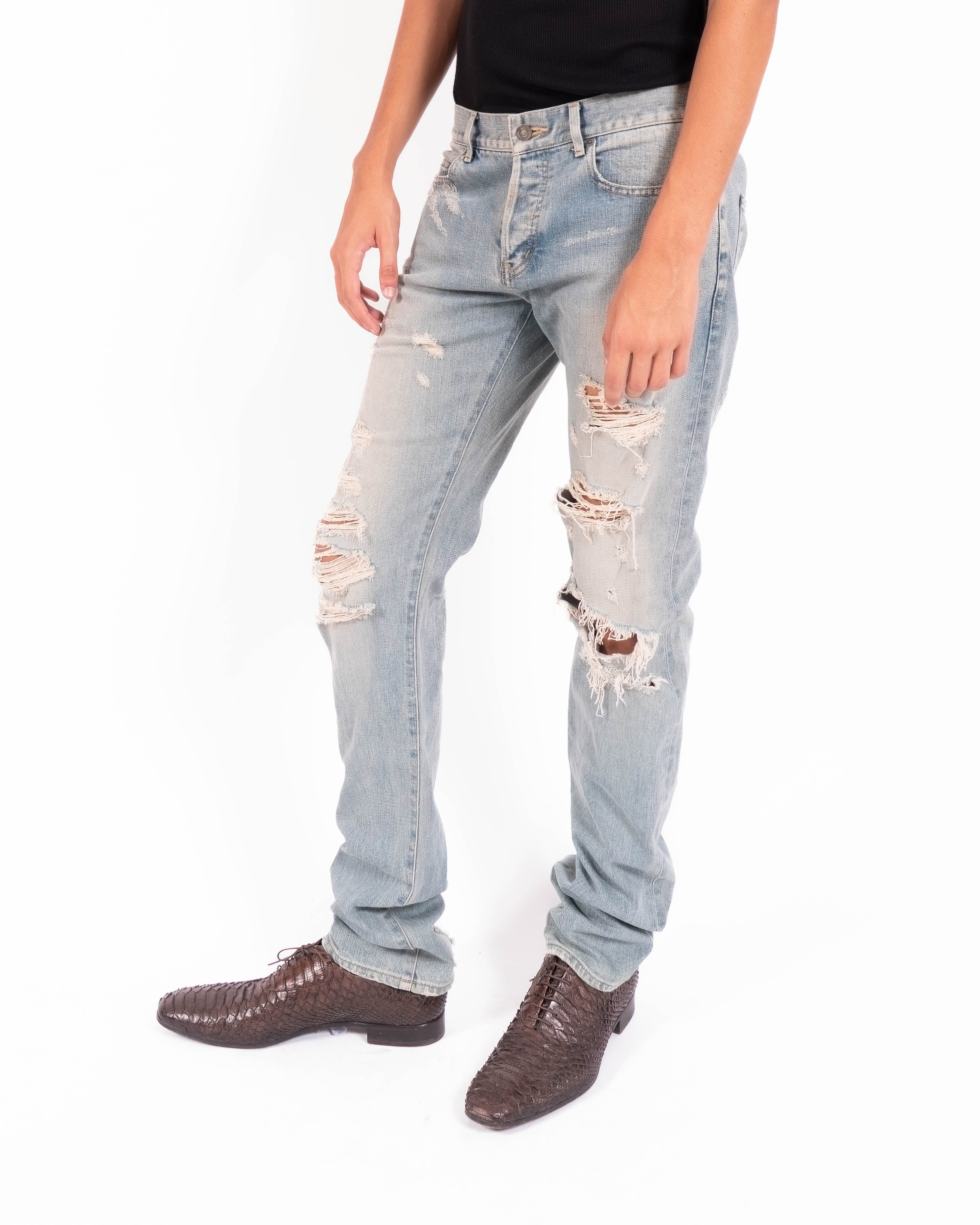 Crafted in washed blue denim, the fabric is heavily distressed with rips and abrasions, creating a used look that carries the raw edge of Hedi Slimane’s vision for Saint Laurent. Each tear is carefully placed, balancing rugged character with a sense of design.