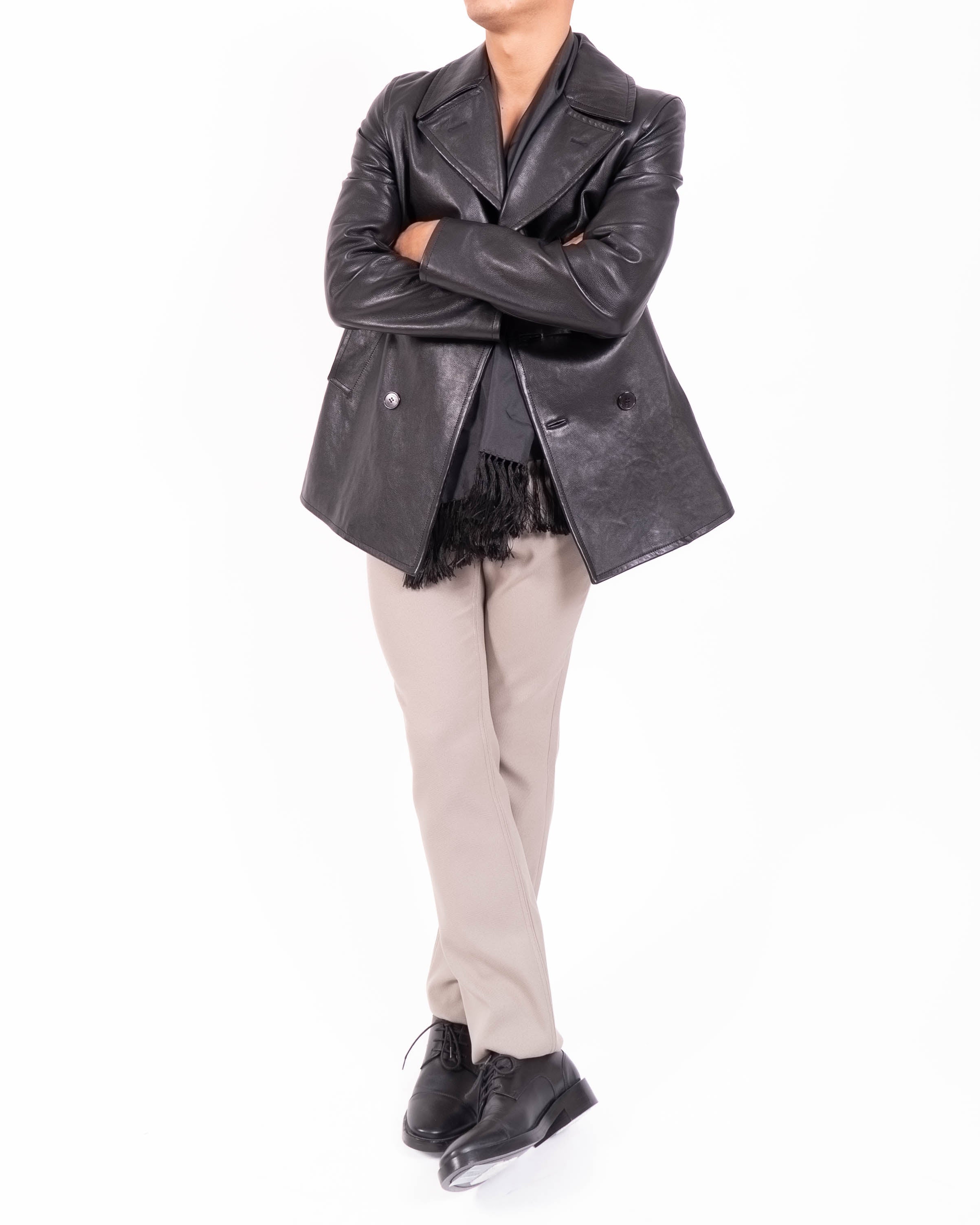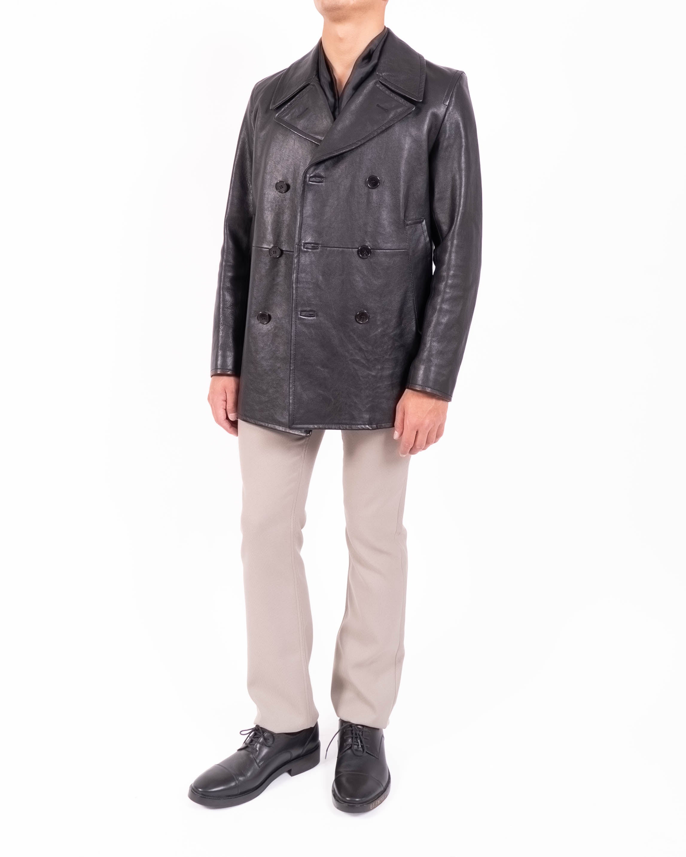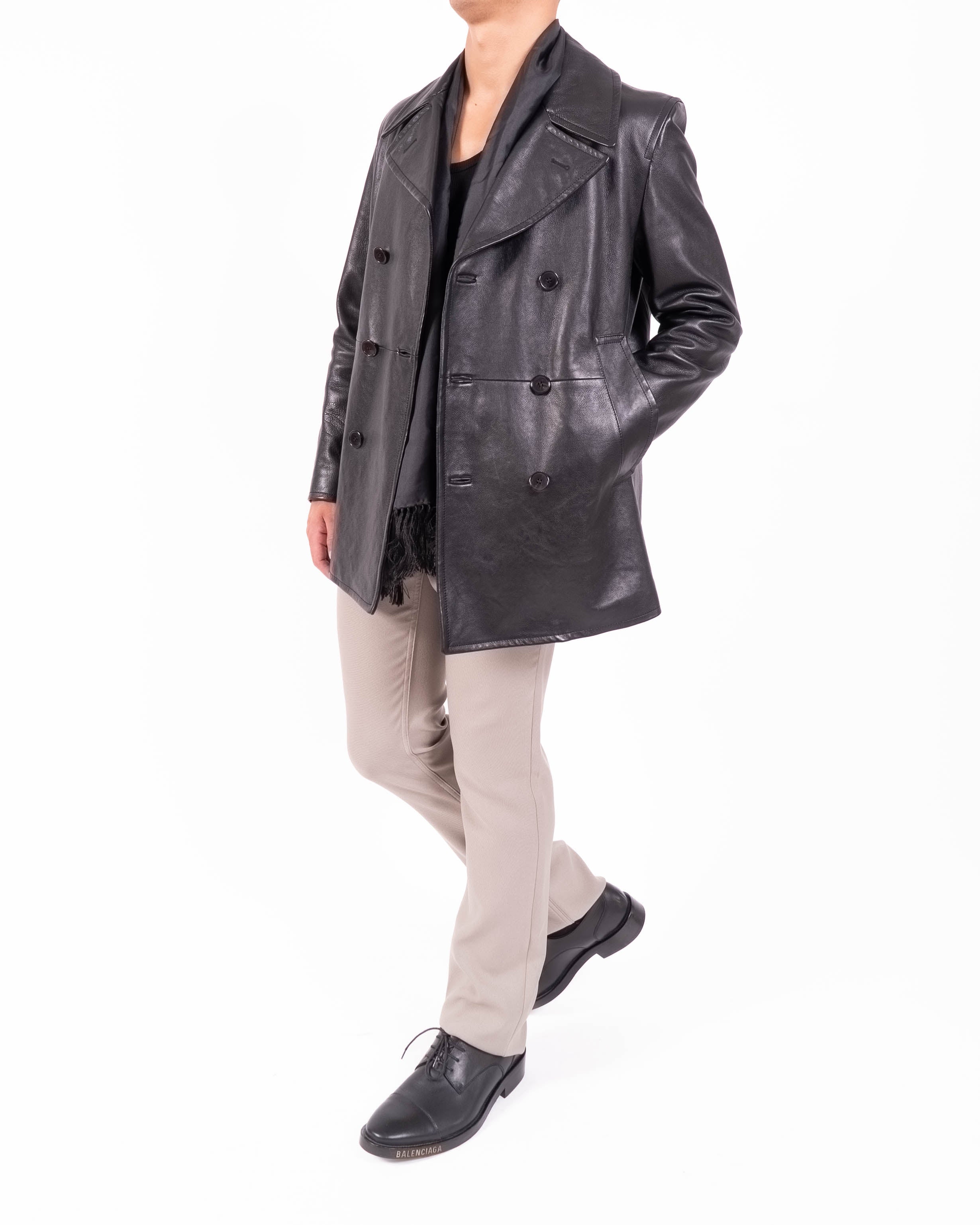 Introduced in the Fall Winter 2017 collection, this double-breasted coat reinterprets a classic outerwear form through the use of textured calf leather. Its boxy cut and elongated lines lend the piece a structured silhouette, while wide peak lapels and a six-button front closure underline its tailored foundation.