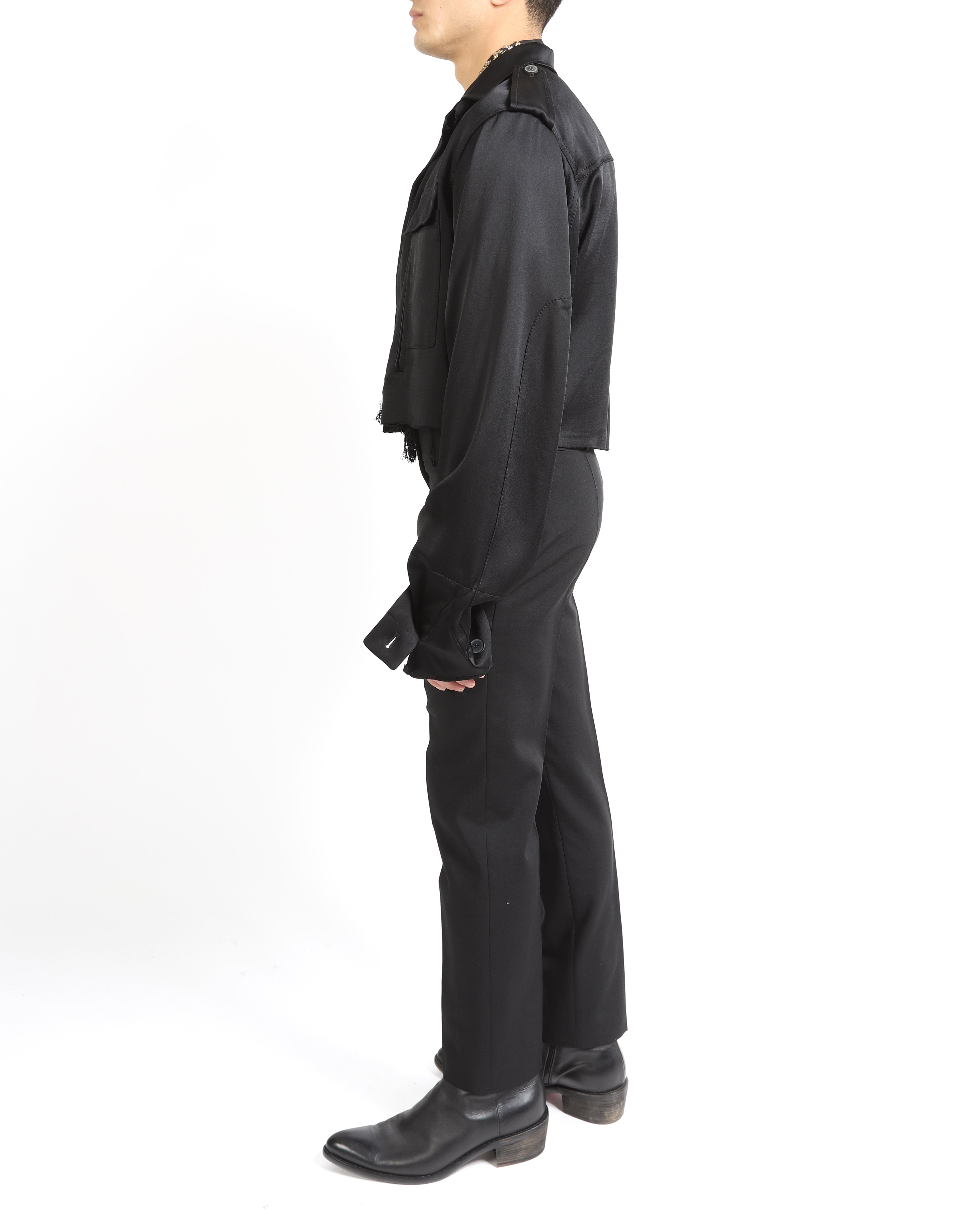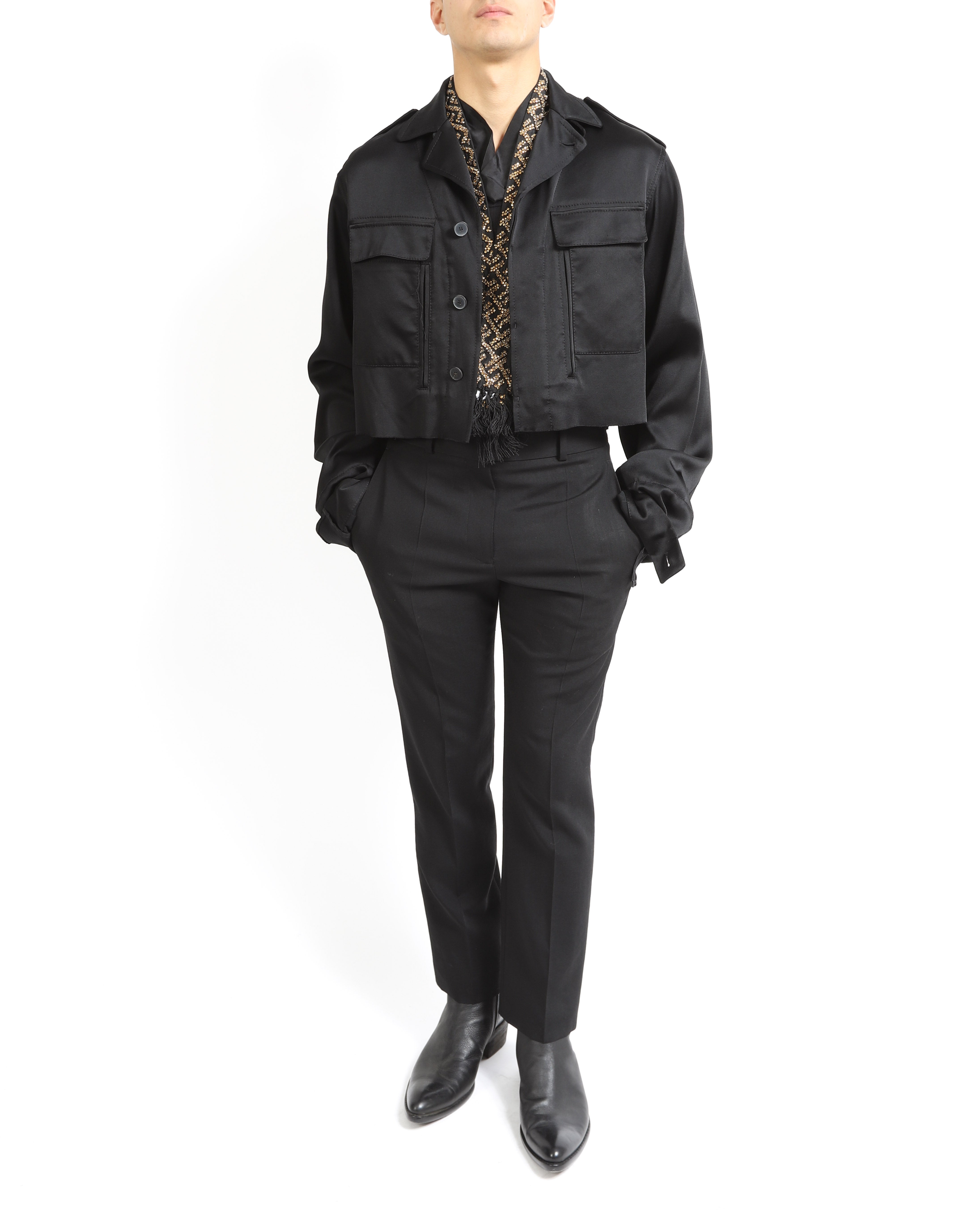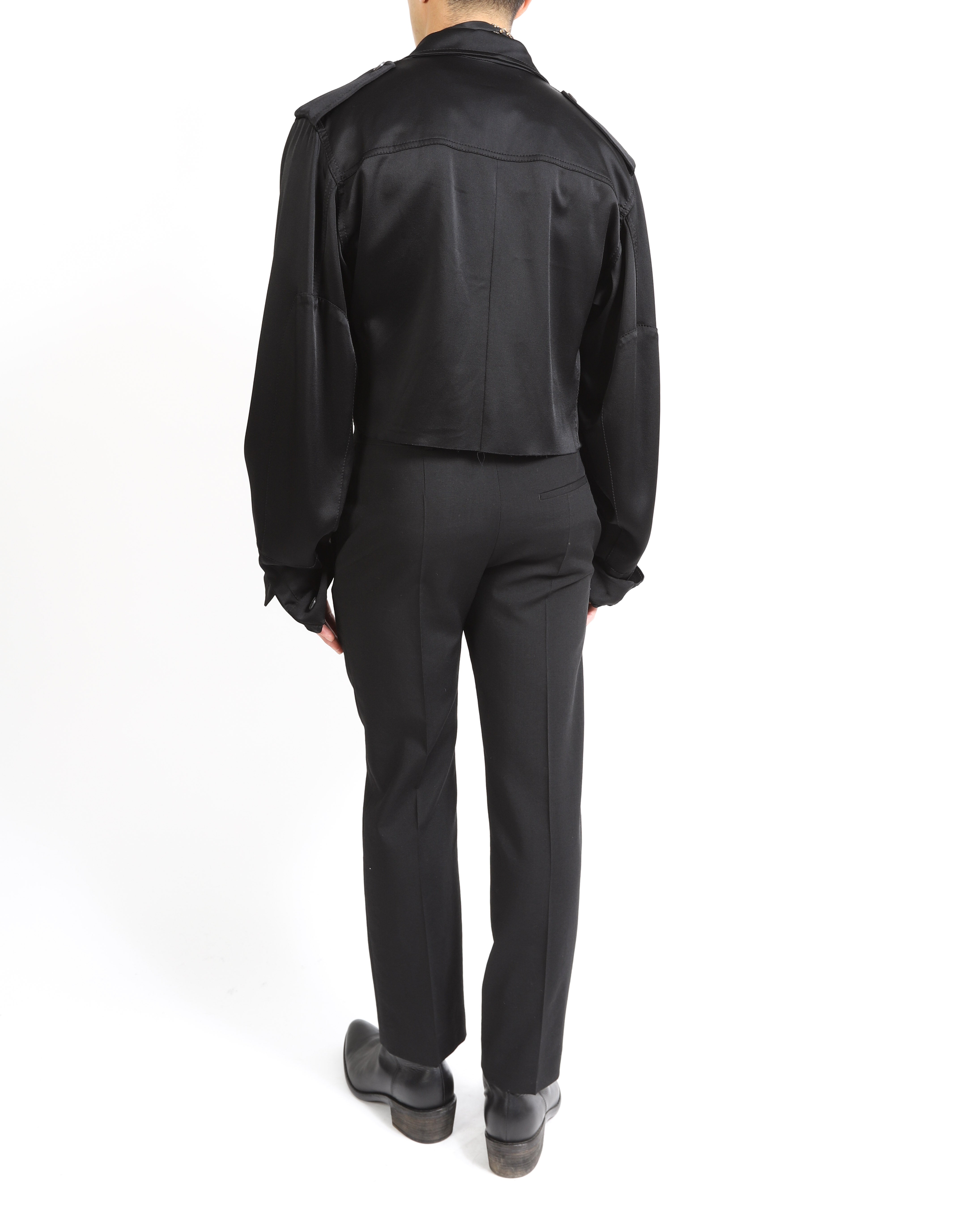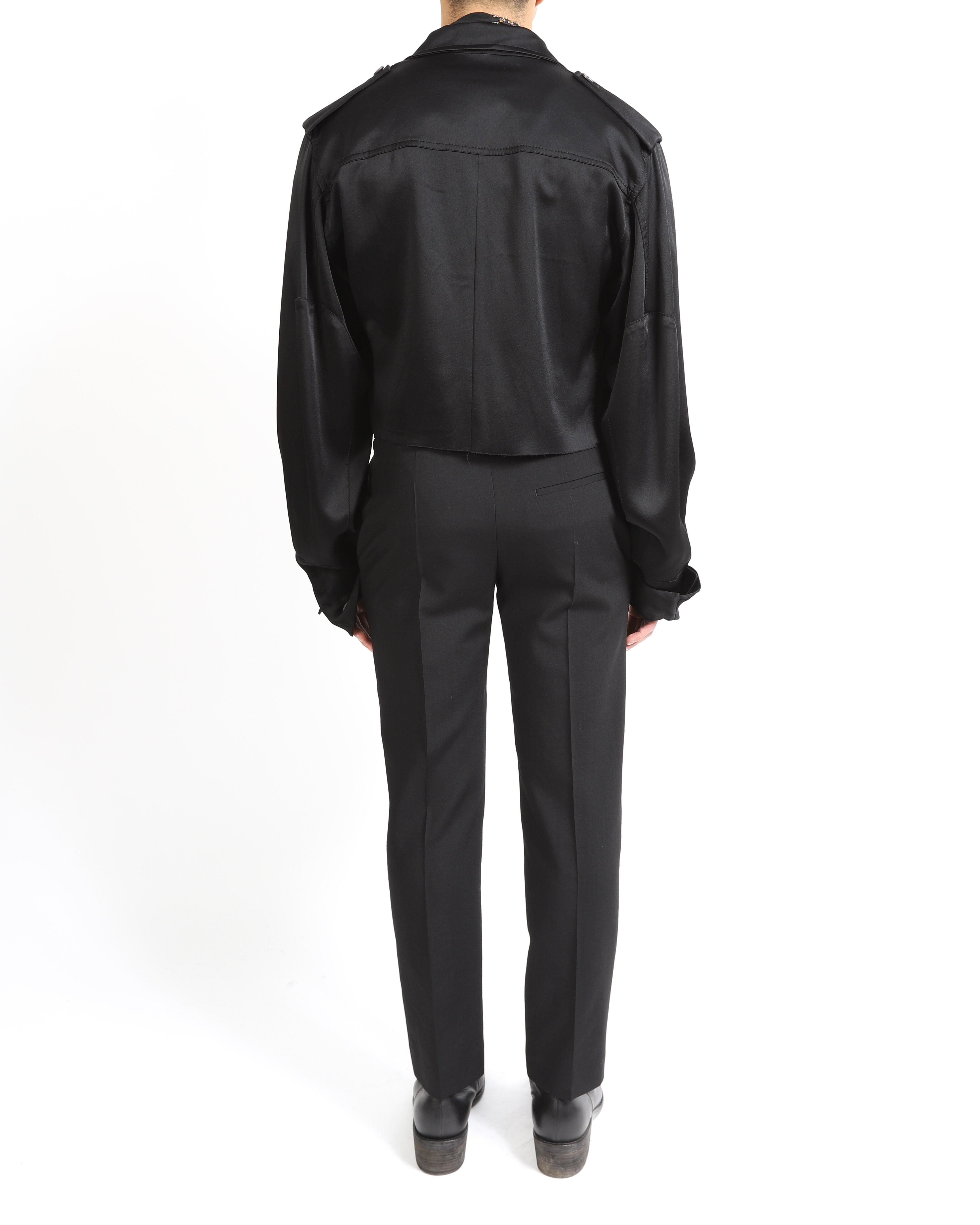 This cropped military jacket from FW17 is crafted from smooth black satin, giving it a clean and structured look. The silhouette is slightly shortened.