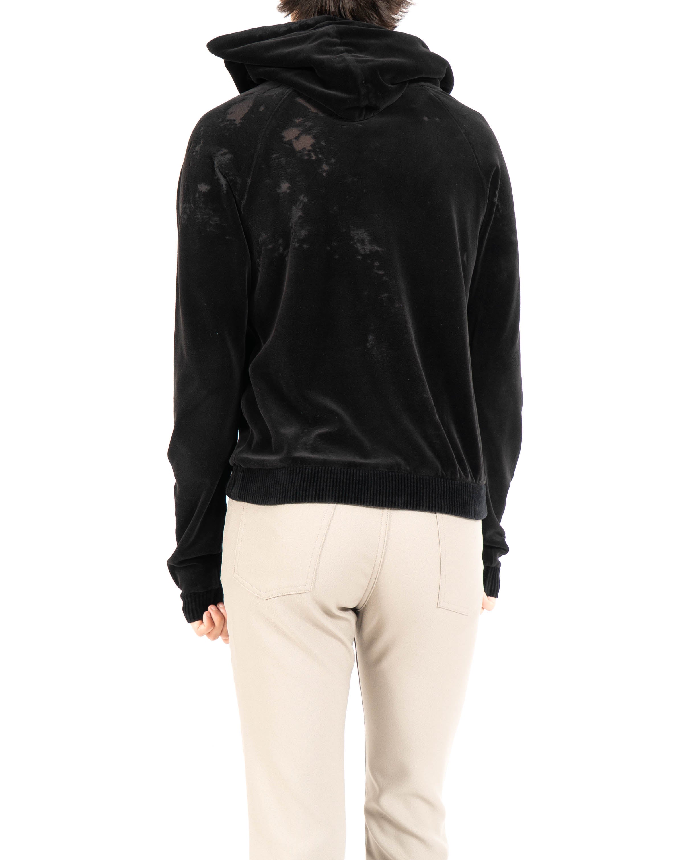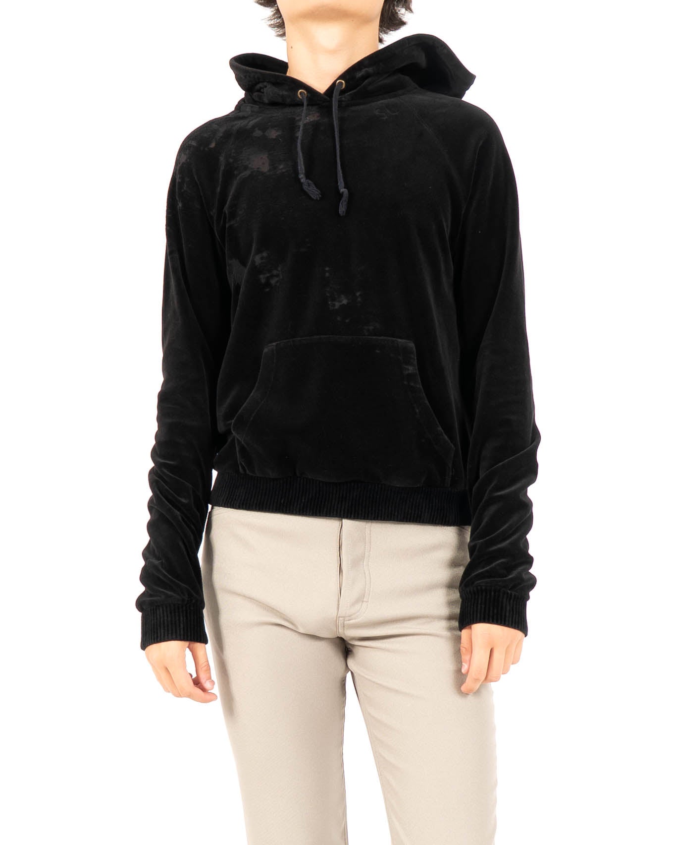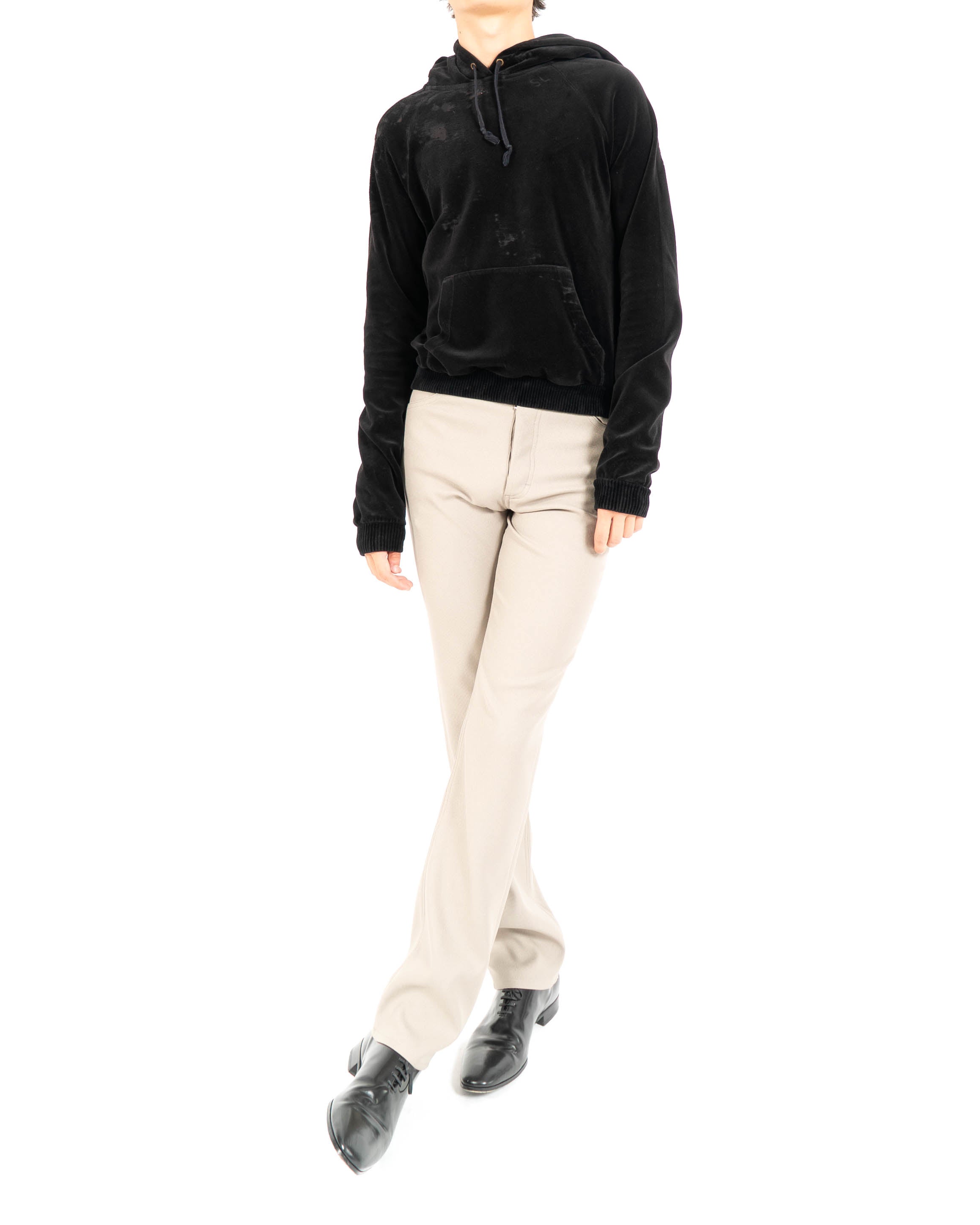 This Saint Laurent hoodie from FW18 reimagines casualwear with a subversive twist. Crafted from plush black velvet, the piece balances luxury and rebellion, while subtle distressing throughout introduces an intentionally used character. Its slouchy fit and soft feel contrast with the raw edge of the detailing, embodying Slimane’s ability to fuse refinement with grunge energy. A piece that transforms the everyday hoodie into something elevated.