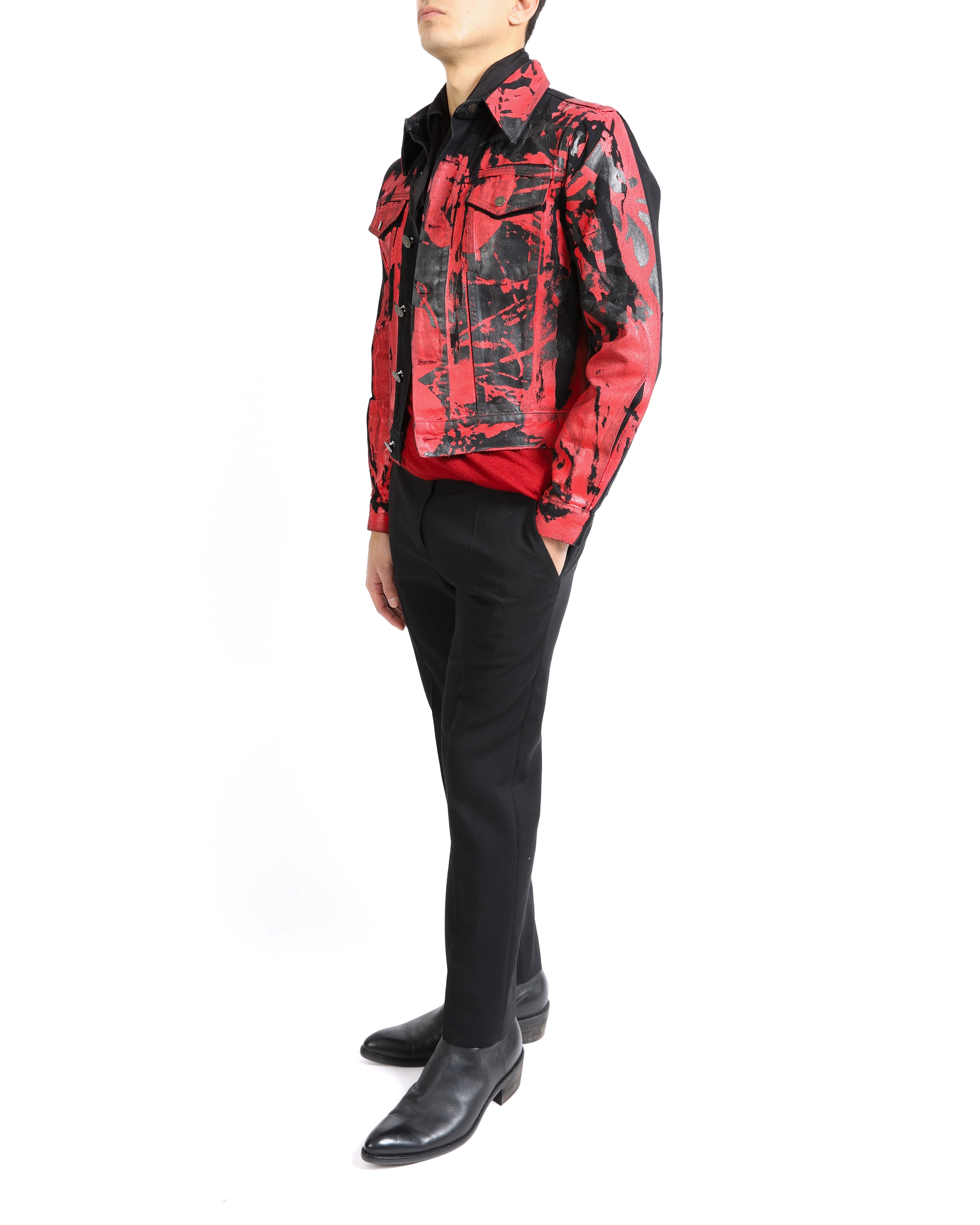 Cut in a classic trucker silhouette, it holds a structured line through the shoulders. A black leather patch across the back introduces subtle contrast. Details are kept minimal to keep focus on the artwork and finish. A standout archival piece.