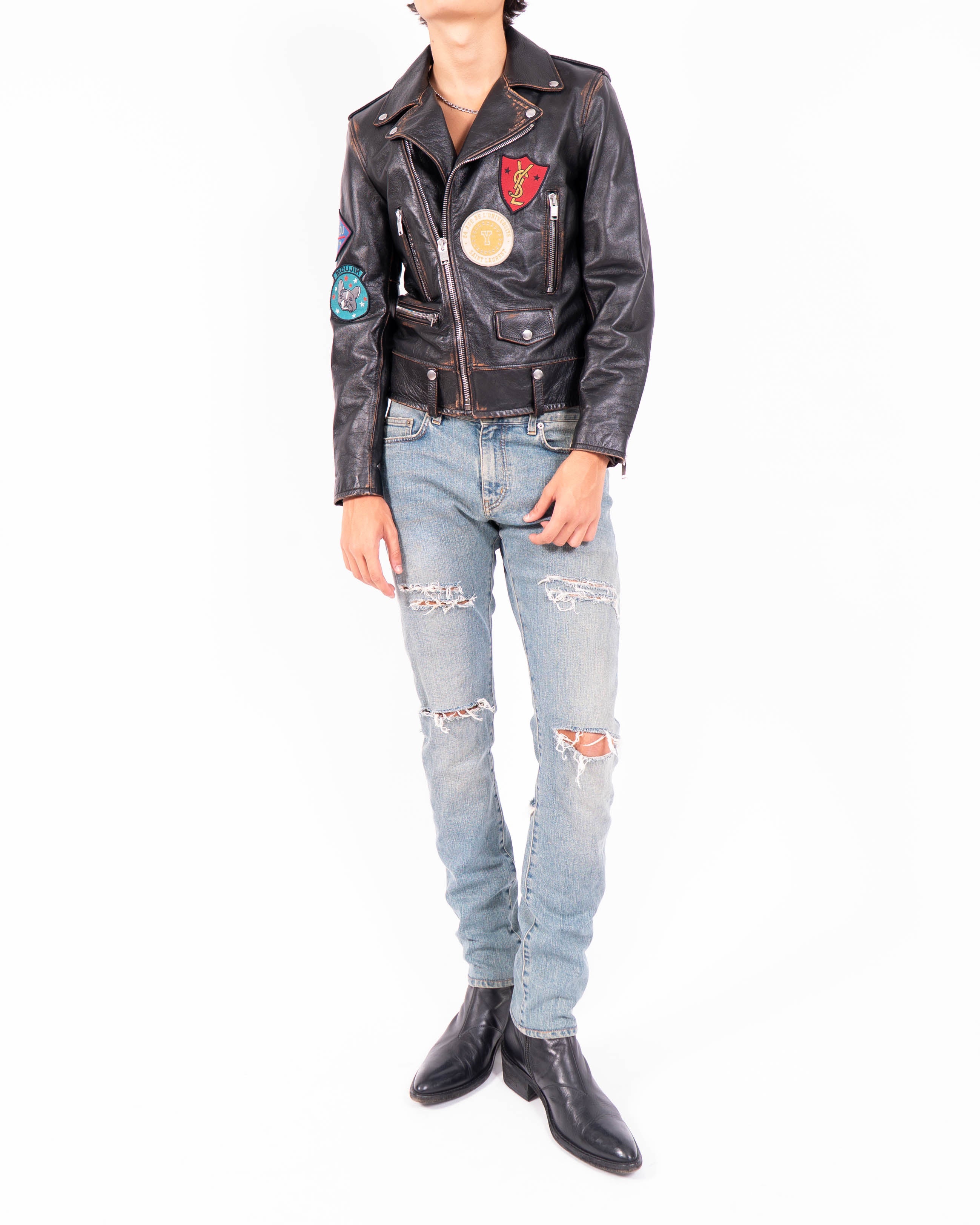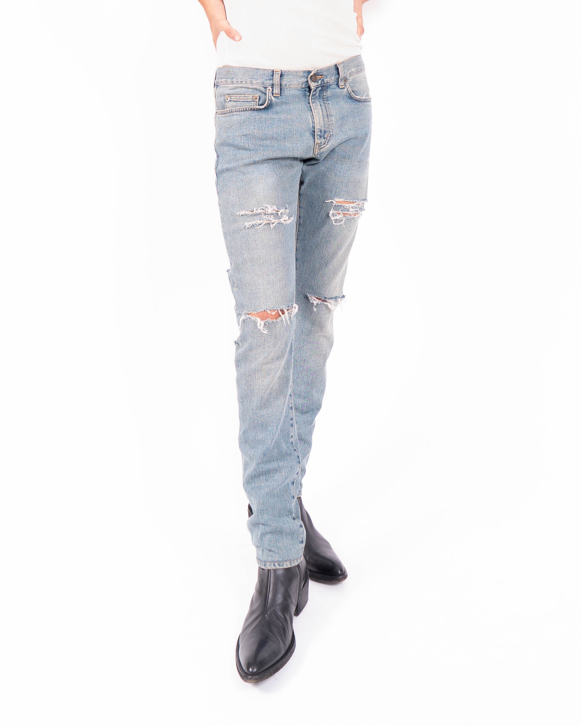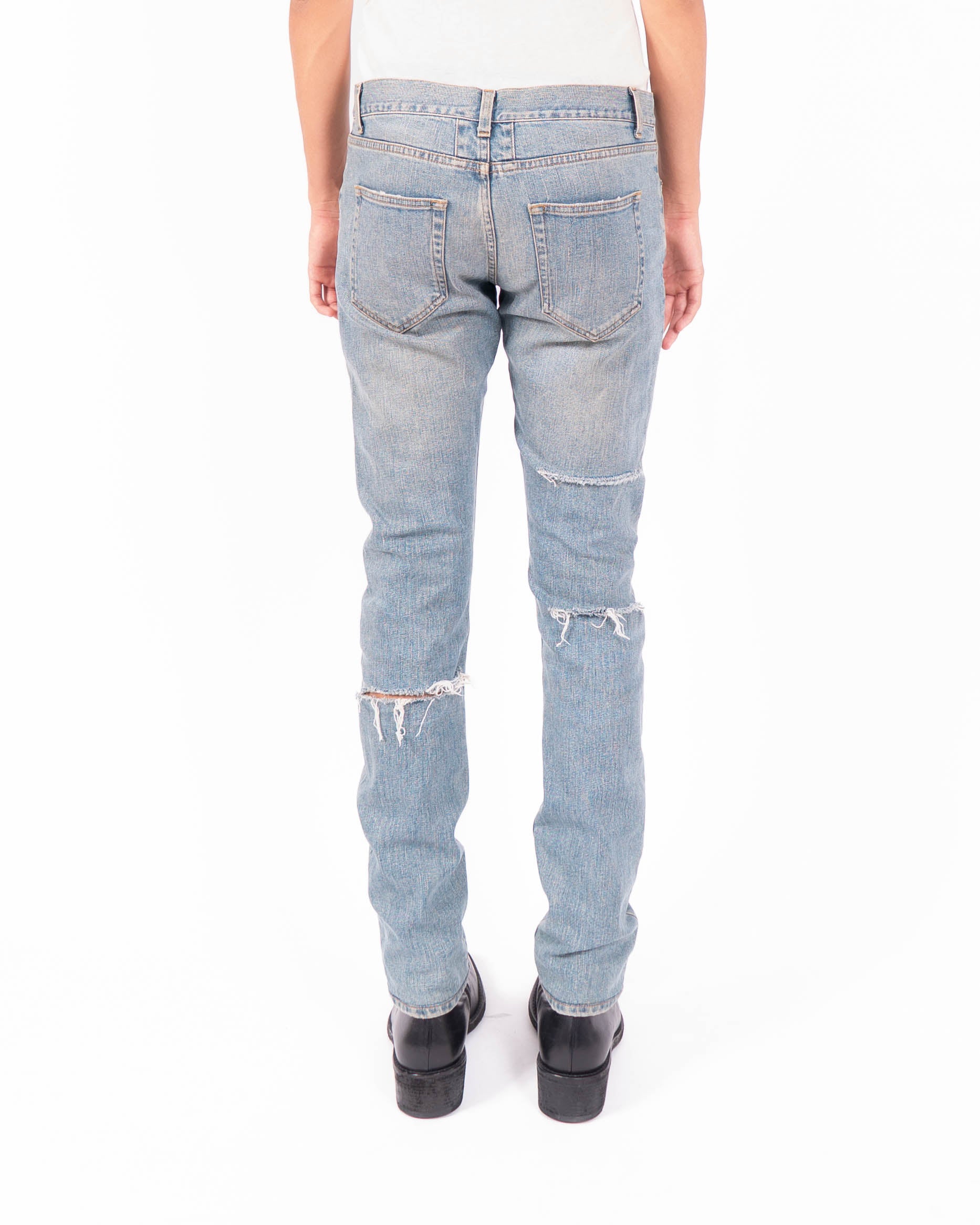 From the Spring Summer 2014 collection, these Back Rip Jeans reflect Saint Laurent’s irreverent approach to denim under Hedi Slimane. The cut follows the D01 slim silhouette, closely fitted through the leg and tapered at the ankle for a sharp profile.