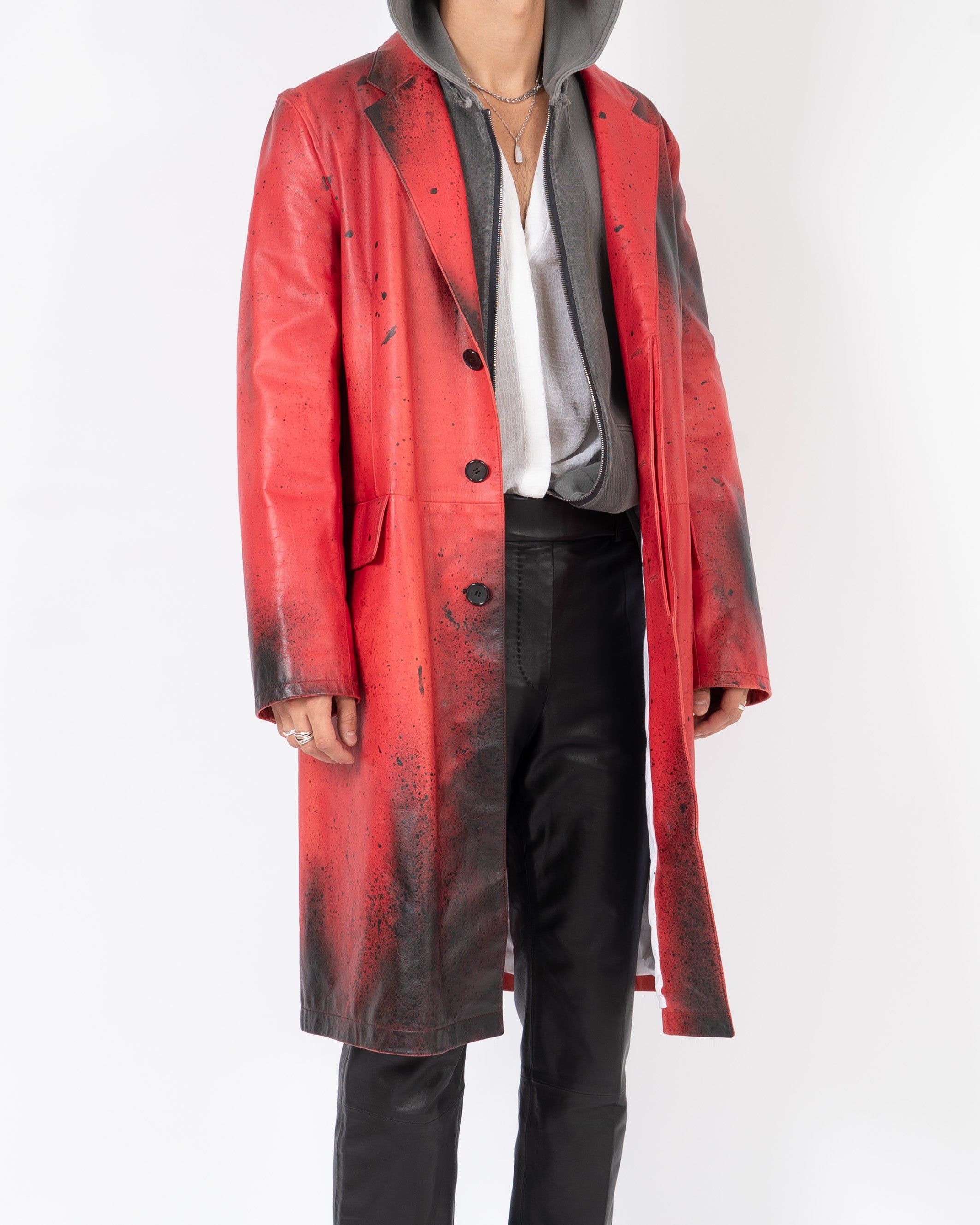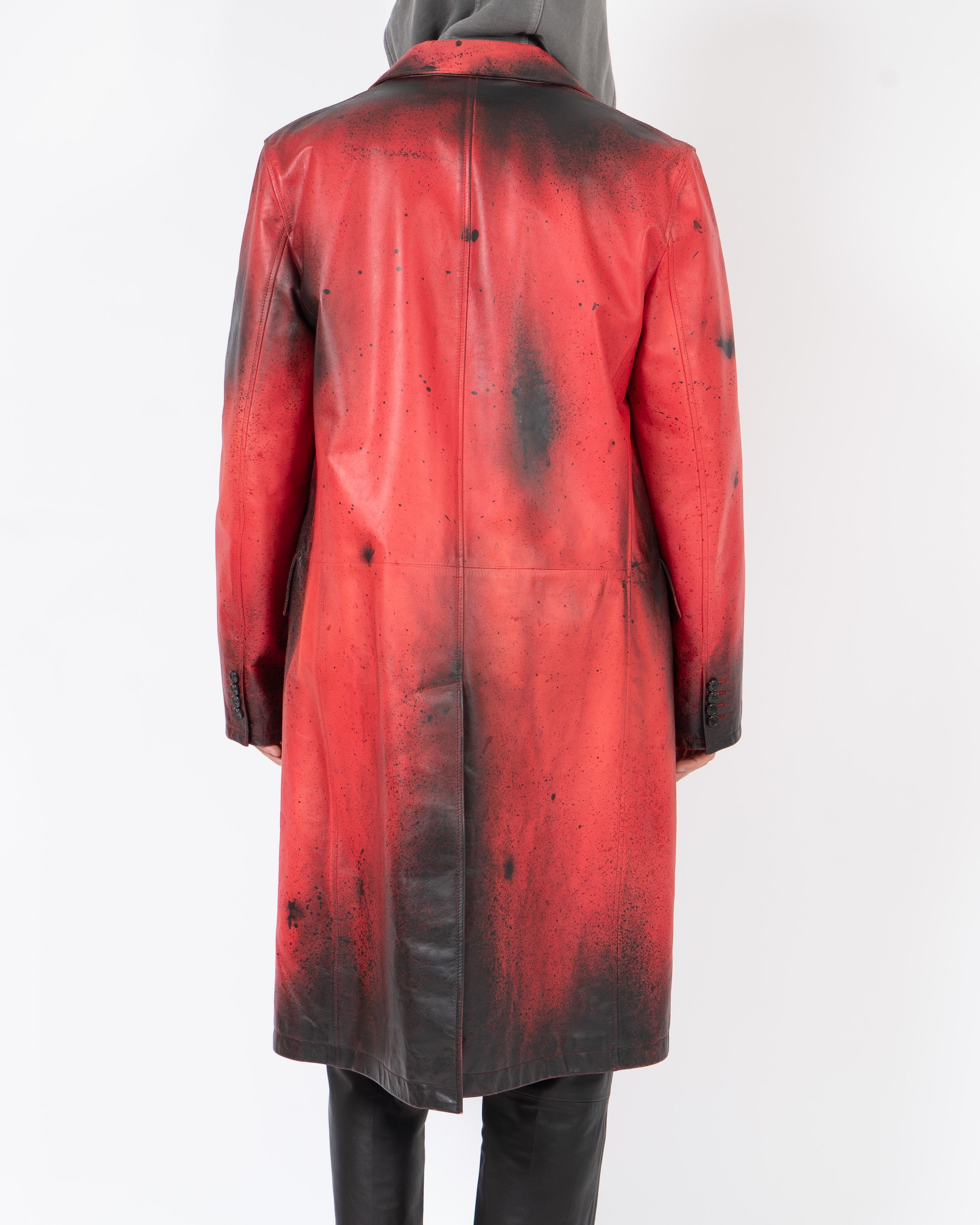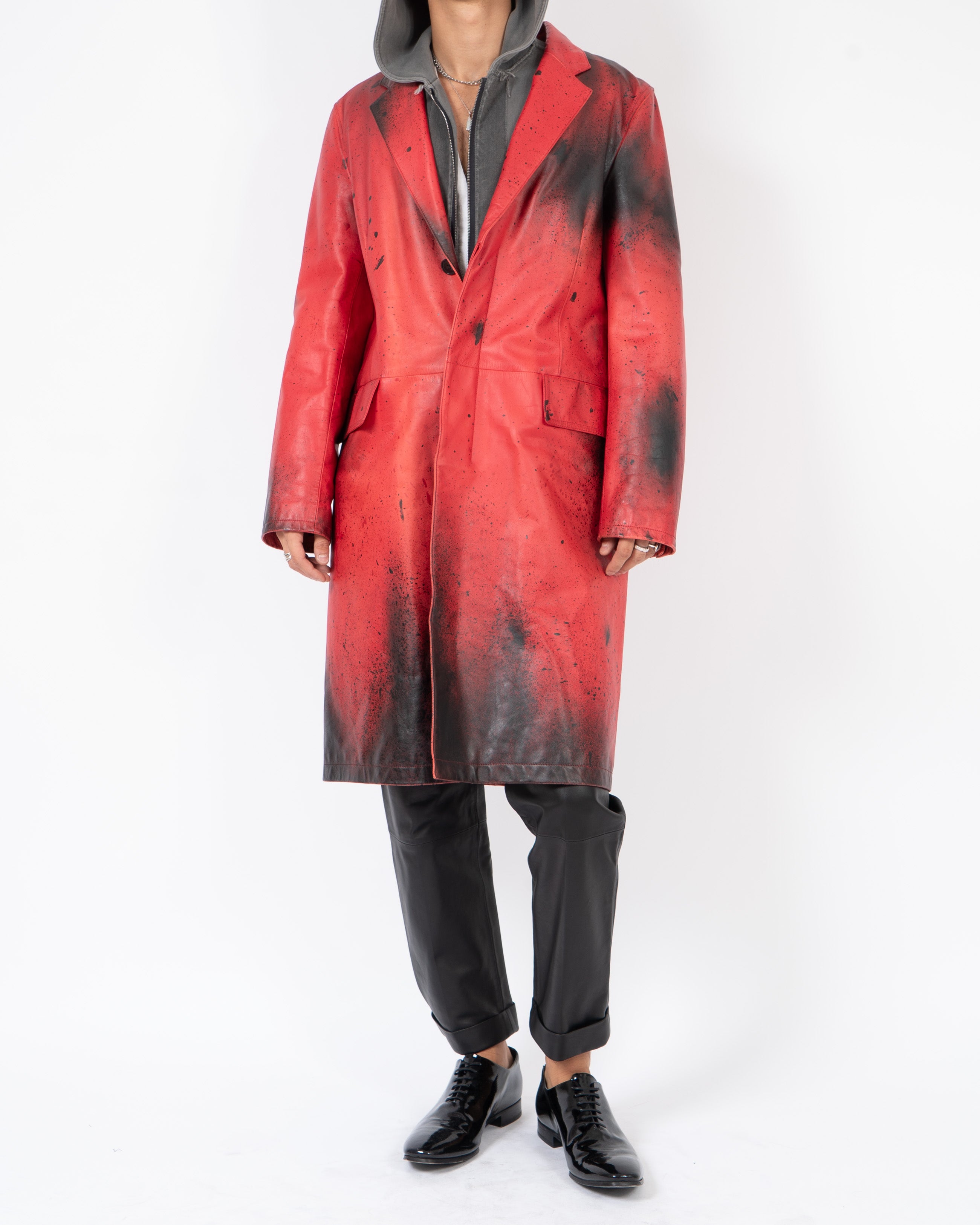 Crafted in Italy from 100% calf leather, the garment was meticulously painted by hand, resulting in a unique finish that captures both artistry and precision. The red colorway, inspired by Patrick Bateman’s blood-splattered coat, remains the rarest iteration of the design, with fewer than ten pieces ever produced. Its oversized silhouette and refined construction showcase the impeccable quality and dramatic aesthetic typical of Raf Simons’ tenure at Calvin Klein.