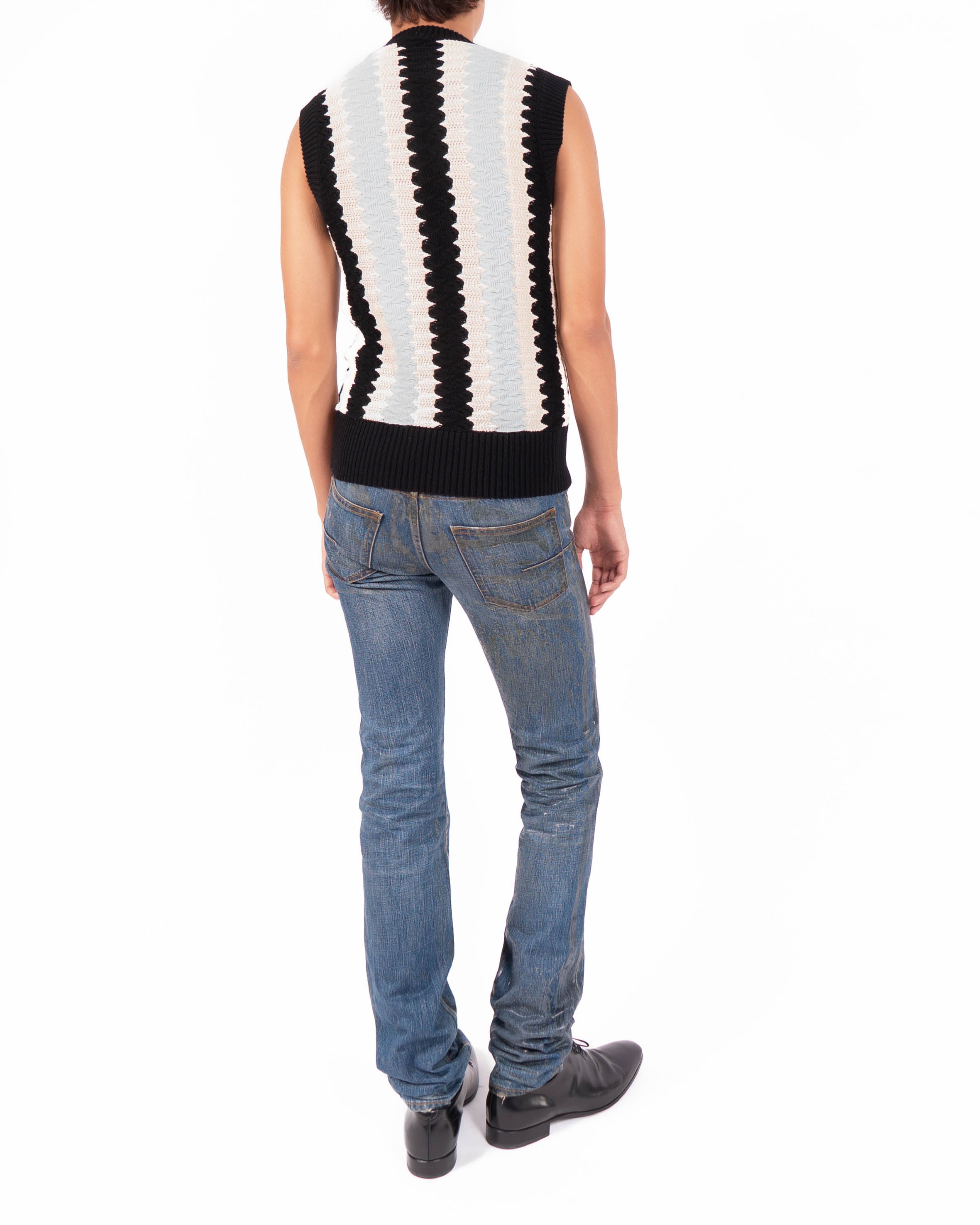 The vest reflects the SS19 collection’s interplay between classic knitwear codes and sharper, modern expressions, translating an everyday garment into something more assertive and visually dynamic.