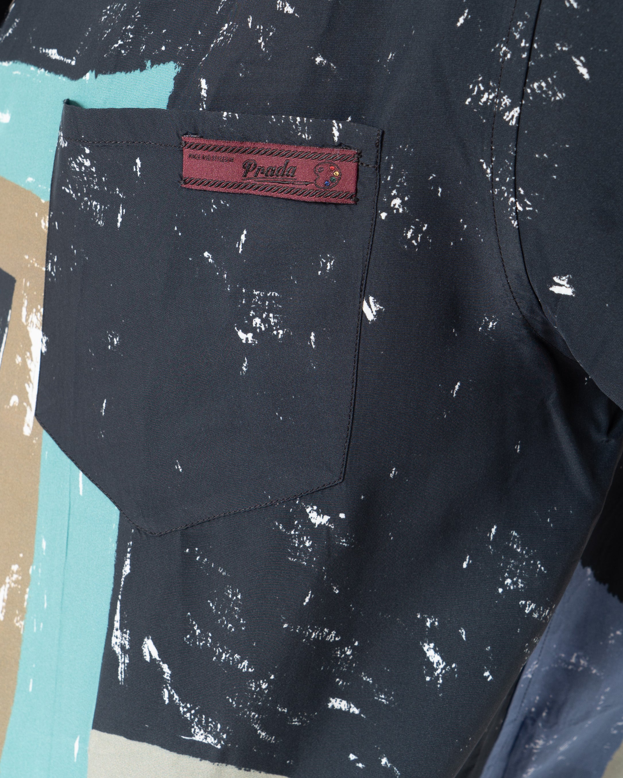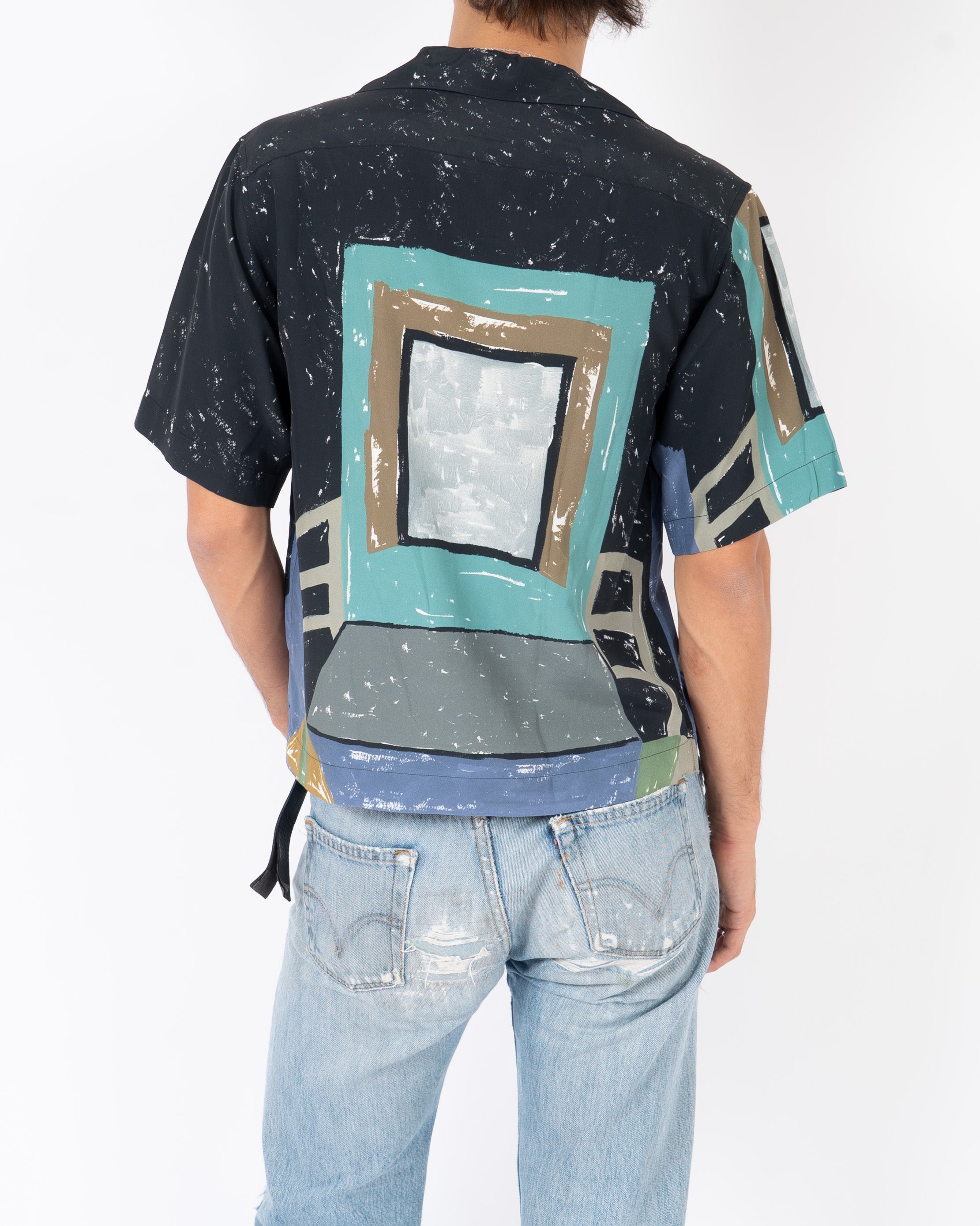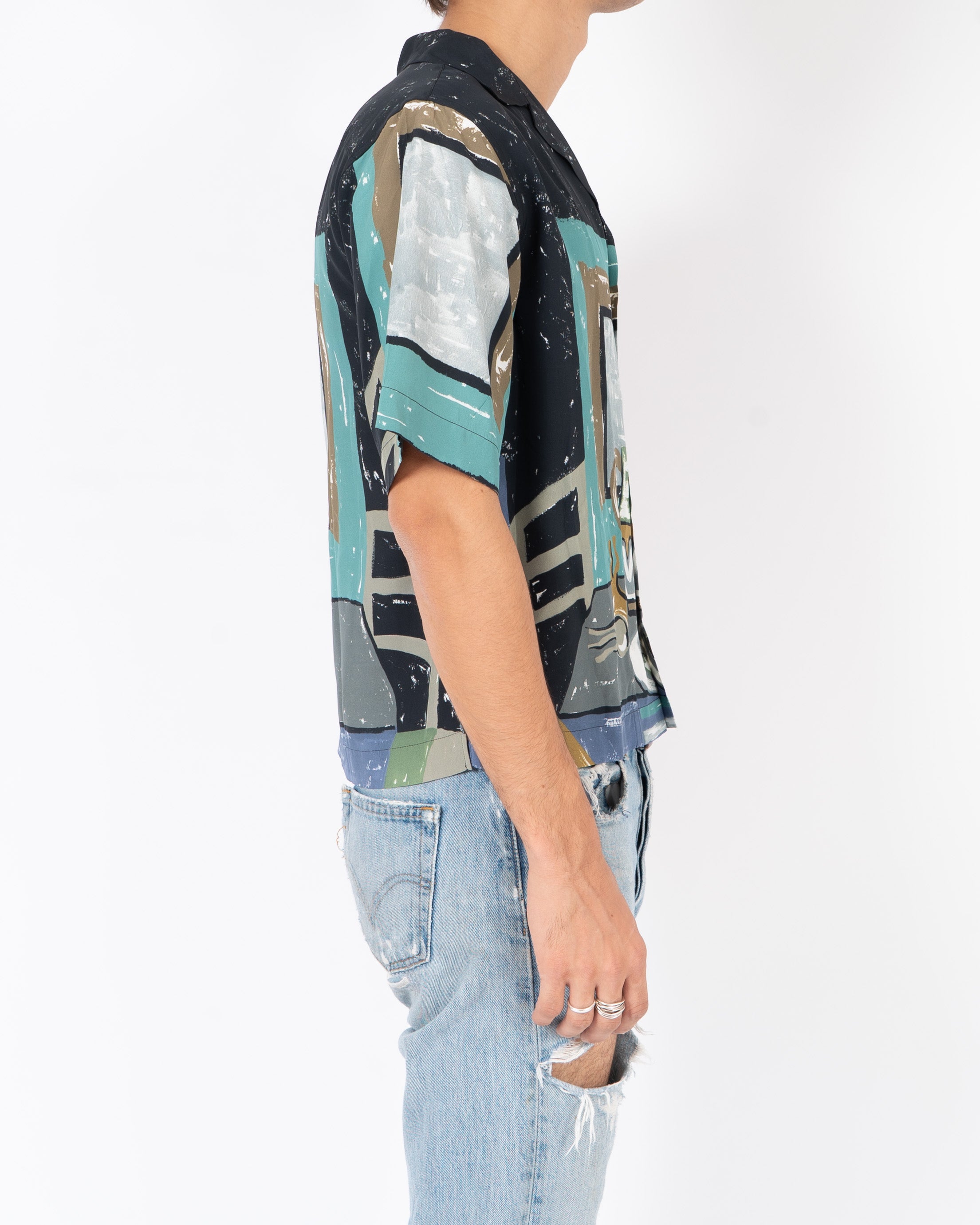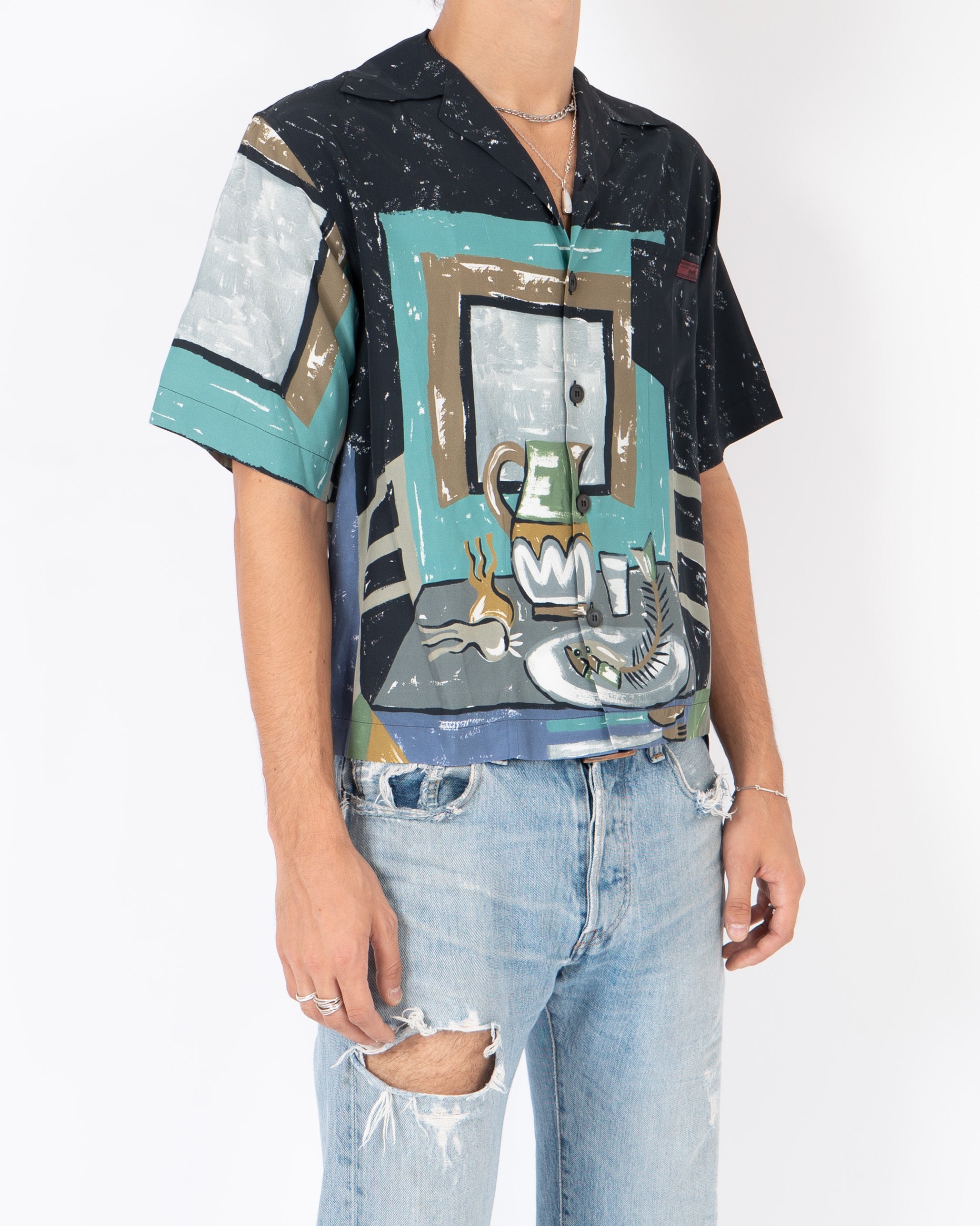 This beautiful Shirt was part of Prada's FW17 collection, featuring a beautiful painting of a dining scenery, with a fishbone on the plate and a large jug, all placed on a table setting in front of a window. The hints of cyan and purple blend perfectly together and create a very pleasing color palette.